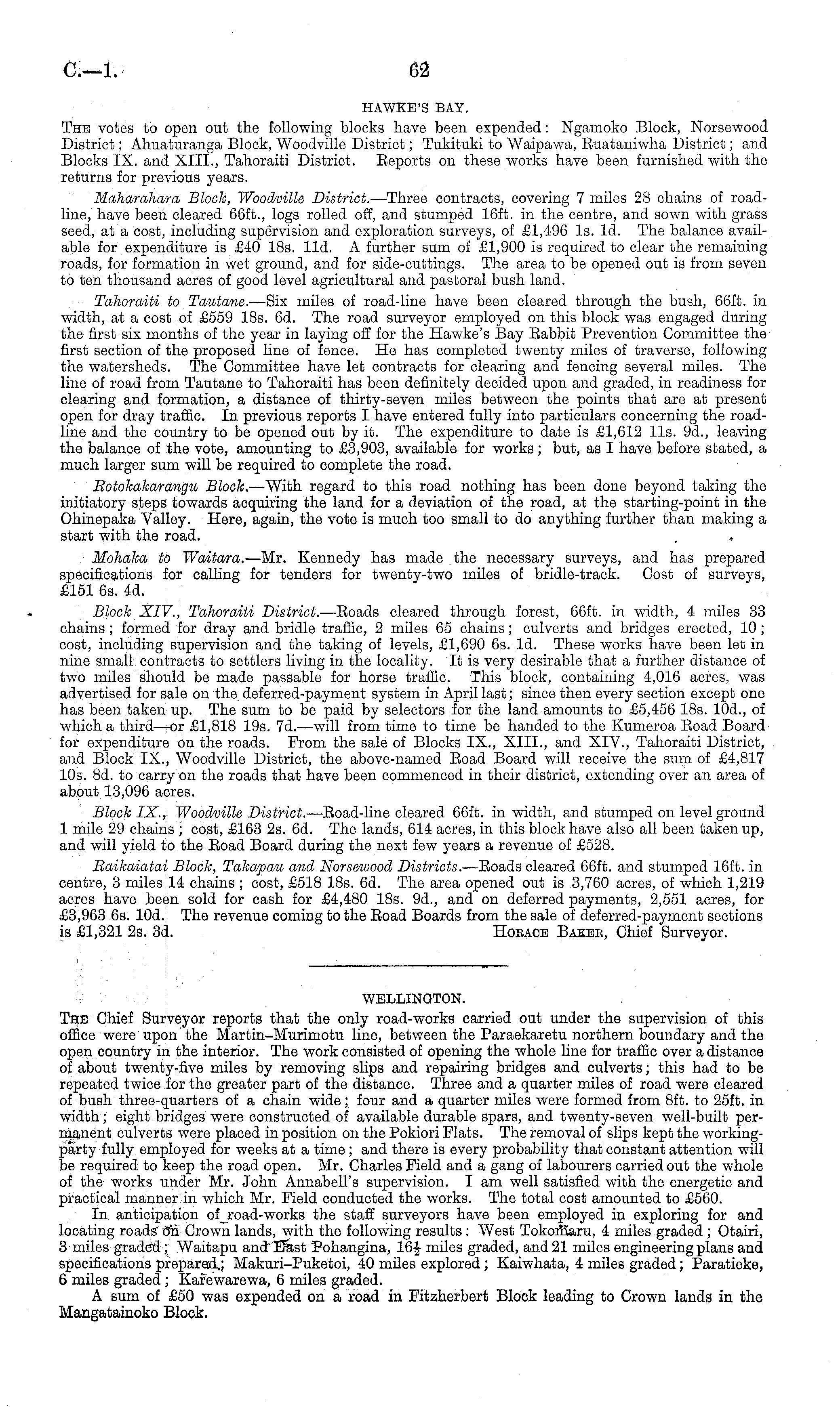 WELLINGTON. The Chief Surveyor reports that the only road-works carried out under the supervision of this office were upon the Martin-Murimotu line, between the Paraekaretu northern boundary and the open country in the interior. The work consisted of opening the whole line for traffic over a distance of about twenty-five miles by removing slips and repairing bridges and culverts; this had to be repeated twice for the greater part of the distance. Three and a quarter miles of road were cleared of bush three-quarters of a chain wide; four and a quarter miles were formed from Bft. to 25ft. in width; eight bridges were constructed of available durable spars, and twenty-seven well-built permanent culverts were placed in position on the Pokiori Plats. The removal of slips kept the workingparty fully employed for weeks at a time; and there is every probability that constant attention will be required to keep the road open. Mr. Charles Field and a gang of labourers carried out the whole of the works under Mr. John Annabell's supervision. I am well satisfied with the energetic and practical manner in which Mr. Field conducted the works. The total cost amounted to £560. In anticipation of road-works the staff surveyors have been employed in exploring for and locating roads oh Crown lands, with the following results : West Tokoriiaru, 4 miles graded ; Otairi, 3 miles graded; Waitapu and Bast Pohangina, 16-J- miles graded, and 21 miles engineering plans and specifications prepared,; Makuri-Puketoi, 40 miles explored ; Kaiwhata, 4 miles graded; Paratieke, 6 miles graded ; Karewarewa, 6 miles graded. A sum of £50 was expended on a road in Fitzherbert Block leading to Crown lands in the Mangatainoko Block.