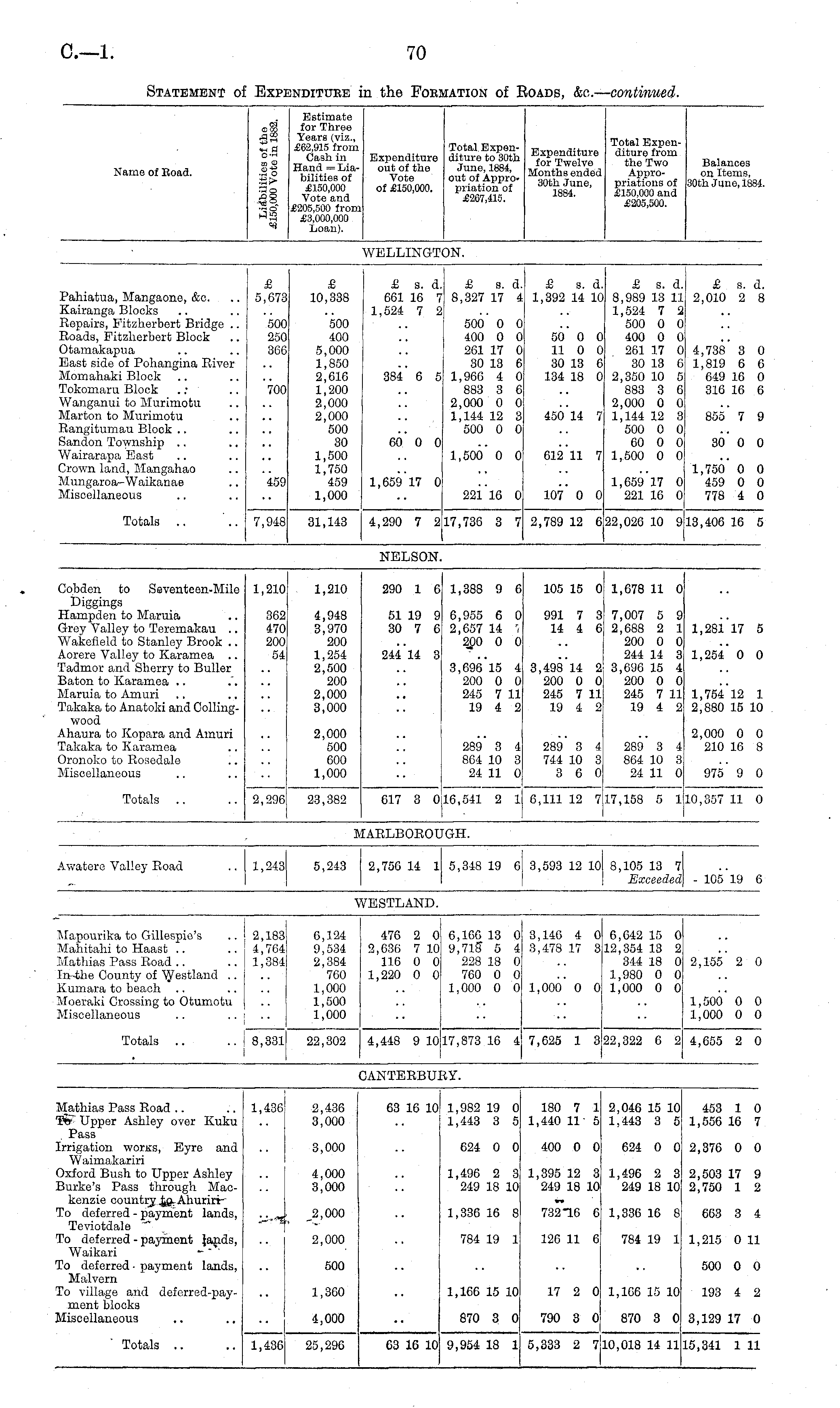 Name of Boad. © CO •SB If =8 Estimate for Three Years (viz., £62,915 from Cash in Hand — Liabilities of £150,000 Vote and £205,500 from £3,000,000 Loan). Expenditure out of the Vote of £150,000. Total Expenditure to 30th June, 1884, out of Appropriation of £207,415. Expenditure for Twelvo Months ended 30th Juno, 1884. Total Expenditure frorn the Two Appropriations of .£150,000 and £205,500. Balances on Items, 30th Juue, 1884. ■ELLINGTIN. Pahiatua, Mangaono, &c. Kairanga Blocks Repairs, Fitzherbert Bridge .. Roada, Fitzherbert Block Otamakapua East side of Pohangina River Momahaki Block Tokomaru Block Wanganui to Murimotu Marton to Murimotu Rangituniau Block .. Sandon Township Wairarapa East Crown land, Mangahao Mungaroa-Waikanae Miscellaneous £ 5,673 500 250 366 £ 10,338 500 400 5,000 1,850 2,616 1,200 2,000 2,000 500 30 1,500 1,750 459 1,000 £ a. d. 661 16 7 1,524 7 2 384' 6 5 £ s. a. 8,327 17 4 500 0 0 400 0 0 261 17 0 30 13 6 1,966 4 0 883 3 6 2,000 0 0 1,144 12 3 500 0 0 £ s. d. 1,392 14 10 50 0 0 11 0 0 30 13 6 134 18 0 £ s. d. 8,989 13 11 1,524 7 2 500 0 0 400 0 0 261 17 0 30 13 6 2,350 10 5 883 3 6 2,000 0 0 1,144 12 3 500 0 0 60 0 0 1,500 0 Oj £ s. d, 2,010 2 g 4,738 3 C 1,819 6 6 649 16 C 316 16 6 700 450 14 7 855 7 9 60 0 0 612'11 7 36' 0 0 1,500' 0 0 1,750 0 0 459 0 0 778 4 0 459 1,65917 0 221 16 0 107' 0 0 1,659 17 0 221 16 0 Totals 7,948 31,143 4,290 7 2 17,736 3 7 2,789 12 6 22,026 10 9 13,406 16 5 NELSON. Cobden to Seventeen-Mile Diggings Hampden to Maruia Grey Valley to Teremakau .. Waiefield to Stanley Brook .. Aorere Valley to Karamea .. Tadmor and Sherry to Buller Baton to Karamea Maruia to Amuri Takaka to Anatoki and Collingwood Ahaura to Kopara and Amuri Takaka to Karamea Oronoko to Rosedale Miscellaneous 1,210 1,210 290 1 6 1,388 9 6 105 15 0 1,678 11 0 362 470 200 54 4,948 3,970 200 1,254 2,500 200 2,000 3,000 51 19 9 30 7 6 6,955 6 0 2,657 14 r: 200 0 0 991 7 3 14 4 6 7,007 5 9 2,688 2 1 200 0 0 244 14 3 3,690 15 4 200 0 0 245 7 11 19 4 2 1,28117 5 244 14 3 •■ 1,254 0 0 .. ! 3,696 15 4 200 0 0 245 7 11 19 4 2 3,498 14 2' 200 0 0 245 7 11 19 4 2 1,78412 1 2,880 15 10 2,000 500 600 1,000 •• 289 3 4 864 10 8 24 11 0 289 3 4 744 10 3 3 6 0 289 3 4 864 10 3 24 11 0 2,000 0 0 210 16 8 975' 9 0 Totals 2,296; 23,382 617 3 01 116,541 2 lj 0,111 12 7 J17.158 5 1 10,357 11 0 MARLBOEOUGH. Awatere Valley Road .. 1,243 I 5,243 2,750 14 1 5,3-18 19 6! 3,593 12 10 8,105 13 7 Exceeded - 105 19 6 WESTLAND. Mapourika to Gillespie's .. 2,183 Mahitahi to Haast .. .. 4,764 Mathias Pass Road .. .. 1,384 In -the County of Westland .. Kumara to beach Moeraki Crossing to Otumotu Miscellaneous .. .. I 6,124 9,534 2,384 760 1,000 1,500 1,000 476 2 0 2,636 7 10 116 0 0 1,220 0 0 6,160_ 13 0 9,718" 5 4 228 18 0 760 0 0 1,000 0 0 3,146 4 0 3,478 17 3 1,000 0 0 6,642 15 0 12,354 13 2 344 18 0 1,980 0 0 1,000 0 0 2,155 2 0 1,506' 0 0 1,000 0 0 Totals .. I 8,331 22,302 4,448 9 10 17,873 16 4 7,025 1 3 22,322 6 2 4,655 2 0 CANTERBURY. Mathias Pass Road To Upper Ashley over Kuku . Pass Irrigation worj£s, Eyre and Waimakariri Oxford Bush to Upper Ashley Burke's Pass through Mackenzie country to Ahuriri To deferred - payment lands, Teviotdale To deferred - payment lands, Waikari - * To deferred ■ payment lands, Malvern To village and deferred-pay-ment blocks Miscellaneous 1,436! 2,436 3,000 3,000 63 16 10 1,982 19 0 1,443 3 5 180 7 1 1,440 11 5 2,046 15 10 1,443 3 5 453 1 0 1,556 16 7 624 0 0 400 0 0 624 0 0 2,376 0 0 4,000 3,000 1,496 2 3 249 18 10 1,395 12 3 249 18 10 1,496 2 3 249 18 10 2,503 17 9 2,750 1 2 :,^. _2,000 1,336 16 8 732'16 6 1,336 16 8 6G3 3 4 I 2,000 784 19 1 126 11 G 784 19 1 1,215 0 11 500 500 0 0 1,360 1,166 15 10 17 2 0 1,166 15 10 193 4 2 4,000 870 3 0 790 3 0 870 3 0 3,129 17 0 Totals .. 63 16 10 9,954 18 1 5,333 2 7 1,436 25,296 10,018 14 11 15,341 1 11