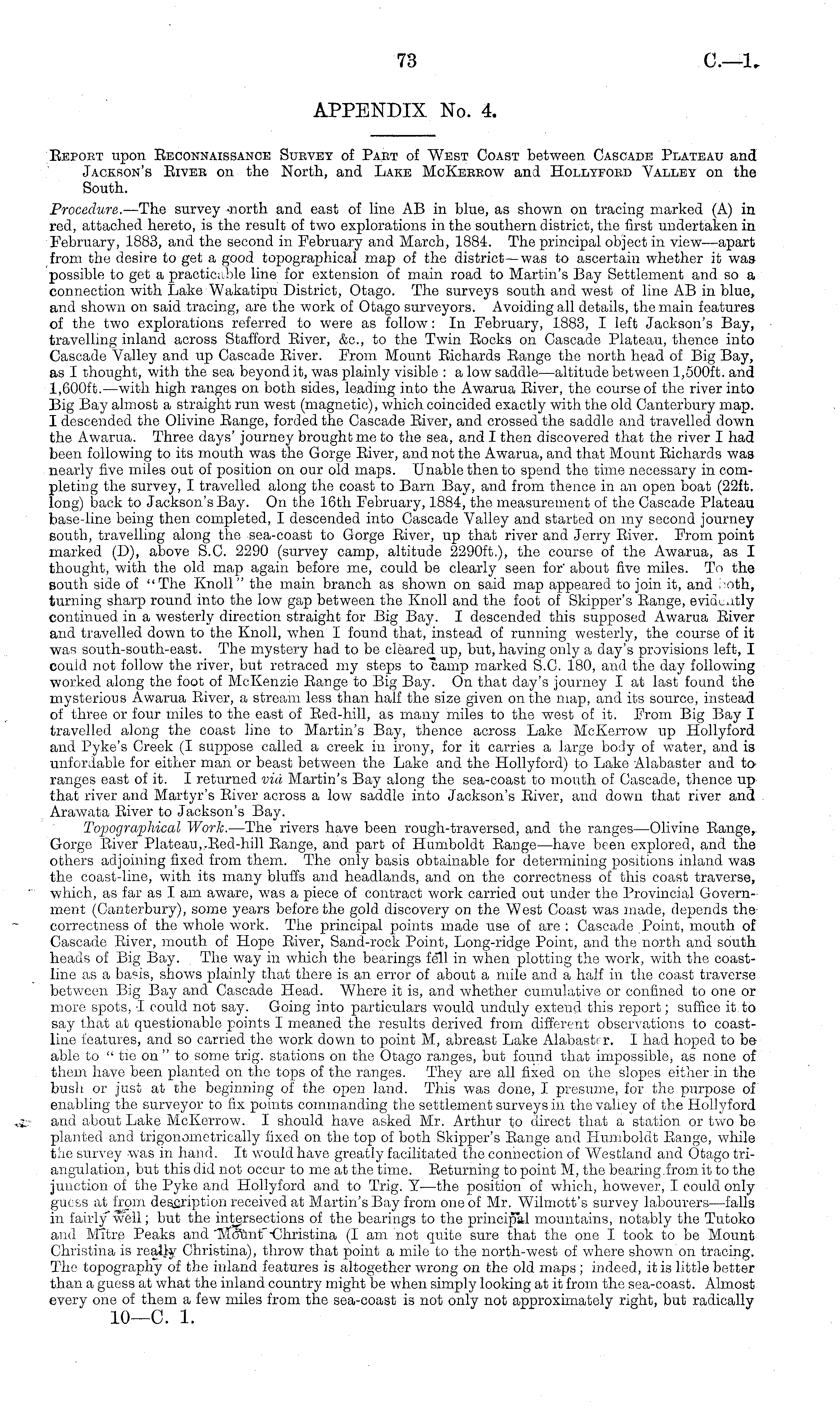 Eepoet upon Reconnaissance Suevey of Paet of West Coast between Cascade Plateau and Jackson's Eivee on the North, and Lake McKeeeow and Hollyfoed Valley on the South. Procedure. —The survey north and east of line AB in blue, as shown on tracing marked (A) in red, attached hereto, is the result of two explorations in the southern district, the first undertaken in February, 1883, and the second in February and March, 1884. The principal object in view—apart from the desire to get a good topographical map of the district—was to ascertain whether it was possible to get a practicable line for extension of main road to Martin's Bay Settlement and so a connection with Lake Wakatipu District, Otago. The surveys south and west of line AB in blue, and shown on said tracing, are the work of Otago surveyors. Avoiding all details, the main features of the two explorations referred to were as follow: In February, 1883, I left Jackson's Bay, travelling inland across Stafford Biver, &c, to the Twin Eocks on Cascade Plateau, thence into Cascade Valley and up Cascade Eiver. From Mount Richards Range the north head of Big Bay, as I thought, with the sea beyond it, was plainly visible : a low saddle—altitude between 1,500ft. and 1,600ft. —with high ranges on both sides, leading into the Awarua Eiver, the course of the river into Big Bay almost a straight run west (magnetic), which coincided exactly with the old Canterbury map. I descended the Olivine Eange, forded the Cascade Eiver, and crossed the saddle and travelled down the Awarua. Three days' journey brought me to the sea, and I then discovered that the river I had been following to its mouth was the Gorge Eiver, and not the Awarua, and that Mount Eichards was nearly five miles out of position on our old maps. Unable then to spend the time necessary in completing the survey, I travelled along the coast to Barn Bay, and from thence in an open boat (22ft. long) back to Jackson's Bay. On the 16th February, 1884, the measurement of the Cascade Plateau base-line being then completed, I descended into Cascade Valley and started on my second journey south, travelling along the sea-coast to Gorge Eiver, up that river and Jerry Eiver. From point marked (D), above S.C. 2290 (survey camp, altitude 2290ft.), the course of the Awarua, as I thought, with the old map again before me, could be clearly seen for about five miles. To the south side of "The Knoll" the main branch as shown on said map appeared to join it, and both, turning sharp round into the low gap between the Knoll and the foot of Skipper's Eange, evidently continued in a westerly direction straight for Big Bay. I descended this supposed Awarua Eiver and travelled down to the Knoll, when I found that, instead of running westerly, the course of it was south-south-east. The mystery had to be cleared up, but, having only a day's provisions left, I could not follow the river, but retraced my steps to camp marked S.C. 180, and the day following worked along the foot of McKenzie Eange to Big Bay. On that day's journey I at last found the mysterious Awarua Eiver, a stream less than half the size given on the map, and its source, instead of three or four miles to the east of Red-hill, as many miles to the west of it. From Big Bay I travelled along the coast line to Martin's Bay, thence across Lake McKerrow up Hollyford and Pyke's Creek (I suppose called a creek in irony, for it carries a large body of water, and is unfordable for either man or beast between the Lake and the Hollyford) to Lake Alabaster and to ranges east of it. I returned via, Martin's Bay along the sea-coast to mouth of Cascade, thence up that river and Martyr's Eiver across a low saddle into Jackson's Eiver, and down that river and Arawata Eiver to Jackson's Bay. Topographical Work. —The rivers have been rough-traversed, and the ranges —Olivine Eange, Gorge Eiver Plateau, -Red-hill Eange, and part of Humboldt Range —have been explored, and the others adjoining fixed from them. The only basis obtainable for determining positions inland was the coast-line, with its many bluffs and headlands, and on the correctness of this coast traverse, which, as far as I am aware, was a piece of contract work carried out under the Provincial Government (Canterbury), some years before the gold discovery on the West Coast was made, depends the correctness of the whole work. The principal points made use of are : Cascade Point, mouth of Cascade Eiver, mouth of Hope River, Sand-rock Point, Long-ridge Point, and the north and south heads of Big Bay. The way in which the bearings fell in when plotting the work, with the coastline as a basis, shows plainly that there is an error of about a mile and a half in the coast traverse between Big Bay and Cascade Head. Where it is, and whether cumulative or confined to one or more spots, -I could not say. Going into particulars would unduly extend this report; suffice it to say that at questionable points I meaned the results derived from different observations to coastline features, and so earned the work down to point M, abreast Lake Alabaster. I had hoped to be able to " tie on " to some trig, stations on the Otago ranges, but found that impossible, as none of them have been planted on the tops of the ranges. They are all fixed on the slopes either in the busli or just at the beginning of the open land. This was done, I presume, for the purpose of enabling the surveyor to fix points commanding the settlement surveys in the valley of the Hollyford and about Lake McKerrow. I should have asked Mr. Arthur to direct that a station or two be planted and trigonornctrically fixed on the top of both Skipper's Range and Humboldt Eange, while the survey was in hand. It would have greatly facilitated the connection of Westland and Otago triangulation, but this did not occur to me at the time. Returning to point M, the bearing.from, it to the junction of the Pyke and Hollyford and to Trig. Y—the position of which, h