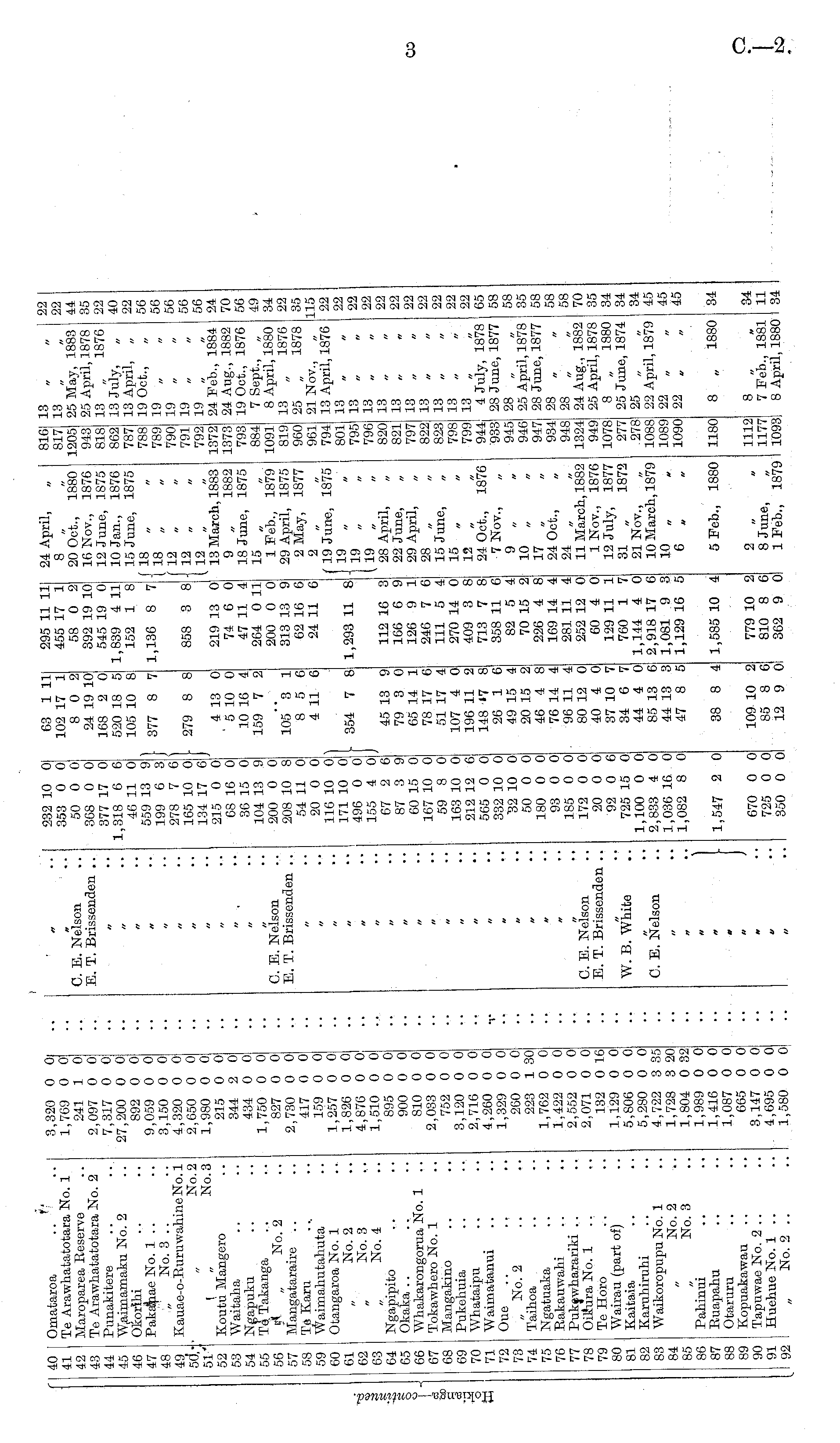 bo o 40 41 42 43 44 45 46 47 48 49 50*,' 51' 52 53 54 55 56 57 58 59 60 61 62 63 64 05 66 67 68 69 70 71 72 73 74 75 76 77 78 79 80 81 82 83 84 85 86 87 88 89 90 91 92 Omataroa Te Arawhatatotara No. 1 Maroparea Reserve Te Arawhatatotara No. 2 Punakitere Waimamaku No. 2 Okorilii Pakanae No. 1 .. * No. 3 .. Kauae-o-BuruwahineNo. 1 No. 2 I „ No. 3 Koutu Mangero Waitaha Ngapuku Te Takanga I „ No. 2 Mangataraire .. Te Karu Waimahutahuta Otangaroa No. 1 No. 2 No. 3 No. 4 Ngapipito Okaka Whakarongorua No. 1 .. Tokawhero No. 1 Mangakino Pukehuia Whataipu Waimatanui Oue .. „ No. 2 Taihoa Ngatuaka Bakauwahi Puk^wharariki .. Oiltura No. 1 .. Te Horo Wairau (part of) Kaitaia Karuhiruhi Waikoropupu No. 1 No. 2 No. 3 Pahinui Buapahu Otaruru Kopuakawau Tapuwae No. 2 .. Huehue No. 1 .. No. 2 .. 3,320 0 0 1,769 0 0 241 1 0 2,097 0 0 7,317 0 0 27,200 0 0 892 0 0 9,059 0 0 3,150 0 0 4,320 0 0 2,650 0 0 1,980 0 0 215 0 0 344 2 0 434 0 0 1,750 0 0 827 0 0 2,730 0 0 417 0 0 159 0 0 1,257 0 0 1,826 0 0 4,870 0 0 1,510 0 0 895 0 0 900 0 0 810 0 0 2,033 0 0 752 0 0 3,120 0 0 2,716 0 0 4,260 0 0 1,329 0 0 260 0 0 223 1 30 1,762 0 0 1,422 0 0 2,552 0 0 2,071 0 0 132 0 16 1,129 0 0 5,806 0 0 5,280 0 0 4,722 3 35 1,728 3 20 1,804 0 32 1,989 0 0 1,416 0 0 1,087 0 0 665 0 0 3,147 0 0 4,695 0 0 1,580 0 0 . " C. E. Nelson E. T. Brissenden .. • G. E. Nelson E. T. Brissenden .. •■! 232 10 0 353 0 0 50 0 0 368 0 0 377 17 0 1,318 6 6 46 11 0 559 13 9 1 199 0 3 } 278 7 6) 165 10 0 \ 134 17 6 J 215 0 0 68 16 0 36 15 0 104 13 9 200 0 0 208 10 8 54 11 0 20 0 0 116 10 0 ) 171 10 0 | 496 0 0 155 4 0 J 67 2 6 87 3 9 60 15 0 107 10 0 59 8 0 163 10 0 212 12 6 565 0 0 332 10 0 32 10 0 50 0 0 180 0 0 93 0 0 185 0 0 172 0 0 20 0 0 92 0 6 725 15 0 1,100 0 0 2,833 4 0 1,036 16 0 1,082 8 0 63 1 11 102 17 1 8 0 2 24 19 10 168 2 0 520 18 5 : 105 10 8 | 377 8 7 I 279 8 8 4 13 0 5 10 0 10 16 4 159 7 2 105 3 1 8 5 6 4 11 6 - 354 7 8 45 13 9 79 3 0 i 65 14 1 i 78 17 6 I 51 17 4 ) 107 4 0 1 196 11 2 ) 148 '7 8 ) 26 1 6 ) 49 15 4 ) 20 15 2 ) 46 4 8 3 76 14 4 3 96 11 4 3 80 12 0 ) 40 4 0 3 37 10 7 ) 34 6 7 3 44 4 0 3 85 13 6 3 44 13 3 3 47 8 5 295 11 11 455 17 1 58 0 2 392 19 10 545 19 0 1,839 4 11 152 1 8 f 1,136 8 7 | i 858 3 8 j 219 13 0 74 6 0 47 11 4 264 0 11 200 0 0 313 13 9 62 16 6 24 11 6 1,293 11 8 - 112 16 3 166 6 9 126 9 1 246 7 6 111 5 4 270 14 0 409 3 8 713 7 8 358 11 6 82 5 4 70 15 2 226 4 8 169 14 4 281 11 4 252 12 0 60 4 0 129 11 1 760 1 7 1,144 4 0 2,918 17 6 1,081 9 3 1,129 16 5 24 April, 8 „ 20 Oct., 1880 16 Nov., 1876 12 June, 1875 10 Jan., 1876 15 June, 1875 f 18 „ 118 . (12 . 12 „ I 12 . 13 March, 1883 9 „ 1882 18 June, 1875 15 „ 1 Feb., 1879 29 April, 1875 2 May, 1877 2 „ { 19 June, 1875 19 . 119 „ I 19 . 28 April, 22 June, 29 April, 28 „ 15 June, „ 1 15 „ i 12 „ I 24 Oct., 1876 1 7 Nov., 9 „ 1 10 „ i 17 „ t 24 Oct., . 24 „ ) 11 March, 1882 3 1 Nov., 1876 t 12 July, 1877 F 31 „ 1872 3 21 Nov., 5 10 March, 1879 i 10 » 5 6 „ 816 1 817 ] 1205 '. 943 '. 818 : 862 : 787 : 788 : 789 : 790 : 791 792 1372 1373 793 884 1091 819 960 961 794 801 795 796 820 821 797 822 823 798 799 944 933 945 946 947 934 948 1324 949 1078 277 .278 1088 1089 1090 13 „ 13 „ 25 May, 1883 25 April, 1878 13 „ 1876 13 July, „ 13 April, „ 19 Oct., 19 „ 19 „ 19 ,, 19 „ 24 Feb., 1884 24 Aug., 1882 19 Oct., 1876 7 Sept., „ 8 April, 1880 13 „ 1876 25 , 1878 21 Nov., „ 13 April, 1876 13 „ 13 „ 13 „ 13 „ 13 „ 13 „ 13 „ 13 „ 13 „ 13 „ 4 July, 1878 28 June, 1877 28 „ 25 April, 1878 28 June, 1877 28 „ 28 „ 24 Aug., 1882 25 April, 1878 8 „ 1880 25 June, 1874 i 25 „ i 22 April, 1879 i 22 „ l 22 „ 22 22 44 35 22 40 22 56 56 56 56 56 24 70 56 49 34 22 35 115 22 22 22 22 22 22 22 22 22 22 22 65 58 58 35 58 58 58 70 35 34 34 34 45 45 45 C. E. Nelson E. T. Brissenden .. W. B. White '.'. C. E. Nelson ! 1 1,547 2 0 3 38 8 4 1,585 10 4 1 5 Feb., 1880 1180 ) 8 » 18S0 34 670 0 0 725 0 0 350 0 01 0 109 10 2 0 85 8 6 0 12 9 0 779 10 2 i 810 8 6 i 362 9 01 2 2 „ 3 8 June, „ Dl 1 Feb., 1879 1112 1177 1093 ! 8 „ * 7 Feb., 1881 ! 8 April, 1880 34 11 34 I.