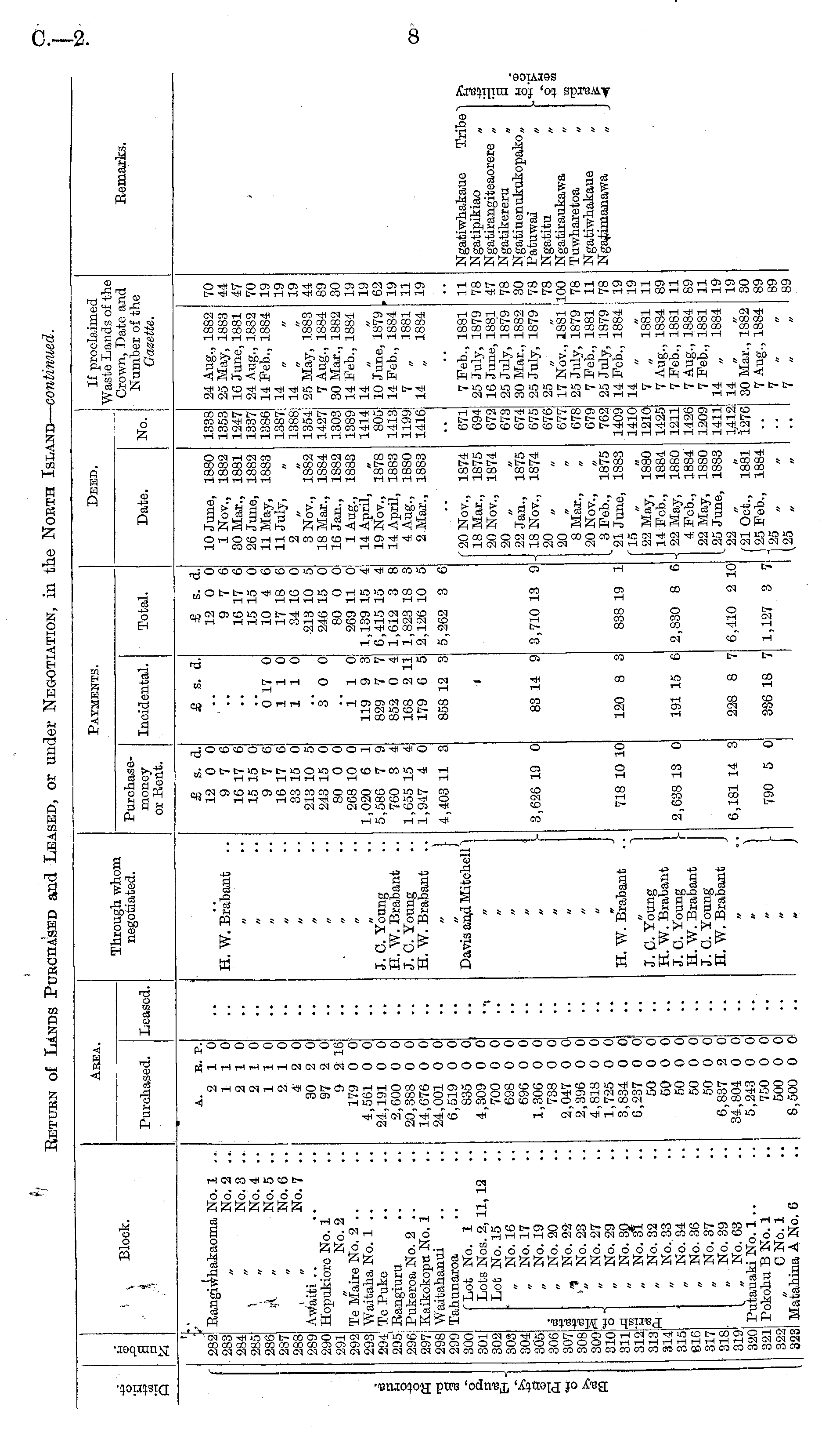 Area. Payments. Deed. If proclaimet Waste Lands of Crown, Date a Number of ti Gazette. M CD 3 the nd S Block. Remarks. negotiated. Purchasemoney or Bent. .e Purchased. Leased. Incidental. Total. Date. No. X £ s. d. 12 0 0 9 7 6 16 17 6 15 15 0 10 4 6 17 18 6 34 16 0 213 10 5 246 15 0 80 0 0 269 11 0 1,139 15 4 6,415 15 4 1,612 3 8 1,823 18 3 2,126 10 5 282 : 283 284 285 286 287 288 289 290 291 292 293 294 295 296 297 298 299j 3001 301 302 303 304 305 306 307" 308, 309' 310' 311312* 313 ( 314 315 616 317 318. 319 320 321 322 323 Bangiwhakaoma No. 1 ... No. 2 ... No. 3 .. No. 4 .. I „ No. 5 .. No. 6 No. 7 Awaiti Hopukioro No. 1 No. 2 Te Maire No. 2 .. Waitaha No. 1 .. Te Puke Bangiuru Pukeroa No. 2 .. Kaikokopu No, 1 Waitahanui Tahunaroa (Lot No. 1 Lots Nos. 2, 11, 12 .. Lot No. 15 ' „ No. 16 „ No. 17 „ No. 19 d „ No. 20 % „ No. 22 3 „* No. 23 3j „ No. 27 o 1 „ No. 29 A „ No. 30 ■a : No.si jg , No. 32 „ No. 33 , No. 84 „ No. 36 „ No. 37 : „ No. 39 I I , No. 63 ) Putauaki No. 1 .. . Pokohu B No. 1 i C No. 1 i Matahina A No. 6 A. E. P. 2 10 110 2 10 2 10 110 2 10 4 2 0 30 2 0 97 2 0 9 2 16 179 0 0 4,561 0 0 24,191 0 0 2,600 0 0 20,388 0 0 14,676 0 0 24,001 0 0 6,519 0 0 835 0 0 4,309 0 0 700 0 0 698 0 0 696 0 0 1,306 0 0 738 0 0 2,047 0 0 2,396 0 0 4,818 0 0 1,725 0 0 3,834 0 0 6,237 0 0 50 0 0 50 0 0 50 0 0 50 0 0 50 0 0 6,837 2 0 34,804 0 0 5,243 0 0 750 0 0 500 0 0 8,500 0 0 H. W. Brabant .. £ s. d. 12 0 0 9 7 6 16 17 6 15 15 0 9 7 6 16 17 6 33 15 0 213 10 5 243 15 0 80 0 0 268 10 0 1,020 6 1 5,586 7 9 760 3 4 1,655 15 4 1,947 4 0 £ s. d. 0 17 0 110 110 3* 0 0 10 June, 1880 INov., 1882 30 Mar., 1881 26 June, 1882 11 May, 1883 11 July, „ 2 „ 3 Nov., 1882 18 Mar., 1884 16 Jan., 1882 1 Aug., 1883 14 April, „ 19 Nov., 1878 14 April, 1883 4 Aug., 1880 2 Mar., 1883 1338 1353 1247 1337 1386 1387 1388 1354 1427 1303 1389 1414 805 1413 1199 1416 24 Aug., 1882 25 May, 1883 16 June, 1881 24 Aug., 1882 14 Feb., 1884 14 „ 14 „ 25 May, 1883 7 Aug., 1884 30 Mar., 1882 14 Feb., 1884 14 „ 10 June, 1879 14 Feb., 1884 7 „ 1881 14 , 1884 70 44 47 70 19 19 19 44 89 30 19 19 .02 19 11 19 o o 0 CD O J. C. Young H. W. Brabant .. J. C. Young H. W. Brabant .. Davis and Mitchell") i 110 119 9 3 829 7 7 852 0 4 168 2 11 179 6 5 4,403 11 3 858 12 3 i 5,262 3 6 (20 Nov., 1874 18 Mar., 1875 20 Nov., 1874 20 „ 22 Jan., 1875 18 Nov., 1874 20 „ 20 „ 8 Mar., 20 Nov., 3 Feb., 1875 21 June, 1883 f 15 „ 22 May, 1880 14 Feb., 1884 22 May, 1880 4 Feb., 1884 22 May, 1880 25 June, 1883 22 (21 Oct., 1881 25 Feb., 1884 " 25 „ 25 „ 671 694 672 673 674 675 676 677 678 679 762 1409 1410 1210 1425 1211 1426 1209 1411 1,412 1276 7 Feb., 1881 25 July, 1879 16 June, 1881 25 July, 1879 30 Mar., 1882 25 July, 1879 25 17 Nov., 1881 25 July, 1879 7 Feb., 1881 25 July, 1879 14 Feb., 1884 14 „ 7 „ 1881 7 Aug., 1884 7 Feb., 1881 7 Aug., 1884 7 Feb., 1881 14 „ 1884 14 „ 30 Mar., 1882 7 Aug., 1884 7 „ 7 „ 11 78 47 78 30 78 78 100 78 11 78 19 19 11 89 11 89 11 19 19 30 89 89 89 Ngatiwhakaue Tribe Ngatipikiao „ Ngatirangiteaorere „ Ngatikereru „ Ngatiuenukukopako „ Patuwai „ Ngatitu „ Ngatiraukawa „ Tuwharetoa „ Ngatiwhakaue „ Ngatimanawa „ ■ i_, CD +*> xn. H " - L 3,626 19 0 83 14 9 3,710 13 9 \ c3 ' ' I J H. W. Brabant .. 120 8 3 838 19 1 718 10 10 J. G. Young H. W. Brabant J. C. Young H. W. Brabant J. C. Young H. W. Brabant 2,638 13 0 191 15 6 2,830 8 6 6,181 14 3 228 8 7 6,410 2 10 i j 790 5 0 386 18 7 1,127 3 7 .. !