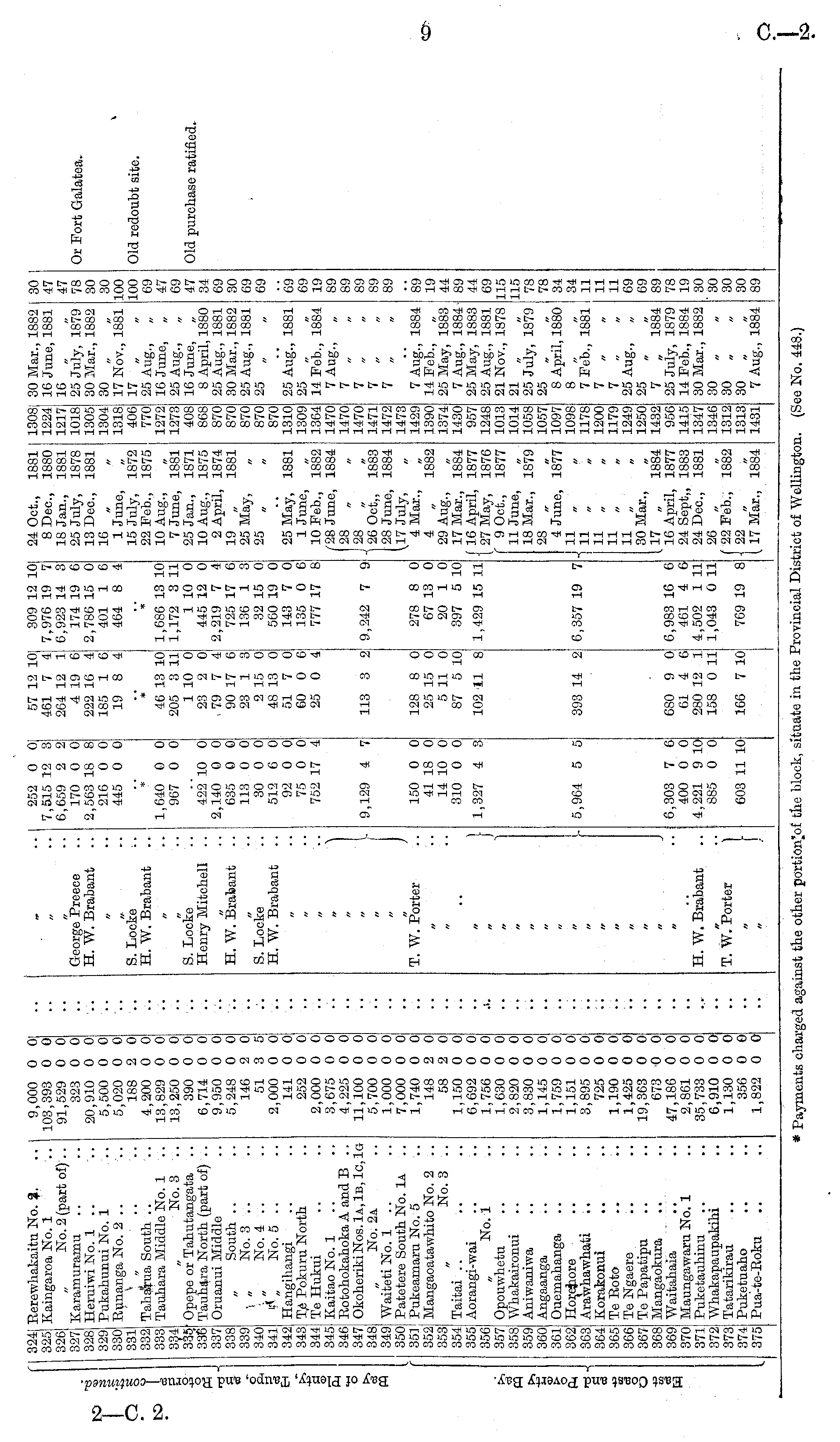 **3 to a a o o a s a E-i CD °o 324 325 326 327 328 329 330 331 332 333 334 335 336 337 338 339 340 341 342 343 344 345 346 347 348 349 350 351 352 353 354 355 356 357 358 359 360 361 362 363 364 365 366 367 368 369 370 371 372 373 374 375 Berewhakaitu No. 2 Kaingaroa No. 1 No. 2 (part of).. Kararnuramu Heruiwi No. 1 .. Pukahunui No. 1 Runanga No. 2 .. Taharua South Tauhara Middle No. 1 .. No. 3 .. Opepe or Tahutangata Taunara North (part of) .. Oruanui Middle South .. . „ No. 3 .. No. 4 .. f „ No. 5 .. Hangihangi Te Pokuru North Te Hukui Kaitao No. 1 RotohokahokaA and B .. OkoherikiNos. 1a, 1b, lc, 1g No. 2a Waiteti No. 1 .. Patetere South No. 1a .. Pukeamaru No. 5 Mangaoatawhito No. 2 .. No. 3 9,000 0 0 103,393 0 0 91,529 0 0 323 0 0 20,910 0 0 5,500 0 0 5,020 0 0 188 2 0 4,200 0 0 13,829 0 0 13,250 0 0 390 0 0 6,714 0 0 9,950 0 0 5,248 0 0 146 2 0 51 3 5 2,000 0 0 141 0 0 252 0 0 2,000 0 0 3,675 0 0 4,225 0 0 11,100 0 0 5,700 0 0 1,000 0 0 7,000 0 0 1,740 0 0 148 2 0 58 2 0 1.150 0 0 6,692 0 0 1,756 0 0 1,630 0 0 2,820 0 0 3,830 0 0 1,145 0 0 1,759 0 0 1.151 0 0 3,895 0 0 725 0 0 1,190 0 0 1,425 0 0 19,363 0 0 073 0 0 47,186 0 0 2,861 0 0 35,733 0 0 6,910 0 O 1,130 0 0 356 0 0 1,822 0 0 George Preece H. W. Brabant .. S. Locke ■.. H. W. Brabant .. S. Locke Henry Mitchell .. H. W. Brabant '. '. 252 0 0 7,515 12 3 6,659 2 2 170 0 0 2,563 18 8 216 0 0 445 0 0 1,640 0 0 967 0 0 422 10 0 2,140 0 0 635 0 0 113 0 0 30 0 0 512 6 0 92 0 0 75 0 0 752 17 4 57 12 10 461 7 4 264 12 1 4 19 6 222 16 4 185 1 6 19 8 4 * 46 13 10 205 3 11 1 10 0 23 2 0 79 7 4 90 17 6 23 1 3 2 15 0 48 13 0 51 7 0 60 0 6 25 0 4 309 12 10 7,976 19 7 6,923 14 3 174 19 6 2,786 15 0 401 1 0 464 8 4 * 1,686 13 10 1,172 3 11 1 10 0 445 12 0 2,219 7 4 725 17 6 136 1 3 32 15 0 560 19 0 143 7 0 135 0 6 777 17 8 24 Oct., 1881 8 Dec, 1880 18 Jan., 1881 25 July, 1878 13 Dec, 1881 16 , 1 June, „ 15 July, 1872 22 Feb., 1875 10 Aug., 7 June, 1881 25 Jan., 1871 10 Aug., 1875 2 April, 1874 19 „ 1881 25 May, 25 „ 1308 1224 1217 1018 1305 1304 1318 406 770 1272 1273 408 868 870 870 870 870 870 1310 1309 1364 1470 1470 1470 1471 1472 1473 1429 1390 1374 1430 957 1248 1013 1014 1058 1057 1097 1098 1178 1200 1179 1249 1250 1432 956 1415 1347 1346 1312 1313 1431 30 Mar., 1882 16 June, 1881 16 „ 25 July, 1879 30 Mar., 1882 30 „ 17 Nov., 1881 17 „ 25 Aug., „ 16 June, „ 25 Aug., „ 16 June, „ 8 April, 1880 25 Aug., 1881 30 Mar., 1882 25 Aug., 1881 25 „ 30 47 47 78 30 30 100 100 69 47 69 47 34 69 30 69 69 Or Fort Galatea. Old redoubt site. Old purchase ratified, S. Locke H. W. Brabant .. T. W. Porter 25 May, 1881 1 June, „ 10 Feb., 1882 /28 June, 1884 28 „ J 28 „ "| 26 Oct,, 1883 28 June, 1884 \17 July, 4 Mar., 4 „ 1882 29 Aug., 17 Mar., 1884 ' 16 April, 1877 27 May, 1876 ' 9 Oct., 1877 11 June, „ 18 Mar., 1879 28 „ 4 June, 1877 11 , ' 11 „ 11 „ 11 a 11 a 30 Mar., 17 „ 1884 16 April, 1877 24 Sept,, 1883 24 Dec, 1881 26 „ ( 22 Feb., 1882 1 22 „ { 17 Mar., 1884 25 Aug., 1881 25 „ 14 Feb., 1884 7 Aug., „ 7 „ 7 „ 7 „ 7 „ 69 69 19 89 89 89 89 89 9,129 4 7 113 3 2 9,242 7 9 150 0 0 41 18 0 14 10 0 310 0 0 128 8 0 25 15 0 5 11 0 87 5 10 278 8 0 67 13 0 20 1 0 397 5 10 7 Aug., 1884 14 Feb., „ 25 May, 1883 7 Aug., 1884 25 May, 1883 25 Aug., 1881 21 Nov., 1878 21 „ 25 July, 1879 25 „ 8 April, 1880 8 „ 7 Feb., 1881 7 „ 7 „ 25 Aug., „ 25 7 "„ 1884 25 July, 1879 14 Feb., 1884 30 Mar., 1882 30 „ 30 „ 30 „ 7 Aug., 1884 89 19 44 89 44 69 115 115 78 78 34 34 11 11 11 69 69 89 78 19 30 '30 30 30 89 o ft g in o Taitai Aorangi-wai No. 1 Opouwhetu Whakaironui Aniwaniwa Angaanga Ouemahanga Horettore Arawhawhati Korakonui Te Boto Te Ngaere Te Papatipu Mangaokura Waitahaia Maungawaru No. 1 Puketauhinu Whakapaupakihi Tatarikirau Puketuaho ! Pua-te-Boku 1 r 1 1 ? ' a r 1,327 4 3 5,964 5 5 102 11 8 393 14 2 1,429 15 11 6,357 19 7 a J 6,303 7 6 400 0 0 4,221 9 10 885 0 0 680 9 0 61 4 6 280 12 1 158 0 11 6,983 16 6 461 4 6 4,502 1 11 1,043 0 11 H. W. Brabant .. T. w/porter V 603 11 10 166 7 10 709 19 8 ' I * Payments charged against the other portionjof the block, situate in the Provincial District of Wellington. (See No, 448.)