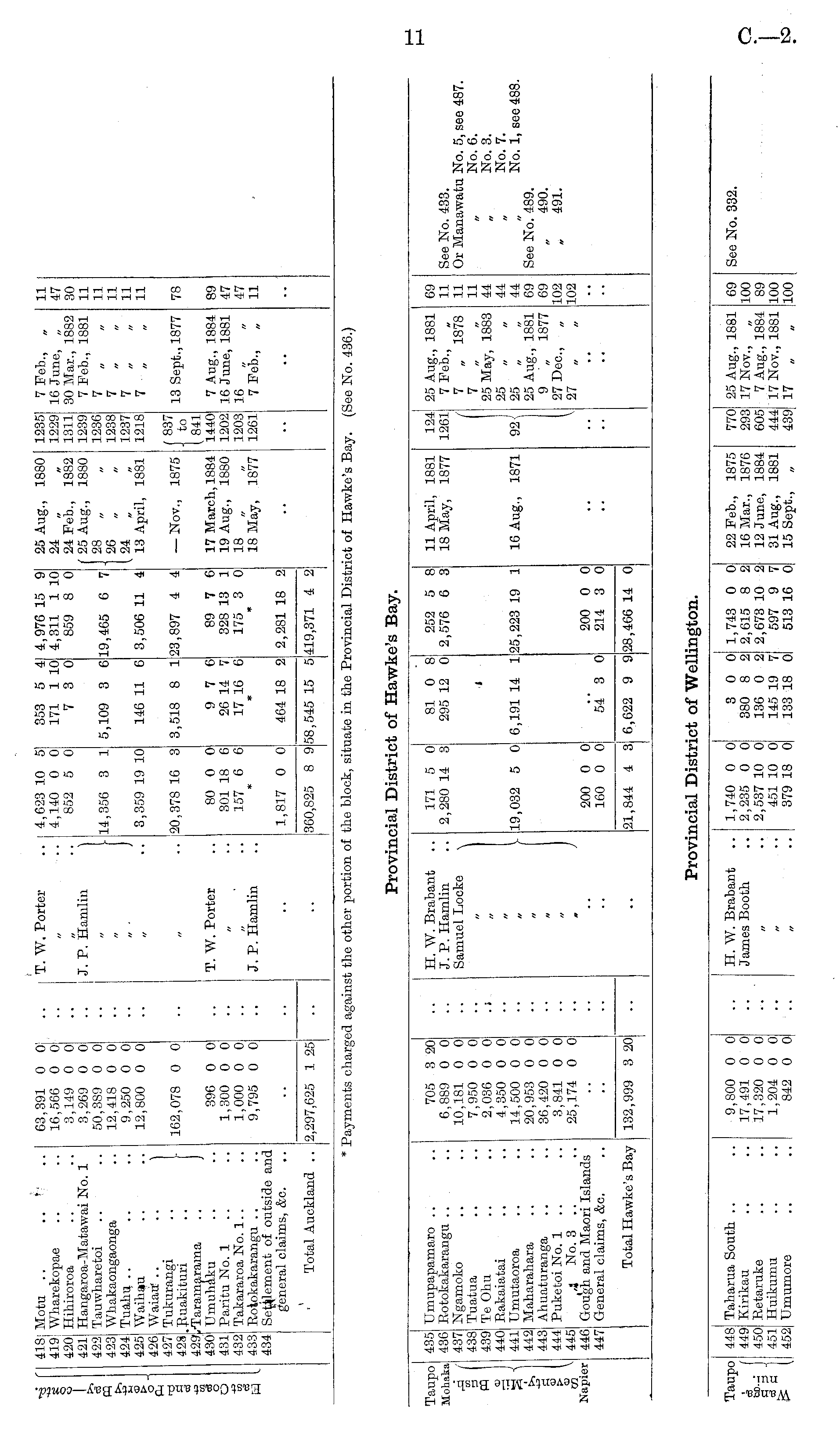 o T pq t>» CD O ft a crS o oa 418; 419' 420 421 422 423 424 425 426 427 428 4291 430j 431 432 433] 434 Motu .. Wharekopae Hihiroroa Hangaroa-Matawai No. 1 Tauwharetoi Whakaongaonga Tuahu Waihau Waiau .. .. 1 Tukurangi . Ruakituri .-Taramarama .. ) Umuhaku Paritu No. 1 Takararoa No. 1.. Botokakarangu Settlement of outside and general claims, &c 63,391 0 0 16,566 0 0 3,149 0 0 3,269 0 0 50,389 0 0 12,418 0 0 9,250 0 0 12,800 0 0 T. W. Porter J. P. Hamlin I 4,623 10 5 4,140 0 0 852 5 0 14,356 3 1 3,359 19 10 353 5 4 171 1 10 7 3 0 5,109 3 6 146 11 6 4,976 15 9 4,311 1 10 859 8 0 19,465 6 7 3,506 11 i 25 Aug., 1880 24 „ 24 Feb., 1882 ( 25 Aug., 1880 J 28 „ 1 26 „ { 24 „ 13 April, 1881 1235 1229 1311 1239 1236 1238 1237 1218 7 Feb., „ 16 June, „ 30 Mar., 1882 7 Feb., 1881 7 „ 7 „ 7 „ 7 „ 11 47 30 11 11 11 11 11 162,078 0 0 396 0 0 1,300 0 0 1,000 0 0 9,795 0 0 T. W. Porter 120,378 16 3 80 0 0 301 18 6 157 6 6 3,518 8 1 9 7 6 26 14 7 17 16 6 23,897 4 4 89 7 6 328 13 1 175 3 0 — Nov., 1875 17 March, 1884 19 Aug., 1880 18 „ 18 May, 1877 ( 837 \ to (841 1440 1202 1203 1261 13 Sept., 1877 7 Aug., 1884 16 June, 1881 16 „ 7 Feb., „ 78 89 47 47 11 J. P. Hamlin 1,817 0 0 464 18 2 2,281 18 2 Total Auckland .. 2,297,625 1 25 360,825 8 9 58,545 15 5 419,371 4 2 * Payments charged againi ;t the other portion of the block, siti ate in the Provincial District of Hawke's Bay. (See No. 436.) Provim 3ial Distric t of Hawke's Bay. Taupo Mohaka a a CD CD V Napier 435 436 437 438 439 440 441 442 443 444 445 446 447 Umupapamaro Botokakarangu Ngamoko Tuatua Te Ohu Bakaiatai Umutaoroa Maharahara Ahuaturanga Puketoi No. 1 .. J No. 3 .. Gough and Maori Islands General claims, &c. 705 3 20 6,889 0 0 10,181 0 0 7,950 0 0 2,036 0 0 4,350 0 0 14,500 0 0 20,953 0 0 36,420 0 0 3,841 0 0 25,174 0 0 H. W. Brabant J. P. Hamlin Samuel Locke 171 5 0 2,280 14 3 81 0 8 295 12 0 252 5 8 2,576 6 3 11 April, 1881 18 May, 1877 12( 126: 25 Aug., 1881 7 Feb., „ 7 „ 1878 7 „ 25 May, 1883 25 „ 25 „ 25 Aug., 1881 9 '„ 1877 27 Dec, „ 27 „ 69 11 11 11 44 44 44 69 69 102 102 See No. 433. Or Manawatu No. 5, see 487. No. 6. No. 3. No. 7. No. 1, see 488. See No. 489. 490. 491. 19,032 5 0 6,191 14 1 25,223 19 1 16 Aug., 1871 92 200 0 0] 160 o o; 5-t' 3 0 200 0 0 214 3 0 •• •• Total Hawke's Bay 132,999 3 20 21,844 4 3 6,622 9 9 28,466 14 0 Provii cial Dist: ct of Wellington. Taupo 448 Taharua South .. ( 449 Kirikau g".~ 450 Betaruke a a 451 Huikumu > ( 452 Umumore 9,800 0 0 17,491 0 0 17,320 0 0 1,204 0 0 842 0 0 H. W. Brabant James Booth 1,740 0 0 2,235 0 0 2,537 10 0 451 10 0 379 18 0 3 0 0 1,743 0 0 22 Feb., 1875 770 25 Aug., 1881 69 See No. 332. 380 8 2 2,615 8 2 16 Mar., 1876 293 17 Nov., „ 100 136 0 2 2,673 10 2 12 June, 1884 605 7 Aug., 1884 89 145 19 7 597 9 7 31 Aug., 1881 444 17 Nov., 1881 100 133 18 0 513 16 0 15 Sept., „ 439 17 „ „ 100