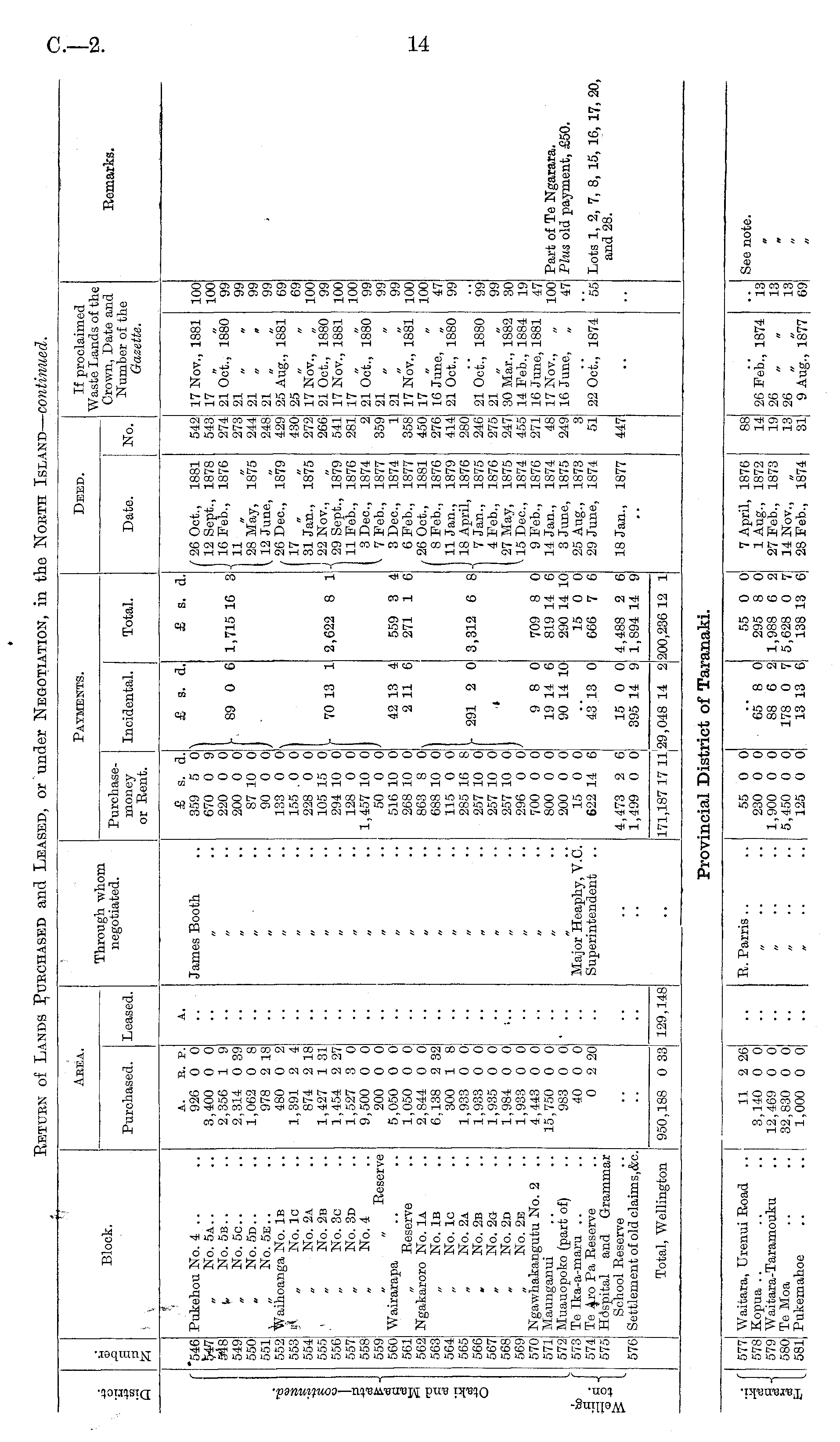 Abea. Payments. Deed. If proclaimed Waste Lands of the Crown, Date and Number of the Gazette. OS CD a Block. Purchased. Leased. negotiated. Purchasemoney or Rent. Incidental. Total. No. Remarks. Date. 1 v I *546 547 548 549 550 551 552 553 554 555 556 557 558 559 560 561 562 563 564 565 566 567 568 569 570 571 572' 5731 574 575 Pukehou No. 4 .. No. 5a.. I„ No. 5b .. „ No. 5c. No. 5d.. No. 5e .. Waihoanga No. 1b I „ No. lc No. 2a No. 2b No. 3c No. 3d No. 4 A. K. P. 926 0 0 3,400 0 0 2,356 1 9 2,314 0 39 1,062 0 8 978 2 18 480 0 2 1,391 2 4 874 2 18 1,427 1 31 1,454 2 27 1,527 3 0 9,500 0 0 200 0 0 5,050 0 0 1,050 0 0 2,844 0 0 6,138 2 32 300 1 8 1,933 0 0 1,933 0 0 1,935 0 0 1,984 0 0 1,933 0 0 4,443 0 0 15,750 0 0 983 0 0 40 0 0 0 2 20 A. James Booth £ s. d. 359 5 0 670 0 9 220 0 0 200 0 0 87 10 0 90 0 0 133 0 0 155 .0 0 228 0 0 105 15 0 294 10 0 128 0 0 1,457 10 0 50 0 0 516 10 0 268 10 0 863 8 0 688 10 0 115 0 0 285 16 8 257 10 0 257 10 0 257 10 0 296 0 0 700 0 0 800 0 0 200 0 0 15 0 0 622 14 6 £ s. d. £ s. d. 26 Oct., 1881 12 Sept., 1878 16 Feb., 1876 11 „ 28 May, 1875 12 June, „ 26 Dec, 1879 17 „ 31 Jan., 1875 22 Nov., 29 Sept., 1879 11 Feb., 1876 3 Dec, 1874 7 Feb., 1877 3 Dec, 1874 6 Feb., 1877 26 Oct., 1881 8 Feb., 1876 11 Jan., 1879 18 April, 1876 7 Jan., 1875 4 Feb., 1876 27 May, 1875 15 Dec, 1874 9 Feb., 1876 14 Jan., 1874 3 June, 1875 25 Aug., 1873 29 June, 1874 542 543 274 273 244 248 429 430 272 266 541 281 2 359 1 358 450 276 414 280 246 275 247 455 271 48 249 3 51 17 Nov., 1881 17 „ 21 Oct., 1880 21 „ 21 „ 21 „ 25 Aug., 1881 25 17 Nov., "„ 21 Oct., 1880 17 Nov., 1881 17 „ 21 Oct., 1880 21 „ 21 „ 17 Nov., 1881 17 „ 16 June, „ 21 Oct., 1880 '*3 0 rt3 a cS o 89 0 6 70 13 1 1,715 16 3 2,622 8 1 100 100 99 99 99 99 69 69 100 99 100 100 99 99 99 100 100 47 99 „ Reserve Wairarapa 42 13 4 2 11 6 559 3 4 271 1 6 „ Reserve Ngakaroro No. 1a No. 1b No. lc No. 2a No. 2b No. 2a No. 2d No. 2e Ngawhakangutu No. 2 .. Maunganui Muauopoko (part of) Te Ika-a-maru Te Aro Pa Reserve Hospital and Grammar School Reserve Settlement of old claims, &c 291 2 0 " 9 8 0 19 14 6 90 14 10 3,312 6 8 709 8 0 819 14 6 290 14 10 15 0 0 666 7 6 21 Oct., 1S80 21 „ 30 Mar., 1882 14 Feb., 1884 16 June, 1881 17 Nov., „ 16 June, „ 99 99 30 19 47 100 47 Major Heaphy, V.C. Superintendent .. Part of Te Ngarara, Plus old payment, £50. so a . 43'l3 0 22 Oct.', 1874 ~55 Lots 1, 2, 7, 8, 15, 16, 17, 20, and 28. 576 •• 4,473 2 6 1,499 0 0 15 0 0 395 14 9 4,488 2 6 1,894 14 9 18 Jan., 1877 447 •• Total, Wellington 950,188 0 33 129,148 171,187 17 11 29,048 14 2 200,230 12 1 Provi ncial District of Taranaki. .A f 577 Waitara, Urenui Road i| 578 Kopua .. § A 579 Waitara-Taramouku g 580 Te Moa E -1 [ 581 Pukemahoe 11 2 26 3,140 0 0 12,469 0 0 32,830 0 0 1,000 0 0] R. Parris .. 55 0 0 230 0 0 1,900 0 0 5,450 0 0 125 0 0 55 0 0 7 April, 1876 65 8 0 295 8 0 1 Aug., 1872 88 6 2 1,988 6 2 27 Feb., 1873 178 0 7 5,628 0 7 14 Nov., „ 13 13 6 138 13 6 28 Feb., 1874 88 .. .. See note. 14 26 Feb., 1874 13 19 26 „ „ 13 13 26 „ „ 13 31 9 Aug., 1877 69