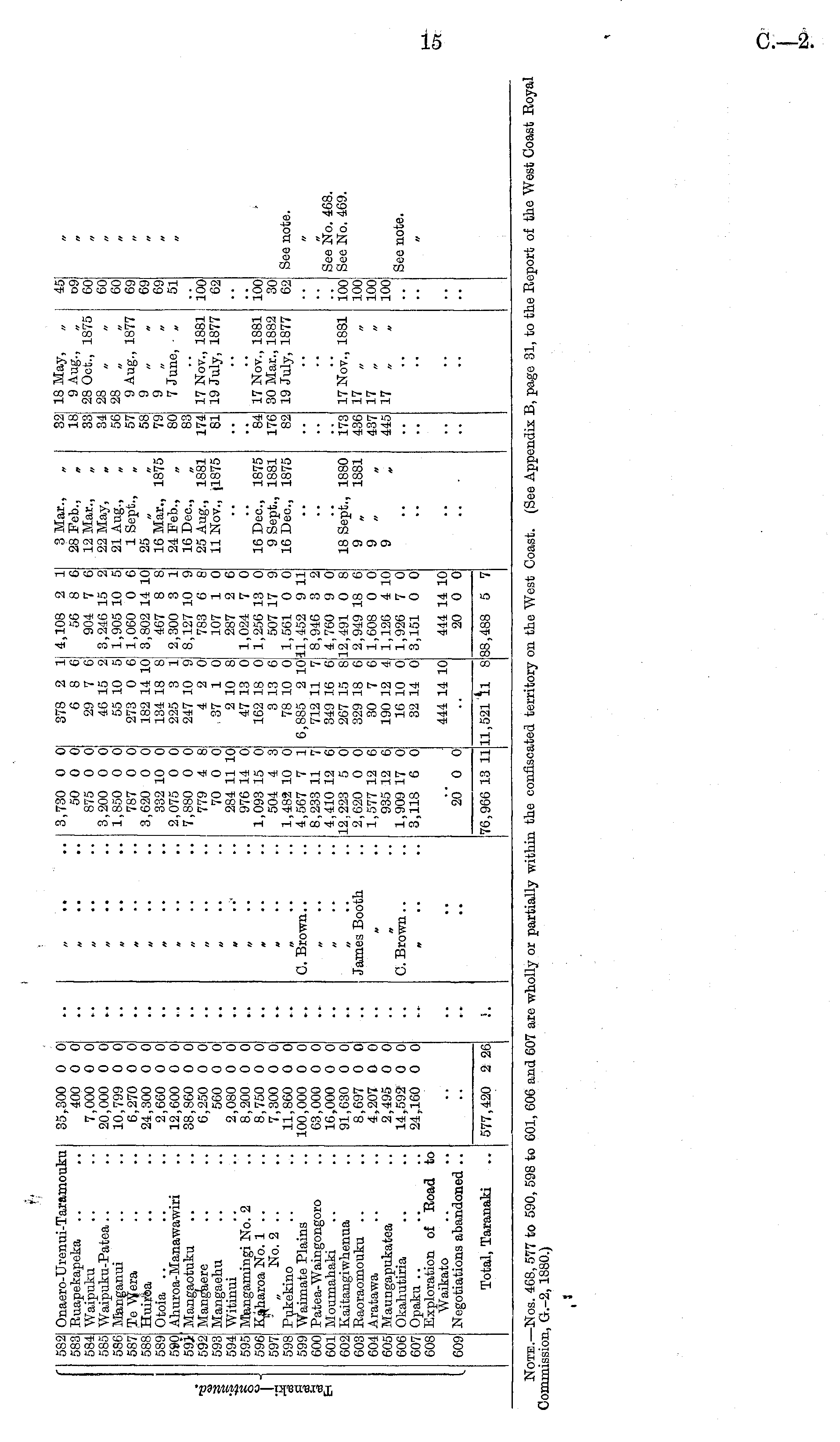 ■a o ! m 582 583 584 585 586 587 588 589 590 591 592 593 594 595 596 597 598 599 600 601 602 603 604 605 606 607 608 Onaero-Urenui-Taramouku Buapekapeka Waipuku Waipuku-Patea Manganui Te Wera Huiroa Otoia Ahuroa-Manawawiri Mangaotuku Mangaere Mangaehu Witinui Mangamingi No. 2 Kaharoa No. 1 .. No. 2 .. Pukekino Waimate Plains Patea-Waingongoro Moumahaki Kaitangiwhenua Baoraomouku Aratawa Maungapukatea Okahutiria Opaku Exploration of Road to Waikato Negotiations abandoned .. 35,300 0 0 400 0 0 7,000 0 0 20,000 0 0 10,799 0 0 6,270 0 0 24,300 0 0 2,660 0 0 12,600 0 0 38,860 0 0 6,250 0 0 560 0 0 2,080 0 0 8,200 0 0 8,750 0 0 7,300 0 0 11,860 0 0 100,000 0 0 63,000 0 0 16,000 0 0 91,630 0 0 8,697 0 0 4,207 0 0 2,495 0 0 14,592 0 0 24,160 0 0 » .. 3,730 0 0 50 0 0 875 0 0 3,200 0 0 1,850 0 0 787 0 0 3,620 0 0 332 10 0 2,075 0 0 7,880 0 0 779 4 8 70 0 0 284 11 10 976 14 0 1,093 15 0 504 4 3 1,482 10 0 4,567 7 1 8,233 11 7 4,410 12 6 12,223 5 0 2,620 0 0 1,577 12 6 935 12 6 1,909 17 0 3,118 6 0 378 2 1 6 8 6 29 7 6 46 15 2 55 10 5 273 0 6 182 14 10 134 18 8 225 3 1 247 10 9 4 2 0 37 1 0 2 10 8 47 13 0 162 18 0 3 13 6 78 10 0 6,885 2 10 712 11 7 349 16 6 267 15 8 329 18 6 30 7 6 190 12 4 16 10 0 32 14 0 4,108 2 1 56 8 6 904 7 6 3,240 15 2 1,905 10 5 1,060 0 6 i 3,802 14 10 467 8 8 2,300 3 1 8,127 10 9 783 6 8 107 1 0 287 2 6 1,024 7 0 1,256 13 0 507 17 9 1,561 0 0 11,452 9 11 8,946 3 2 4,760 9 0 12,491 0 8 2,949 18 6 1,608 0 0 1,126 4 10 1,926 7 0 3,151 0 0 3 Mar., 28 Feb., 12 Mar., 22 May, 21 Aug., „ 1 Sept., „ 25 16 Mar,, 1875 24 Feb., 16 Dec, 25 Aug., 1881 11 Nov., (1875 16 Dec, 1875 9 Sept., 1881 16 Dec, 1875 32 18 33 34 56 57 58 79 80 83 174 81 84 176 82 18 May, „ 9 Aug., „ 28 Oct., 1875 28 „ 28 „ 9 Aug., 1877 9 „ 9 „ 7 June, - „ 17 Nov., 1881 19 July, 1877 17 Nov., 1881 30 Mar., 1882 19 July, 1877 45 o9 60 60 60 69 69 69 51 100 62 100 30 62 See note. C. Brown.. 18 Sept., 1880 9 „ 1881 9 „ 9 173 436 437 445 17 Nov., 1881 17 „ 17 „ 17 „ 100 100 100 100 See No. 468. See No. 469. James Booth C. Brown.. See note. » .. •• 26' 0 0 444 14 10 444 14 10 20 0 0 609 ■• Total, Taranaki 577,420 2 26 s b 76,966 13 11 11,521 il 8 88,488 5 7 Note.— Nos. 468, 577 to 590, 598 to 601, 606 and 607 are wholly or partially within the confiscated territory on the West Coast. (See Appendix B, page 31, to the Report of the West Coast Royal Commission, G.-2, 1880.)
