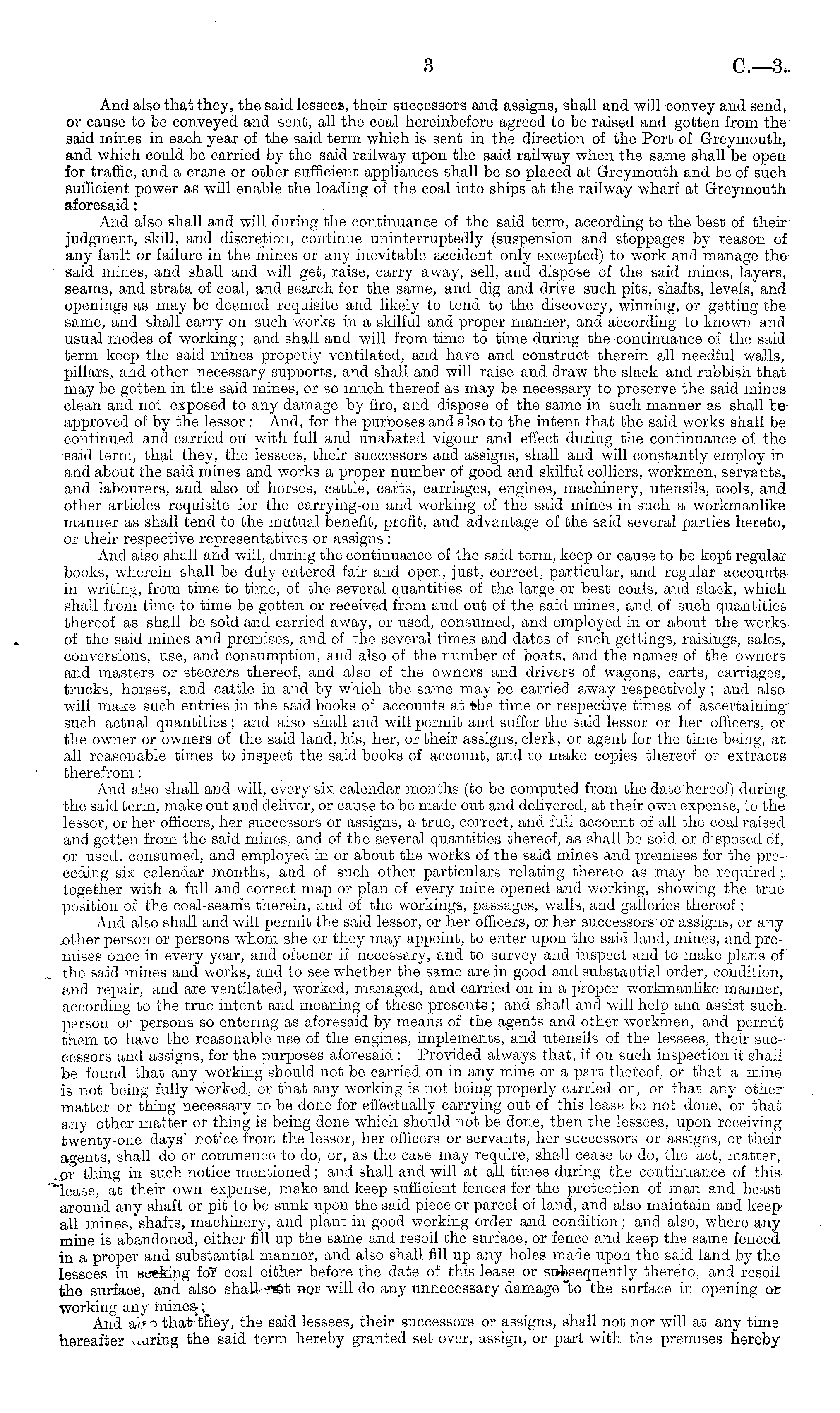 And also that they, the said lessees, their successors and assigns, shall and will convey and send, or cause to be conveyed and sent, all the coal hereinbefore agreed to be raised and gotten from the said mines in each year of the said term which is sent in the direction of the Port of Greymouth, and which could be carried by the said railway upon the said railway when the same shall be open for traffic, and a crane or other sufficient appliances shall be so placed at Greymouth and be of such sufficient power as will enable the loading of the coal into ships at the railway wharf at Greymouth aforesaid: And also shall and will during the continuance of the said term, according to the best of their judgment, skill, and discretion, continue uninterruptedly (suspension and stoppages by reason of any fault or failure in the mines or any inevitable accident only excepted) to work and manage the said mines, and shall and will get, raise, carry away, sell, and dispose of the said mines, layers, seams, and strata of coal, and search for the same, and dig and drive such pits, shafts, levels, and openings as may be deemed requisite and likely to tend to the discovery, winning, or getting the same, and shall carry on such works in a skilful and proper manner, and according to known and usual modes of working; and shall and will from time to time during the continuance of the said term keep the said mines properly ventilated, and have and construct therein all needful walls, pillars, and other necessary supports, and shall and will raise and draw the slack and rubbish that may be gotten in the said mines, or so much thereof as may be necessary to preserve the said mines clean and not exposed to any damage by fire, and dispose of the same in such manner as shall be approved of by the lessor : And, for the purposes and also to the intent that the said works shall be continued and carried on with Ml and unabated vigour and effect during the continuance of the said term, that they, the lessees, their successors and assigns, shall and will constantly employ in and about the said mines and works a proper number of good and skilful colliers, workmen, servants, and labourers, and also of horses, cattle, carts, carriages, engines, machinery, utensils, tools, and other articles requisite for the carrying-on and working of the said mines in such a workmanlike manner as shall tend to the mutual benefit, profit, and advantage of the said several parties hereto, or their respective representatives or assigns : And also shall and will, during the continuance of the said term, keep or cause to be kept regular books, wherein shall be duly entered fair and open, just, correct, particular, and regular accounts in writing, from time to time, of the several quantities of the large or best coals, and slack, which shall from time to time be gotten or received from and out of the said mines, and of such quantities thereof as shall be sold and carried away, or used, consumed, and employed in or about the works of the said mines and premises, and of the several times and dates of such gettings, raisings, sales, conversions, use, and consumption, and also of the number of boats, and the names of the owners and masters or steerers thereof, and also of the owners and drivers of wagons, carts, carriages, trucks, horses, and cattle in and by which the same may be carried away respectively; and also will make such entries in the said books of accounts at *he time or respective times of ascertaining such actual quantities; and also shall and will permit and suffer the said lessor or her officers, or the owner or owners of the said land, his, her, or their assigns, clerk, or agent for the time being, at all reasonable times to inspect the said books of account, and to make copies thereof or extracts therefrom: And also shall and will, every six calendar months (to be computed from the date hereof) during the said term, make out and deliver, or cause to be made out and delivered, at their own expense, to the lessor, or her officers, her successors or assigns, a true, correct, and full account of all the coal raised and gotten from the said mines, and of the several quantities thereof, as shall be sold or disposed of, or used, consumed, and employed in or about the works of the said mines and premises for the preceding six calendar months, and of such other particulars relating thereto as may be required; together with a full and correct map or plan of every mine opened and working, showing the true position of the coal-seams therein, and of the workings, passages, walls, and galleries thereof : And also shall and will permit the said lessor, or her officers, or her successors or assigns, or any .other person or persons whom she or they may appoint, to enter upon the said land, mines, and premises once in every year, and oftener if necessary, and to survey and inspect and to make plans of the said mines and works, and to see whether the same are in good and substantial order, condition, and repair, and are ventilated, worked, managed, and carried on in a proper workmanlike manner, according to the true intent and meaning of these presents; and shall and will help and assist such person or persons so entering as aforesaid by means of the agents and other workmen, and permit them to have the reasonable use of the engines, implements, and utensils of the lessees, their successors and assigns, for the purposes aforesaid : Provided always that, if on such inspection it shall be found that any working should not be carried on in any mine or a part thereof, or that a mine is not being fully worked, or that any working is not being properly carried on, or that any other matter or thing necessary to be done for effectually carrying out of this lease ba not done, or that any other matter or thing is being done which should not be done, then the lessees, upon receiving twenty-one days' notice from the lessor, her officers or servants, her success