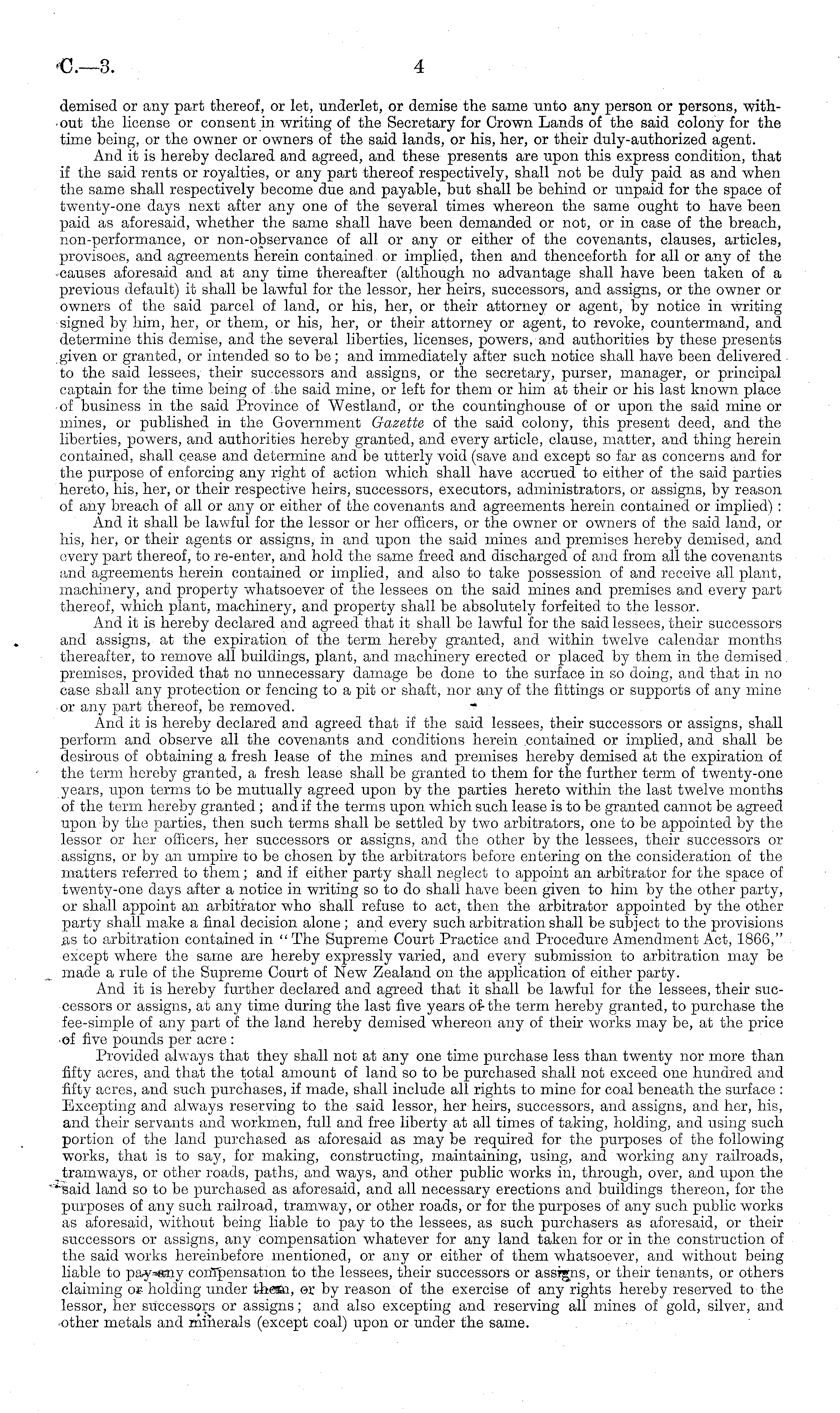 demised or any part thereof, or let, underlet, or demise the same unto any person or persons, without the license or consent in writing of the Secretary for Crown Lands of the said colony for the time being, or the owner or owners of the said lands, or his, her, or their duly-authorized agent. And it is hereby declared and agreed, and these presents are upon this express condition, that if the said rents or royalties, or any part thereof respectively, shall not be duly paid as and when the same shall respectively become due and payable, but shall be behind or unpaid for the space of twenty-one days next after any one of the several times whereon the same ought to have been paid as aforesaid, whether the same shall have been demanded or not, or in case of the breach, non-performance, or non-observance of all or any or either of the covenants, clauses, articles, provisoes, and agreements herein contained or implied, then and thenceforth for all or any of the causes aforesaid and at any time thereafter (although no advantage shall have been taken of a previous default) it shall be lawful for the lessor, her heirs, successors, and assigns, or the owner or owners of the said parcel of land, or his, her, or their attorney or agent, by notice in writing signed by him, her, or them, or his, her, or their attorney or agent, to revoke, countermand, and determine this demise, and the several liberties, licenses, powers, and authorities by these presents given or granted, or intended so to be; and immediately after such notice shall have been delivered to the said lessees, their successors and assigns, or the secretary, purser, manager, or principal captain for the time being of the said mine, or left for them or him at their or his last known place of business in the said Province of Westland, or the countinghouse of or upon the said mine or mines, or published in the Government Gazette of the said colony, this present deed, and the liberties, powers, and authorities hereby granted, and every article, clause, matter, and thing herein contained, shall cease and determine and be utterly void (save and except so far as concerns and for the purpose of enforcing any right of action which shall have accrued to either of the said parties hereto, his, her, or their respective heirs, successors, executors, administrators, or assigns, by reason of any breach of all or any or either of the covenants and agreements herein contained or implied) : And it shall be lawful for the lessor or her officers, or the owner or owners of the said land, or his, her, or their agents or assigns, in and upon the said mines and premises hereby demised, and every part thereof, to re-enter, and hold the same freed and discharged of and from all the covenants and agreements herein contained or implied, and also to take possession of and receive all plant, machinery, and property whatsoever of the lessees on the said mines and premises and every part thereof, which plant, machinery, and property shall be absolutely forfeited to the lessor. And it is hereby declared and agreed that it shall be lawful for the said lessees, their successors and assigns, at the expiration of the term hereby granted, and within twelve calendar months thereafter, to remove all buildings, plant, and machinery erected or placed by them in the demised premises, provided that no unnecessary damage be done to the surface in so doing, and that in no case shall any protection or fencing to a pit or shaft, nor any of the fittings or supports of any mine or any part thereof, be removed. And it is hereby declared and agreed that if the said lessees, their successors or assigns, shall perform and observe all the covenants and conditions herein contained or implied, and shall be desirous of obtaining a fresh lease of the mines and premises hereby demised at the expiration of the term hereby granted, a fresh lease shall be granted to them for the further term of twenty-one years, upon terms to be mutually agreed upon by the parties hereto within the last twelve months of the term hereby granted ; and if the terms upon which such lease is to be granted cannot be agreed upon by the parties, then such terms shall be settled by two arbitrators, one to be appointed by the lessor or her officers, her successors or assigns, and the other by the lessees, their successors or assigns, or by an umpire to be chosen by the arbitrators before entering on the consideration of the matters referred to them; and if either party shall neglect to appoint an arbitrator for the space of twenty-one days after a notice in writing so to do shall have been given to him by the other party, or shall appoint an arbitrator who shall refuse to act, then the arbitrator appointed by the other party shall make a final decision alone ; and every such arbitration shall be subject to the provisions ,&s to arbitration contained in " The Supreme Court Practice and Procedure Amendment Act, 1866," except where the same are hereby expressly varied, and every submission to arbitration may be made a rule of the Supreme Court of New Zealand on the application of either party. And it is hereby further declared and agreed that it shall be lawful for the lessees, their successors or assigns, at any time during the last five years of-the term hereby granted, to purchase the fee-simple of any part of the land hereby demised whereon any of their works may be, at the price •of five pounds per acre : Provided always that they shall not at any one time purchase less than twenty nor more than fifty acres, and that the total amount of land so to be purchased shall not exceed one hundred and fifty acres, and such purchases, if made, shall include all rights to mine for coal beneath the surface : Excepting and always reserving to the said lessor, her heirs, successors, and assigns, and her, his, and their servants and workmen, full and free liberty at all times of taking, holding, and using such portion of the land purcha