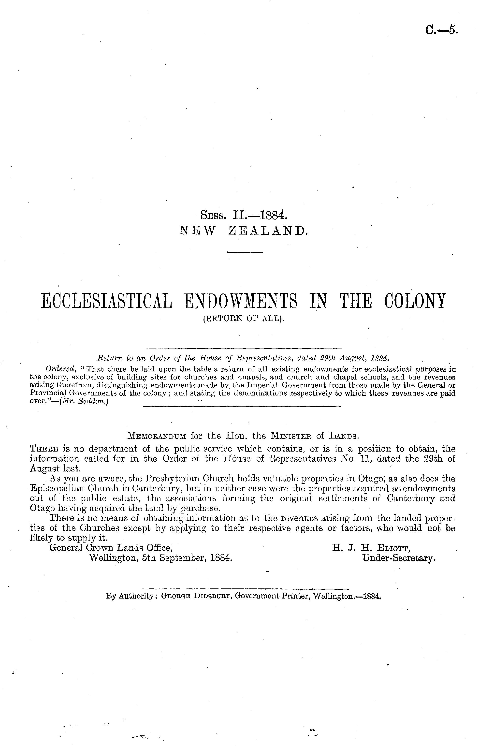 Memoeandum for the Hon. the Minister of Lands. Theee is no department of the public service which contains, or is in a position to obtain, the information called for in the Order of the House of Eepresentatives No. 11, dated the 29th of August last. As you are aware, the Presbyterian Church holds valuable properties in Otago, as also does the Episcopalian Church in Canterbury, but in neither case were the properties acquired as endowments out of the public estate, the associations forming the original settlements of Canterbury and Otago having acquired the land by purchase. There is no means of obtaining information as to the revenues arising from the landed properties of the Churches except by applying to their respective agents or factors, who would not be likely to supply it. General Crown Lands Office, H. J. H. Eliott, Wellington, sth September, 1884. Under-Secretary. By Authority: G-eobgb Didsbury, Government Printer, Wellington.—lBB4.