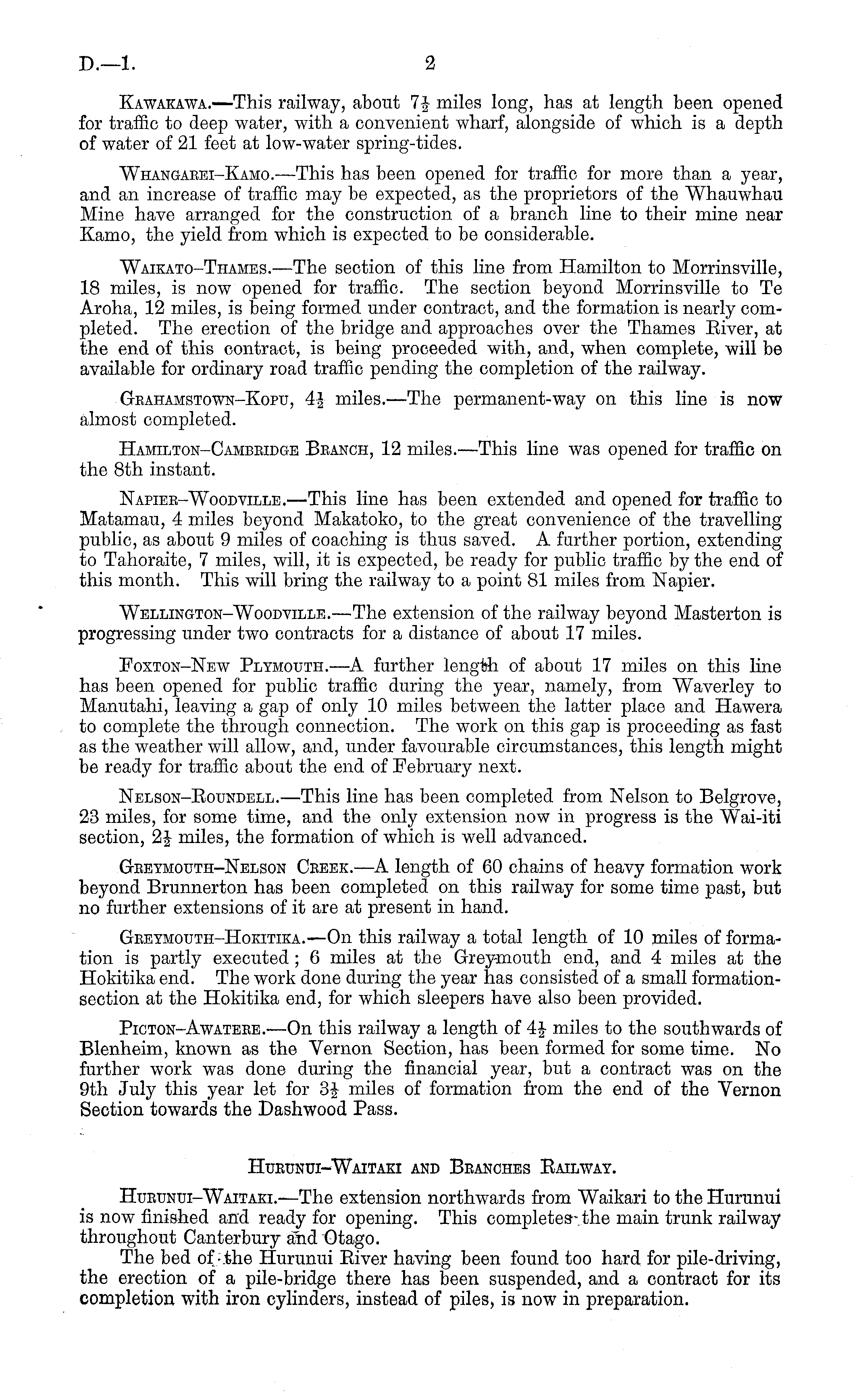 Kawakawa.—This railway, about 7£ miles long, has at length been opened for traffic to deep water, with a convenient wharf, alongside of which is a depth of water of 21 feet at low-water spring-tides. Whangarei-Kamo.—This has been opened for traffic for more than a year, and an increase of traffic may be expected, as the proprietors of the Whauwhau Mine have arranged for the construction of a branch line to their mine near Kamo, the yield from which is expected to be considerable. Waikato-Thames.—The section of this line from Hamilton to Morrinsville, 18 miles, is now opened for traffic. The section beyond Morrinsville to Te Aroha, 12 miles, is being formed under contract, and the formation is nearly completed. The erection of the bridge and approaches over the Thames Eiver, at the end of this contract, is being proceeded with, and, when complete, will be available for ordinary road traffic pending the completion of the railway. Gbahamstown-Kopu, 4| miles. —The permanent-way on this line is now almost completed. Hamilton-Cambbidge Beanch, 12 miles.—This line was opened for traffic on the Bth instant. Napiee-Woodville.—This line has been extended and opened for traffic to Matamau, 4 miles beyond Makatoko, to the great convenience of the travelling public, as about 9 miles of coaching is thus saved. A further portion, extending to Tahoraite, 7 miles, will, it is expected, be ready for public traffic by the end of this month. This will bring the railway to a point 81 miles from Napier. Wellington-Woodville.—The extension of the railway beyond Masterton is progressing under two contracts for a distance of about 17 miles. Foxton-New Plymouth.—A further length of about 17 miles on this line has been opened for public traffic during the year, namely, from Waverley to Manutahi, leaving a gap of only 10 miles between the latter place and Hawera to complete the through connection. The work on this gap is proceeding as fast as the weather will allow, and, under favourable circumstances, this length might be ready for traffic about the end of February next. Nelson-Boundell.—This line has been completed from Nelson to Belgrove, 23 miles, for some time, and the only extension now in progress is the Wai-iti section, 2J miles, the formation of which is well advanced. Greymouth-Nelson Ceeek.—A length of 60 chains of heavy formation work beyond Brunnerton has been completed on this railway for some time past, but no further extensions of it are at present in hand. Geeymouth-Hokitika.—On this railway a total length of 10 miles of formation is partly executed; 6 miles at the Greymouth end, and 4 miles at the Hokitika end. The work done during the year has consisted of a small formationsection at the Hokitika end, for which sleepers have also been provided. Picton-Awateee. —On this railway a length of 4J miles to the southwards of Blenheim, known as the Vernon Section, has been formed for some time. No further work was done during the financial year, but a contract was on the 9th July this year let for 3J miles of formation from the end of the Vernon Section towards the Dashwood Pass. Hurunui-Waitaki and Branches Eailway. Hurunui-Waitaki.—The extension northwards from Waikari to the Hurunui is now finished and ready for opening. This completes the main trunk railway throughout Canterbury and Otago. The bed of ■ the Hurunui Eiver having been found too hard for pile-driving, the erection of a pile-bridge there has been suspended, and a contract for its completion with iron cylinders, instead of piles, is now in preparation.