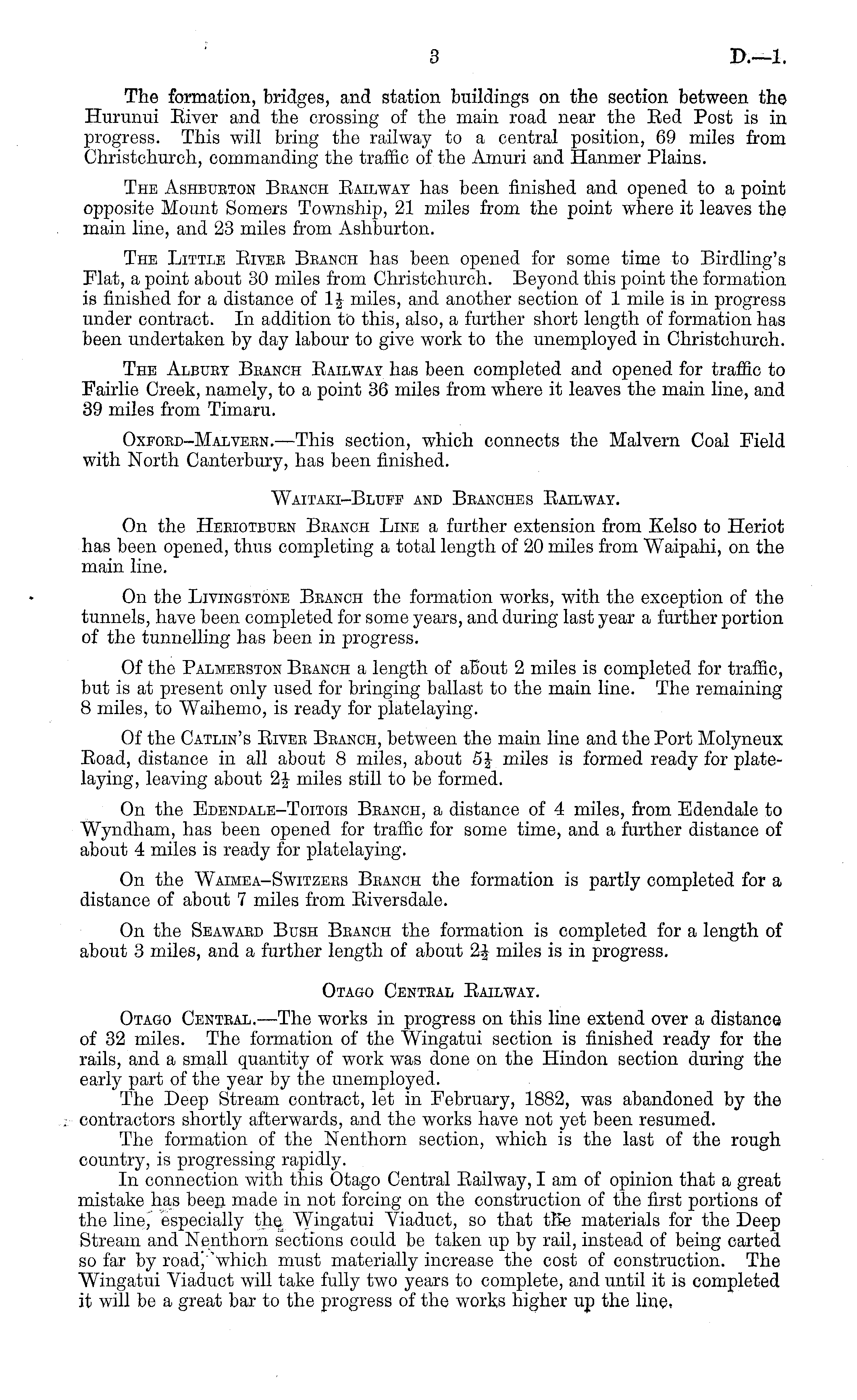 The formation, bridges, and station buildings on the section between the Hurunui Eiver and the crossing of the main road near the Eed Post is in progress. This will bring the railway to a central position, 69 miles from Christchurch, commanding the traffic of the Amuri and Hanmer Plains. The Ashbueton Beanch Eailway has been finished and opened to a point opposite Mount Somers Township, 21 miles from the point where it leaves the main line, and 23 miles from Ashburton. The Little Eiver Branch has been opened for some time to Birdling's Flat, a point about 30 miles from Christchurch. Beyond this point the formation is finished for a distance of 1| miles, and another section of 1 mile is in progress under contract. In addition to this, also, a further short length of formation has been undertaken by day labour to give work to the unemployed in Christchurch. The Albuey Beanch Eailway has been completed and opened for traffic to Fairlie Creek, namely, to a point 36 miles from where it leaves the main line, and 39 miles from Timaru. Oxford-Malvebn. —This section, which connects the Malvern Coal Field with North Canterbury, has been finished. Waitaki-Blufe and Branches Eailway. On the Heriotbubn Branch Line a further extension from Kelso to Heriot has been opened, thus completing a total length of 20 miles from Waipahi, on the main line. On the Livingstone Beanch the formation works, with the exception of the tunnels, have been completed for some years, and during last year a further portion of the tunnelling has been in progress. Of the Palmerston Branch a length of about 2 miles is completed for traffic, but is at present only used for bringing ballast to the main line. The remaining 8 miles, to Waihemo, is ready for platelaying. Of the Catlin's Eiver Branch, between the main line and the Port Molyneux Eoad, distance in all about 8 miles, about 5J miles is formed ready for platelaying, leaving about 2^ miles still to be formed. On the Edendale-Toitois Beanch, a distance of 4 miles, from Edendale to Wyndham, has been opened for traffic for some time, and a further distance of about 4 miles is ready for platelaying. On the Waimea-Switzers Branch the formation is partly completed for a distance of about 7 miles from Eiversdale. On the Seaward Bush Branch the formation is completed for a length of about 3 miles, and a further length of about 2| miles is in progress. Otago Central Eailway. Otago Central, —The works in progress on this line extend over a distance of 32 miles. The formation of the Wingatui section is finished ready for the rails, and a small quantity of work was done on the Hindon section during the early part of the year by the unemployed. The Deep Stream contract, let in February, 1882, was abandoned by the contractors shortly afterwards, and the works have not yet been resumed. The formation of the Nenthorn section, which is the last of the rough country, is progressing rapidly. In connection with this Otago Central Eailway, I am of opinion that a great mistake has been made in not forcing on the construction of the first portions of the line, especially the Wingatui Viaduct, so that trie materials for the Deep Stream and Nenthorn sections could be taken up by rail, instead of being carted so far by roadj "which must materially increase the cost of construction. The Wingatui Viaduct will take fully two years to complete, and until it is completed it will be a great bar to the progress of the works higher up the line,