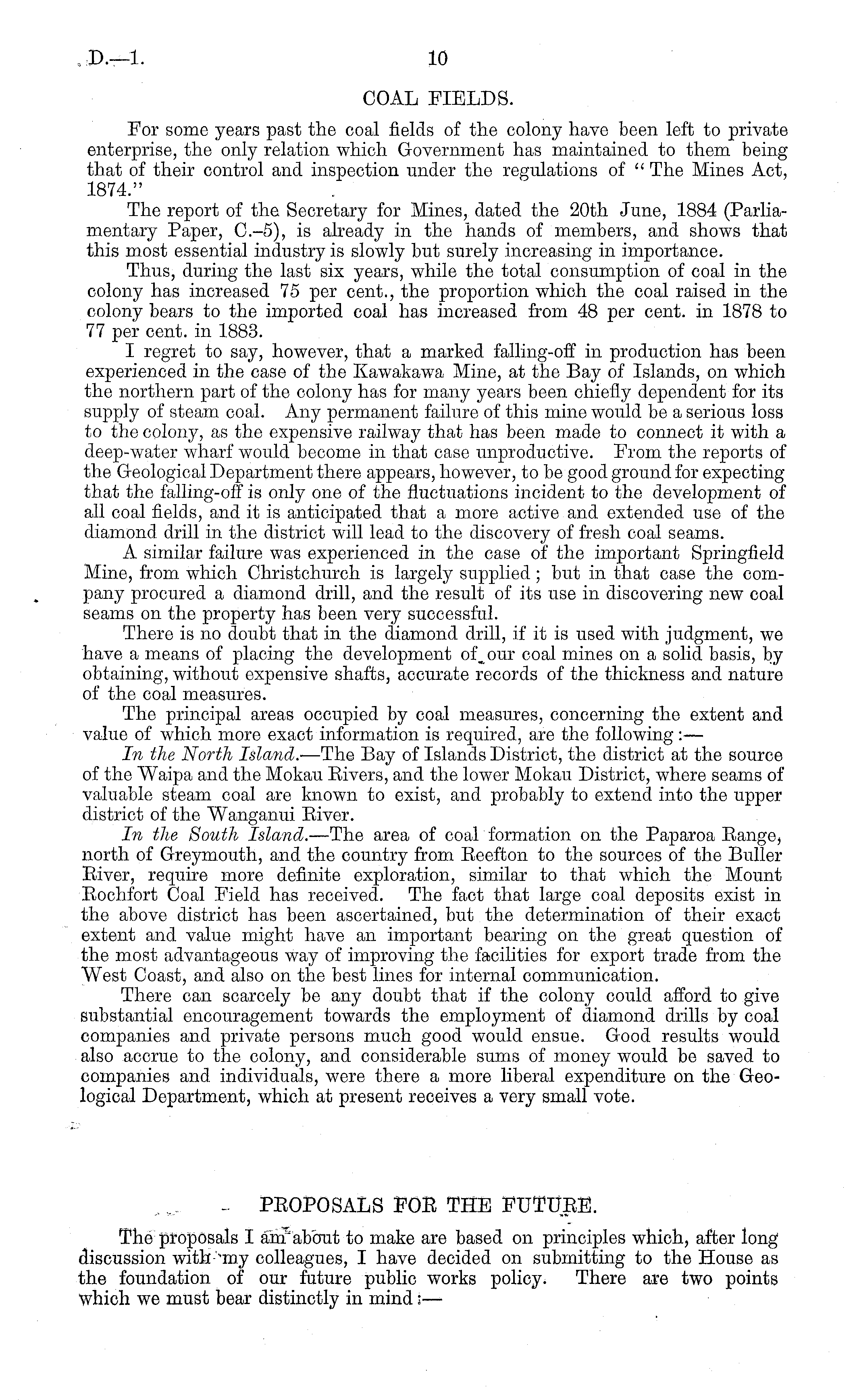COAL FIELDS. For some years past the coal fields of the colony have been left to private enterprise, the only relation which Government has maintained to them being that of their control and inspection under the regulations of " The Mines Act, 1874." The report of the Secretary for Mines, dated the 20th June, 1884 (Parliamentary Paper, C.-5), is already in the hands of members, and shows that this most essential industry is slowly but surely increasing in importance. Thus, during the last six years, while the total consumption of coal in the colony has increased 75 per cent., the proportion which the coal raised in the colony bears to the imported coal has increased from 48 per cent, in 1878 to 77 per cent, in 1883. I regret to say, however, that a marked falling-off in production has been experienced in the case of the Kawakawa Mine, at the Bay of Islands, on which the northern part of the colony has for many years been chiefly dependent for its supply of steam coal. Any permanent failure of this mine would be a serious loss to the colony, as the expensive railway that has been made to connect it with a deep-water wharf would become in that case unproductive. From the reports of the Geological Department there appears, however, to be good ground for expecting that the falling-off is only one of the fluctuations incident to the development of all coal fields, and it is anticipated that a more active and extended use of the diamond drill in the district will lead to the discovery of fresh coal seams. A similar failure was experienced in the case of the important Springfield Mine, from which Christchurch is largely supplied; but in that case the company procured a diamond drill, and the result of its use in discovering new coal seams on the property has been very successful. There is no doubt that in the diamond drill, if it is used with judgment, we have a means of placing the development of^our coal mines on a solid basis, by obtaining, without expensive shafts, accurate records of the thickness and nature of the coal measures. The principal areas occupied by coal measures, concerning the extent and value of which more exact information is required, are the following:— In the North Island. —The Bay of Islands District, the district at the source of the Waipa and the Mokau Bivers, and the lower Mokau District, where seams of valuable steam coal are known to exist, and probably to extend into the upper district of the Wanganui Biver. In the South Island. —The area of coal formation on the Paparoa Bange, north of Greymouth, and the country from Beefton to the sources of the Buller Biver, require more definite exploration, similar to that which the Mount Bochfort Coal Field has received. The fact that large coal deposits exist in the above district has been ascertained, but the determination of their exact extent and value might have an important bearing on the great question of the most advantageous way of improving the facilities for export trade from the West Coast, and also on the best lines for internal communication. There can scarcely be any doubt that if the colony could afford to give substantial encouragement towards the employment of diamond drills by coal companies and private persons much good would ensue. Good results would also accrue to the colony, and considerable sums of money would be saved to companies and individuals, were there a more liberal expenditure on the Geological Department, which at present receives a very small vote. - PBOPOSALS FOB THE FUTUBE. The proposals I am about to make are based on principles which, after long discussion with smy colleagues, I have decided on submitting to the House as the foundation of our future public works policy. There are two points which we must bear distinctly in mind i—
