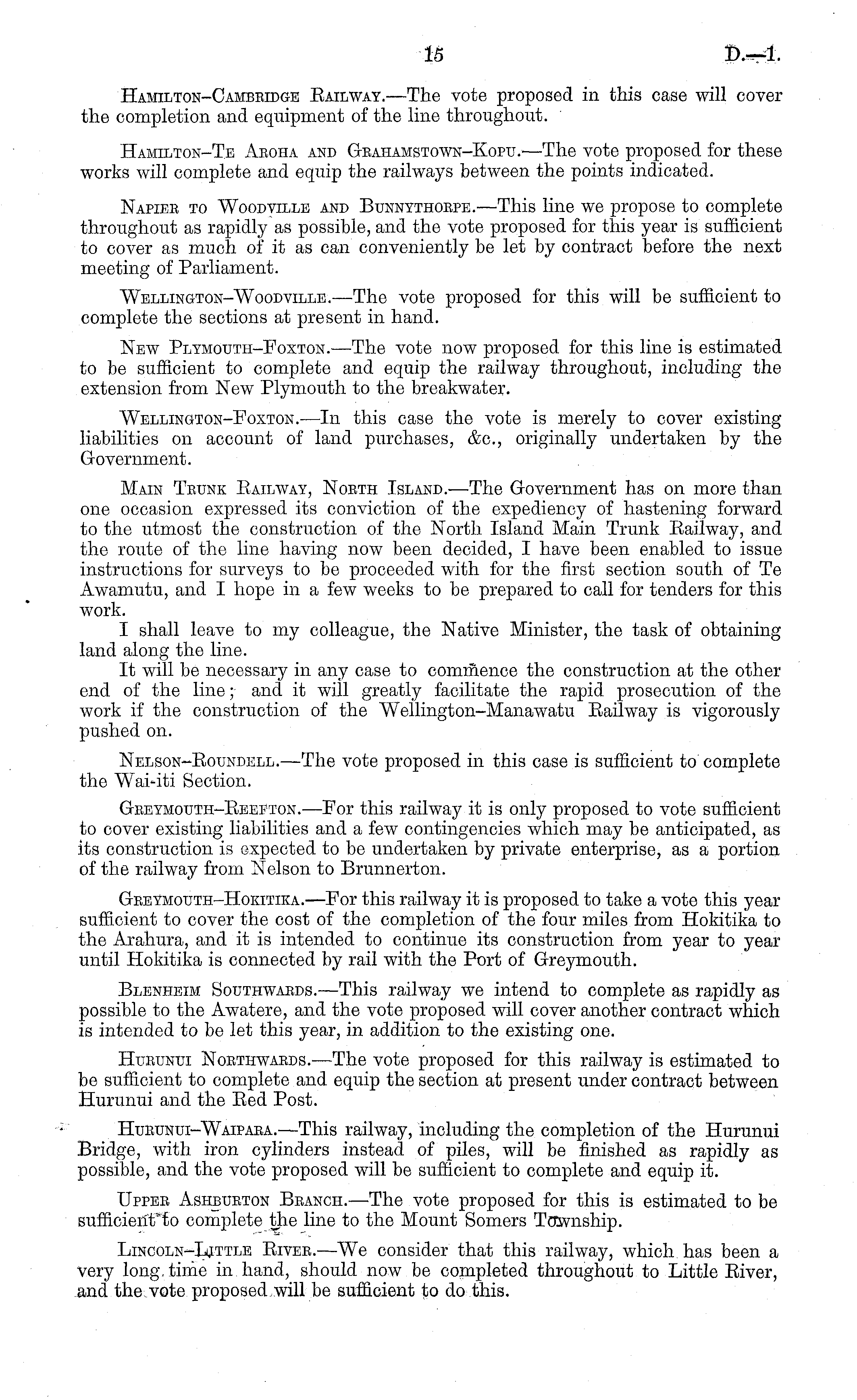 Hamilton-Cambridge Bailway.—The vote proposed in this case will cover the completion and equipment of the line throughout. Hamilton-Te Aroha and Grahamstown-Kopu.—The vote proposed for these works will complete and equip the railways between the points indicated. Napier to Woodville and Bunnythorpe.—This line we propose to complete throughout as rapidly as possible, and the vote proposed for this year is sufficient to cover as much of it as can conveniently be let by contract before the next meeting of Parliament. Wellington-Woodville.—The vote proposed for this will be sufficient to complete the sections at present in hand. New Plymouth-Foxton.—The vote now proposed for this line is estimated to be sufficient to complete and equip the railway throughout, including the extension from New Plymouth to the breakwater. Wellington-Foxton.—ln this case the vote is merely to cover existing liabilities on account of land purchases, &c, originally undertaken by the Government. Main Trunk Bailway, North Island.—The Government has on more than one occasion expressed its conviction of the expediency of hastening forward to the utmost the construction of the North Island Main Trunk Bailway, and the route of the line having now been decided, I have been enabled to issue instructions for surveys to be proceeded with for the first section south of Te Awamutu, and I hope in a few weeks to be prepared to call for tenders for this work. I shall leave to my colleague, the Native Minister, the task of obtaining land along the line. It will be necessary in any case to commence the construction at the other end of the line; and it will greatly facilitate the rapid prosecution of the work if the construction of the Wellington-Manawatu Bailway is vigorously pushed on. Nelson-Boundell. —The vote proposed in this case is sufficient to complete the Wai-iti Section. Greymouth-Beeeton.—For this railway it is only proposed to vote sufficient to cover existing liabilities and a few contingencies which may be anticipated, as its construction is expected to be undertaken by private enterprise, as a portion of the railway from Nelson to Brunnerton. GreYmouth-Hokitika.—For this railway it is proposed to take a vote this year sufficient to cover the cost of the completion of the four miles from Hokitika to the Arahura, and it is intended to continue its construction from year to year until Hokitika is connected by rail with the Port of Greymouth. Blenheim Southwards. —This railway we intend to complete as rapidly as possible to the Awatere, and the vote proposed will cover another contract which is intended to be let this year, in addition to the existing one. Hurunui Northwards. —The vote proposed for this railway is estimated to be sufficient to complete and equip the section at present under contract between Hurunui and the Bed Bost. Hurunui-Waipara.—This railway, including the completion of the Hurunui Bridge, with iron cylinders instead of piles, will be finished as rapidly as possible, and the vote proposed will be sufficient to complete and equip it. Upper Ashburton Branch.—The vote proposed for this is estimated to be sufficient to complete the line to the Mount Somers Township. Lincoln-Little Biver.—We consider that this railway, which has been a very long time in hand, should now be completed throughout to Little Biver, and the vote proposed will be sufficient to do this.
