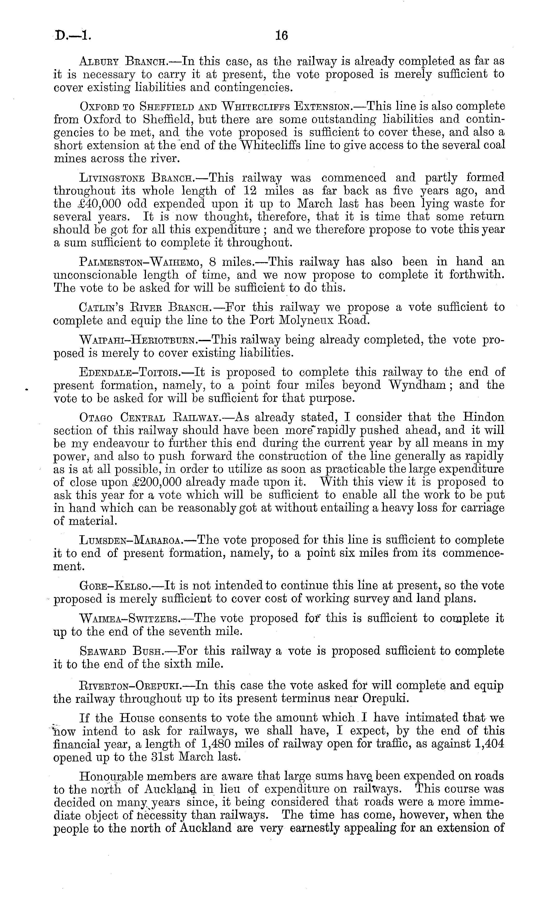Albury Branch.—ln this case, as the railway is already completed as far as it is necessary to carry it at present, the vote proposed is merely sufficient to cover existing liabilities and contingencies. Oxford to Sheffield and Whitecliees Extension. —This line is also complete from Oxford to Sheffield, but there are some outstanding liabilities and contingencies to be met, and the vote proposed is sufficient to cover these, and also a short extension at the end of the Whitecliffs line to give access to the several coal mines across the river. Livingstone Branch.—This railway was commenced and partly formed throughout its whole length of 12 miles as far back as five years ago, and the £40,000 odd expended upon it up to March last has been lying waste for several years. It is now thought, therefore, that it is time that some return should be got for all this expenditure ; and we therefore propose to vote this year a sum sufficient to complete it throughout. Palmerston-Waihemo, 8 miles.—This railway has also been in hand an unconscionable length of time, and we now propose to complete it forthwith. The vote to be asked for will be sufficient to do this. Catlin's Biver Branch. —Eor this railway we propose a vote sufficient to complete and equip the line to the Fort Molyneux Boad. Waipahi-Heriotburn.—This railway being already completed, the vote proposed is merely to cover existing liabilities. Edendale-Toitois. —It is proposed to complete this railway to the end of present formation, namely, to a point four miles beyond Wyndham; and the vote to be asked for will be sufficient for that purpose. Otago Central Bailway.—As already stated, I consider that the Hindon section of this railway should have been more" rapidly pushed ahead, and it will be my endeavour to further this end during the current year by all means in my power, and also to push forward the construction of the line generally as rapidly as is at all possible, in order to utilize as soon as practicable the large expenditure of close upon £200,000 already made upon it. With this view it is proposed to ask this year for a vote which will be sufficient to enable all the work to be put in hand which can be reasonably got at without entailing a heavy loss for carriage of material. Lumsden-Maraboa. —The vote proposed for this line is sufficient to complete it to end of present formation, namely, to a point six miles from its commencement. Gore-Kelso.'—lt is not intended to continue this line at present, so the vote proposed is merely sufficient to cover cost of working survey and land plans. Waimea-Switzers. —The vote proposed for this is sufficient to complete it up to the end of the seventh mile. Seaward Bush.—For this railway a vote is proposed sufficient to complete it to the end of the sixth mile. Biverton-Orepuki.—ln this case the vote asked for will complete and equip the railway throughout up to its present terminus near Orepuki. If the House consents to vote the amount which I have intimated that we now intend to ask for railways, we shall have, I expect, by the end of this financial year, a length of 1,480 miles of railway open for traffic, as against 1,404 opened up to the 31st March last. Honourable members are aware that large sums have been expended on roads to the north of Auckland in lieu of expenditure on railways. This course was decided on manyyears since, it being considered that roads were a more immediate object of necessity than railways. The time has come, however, when the people to the north of Auckland are very earnestly appealing for an extension of