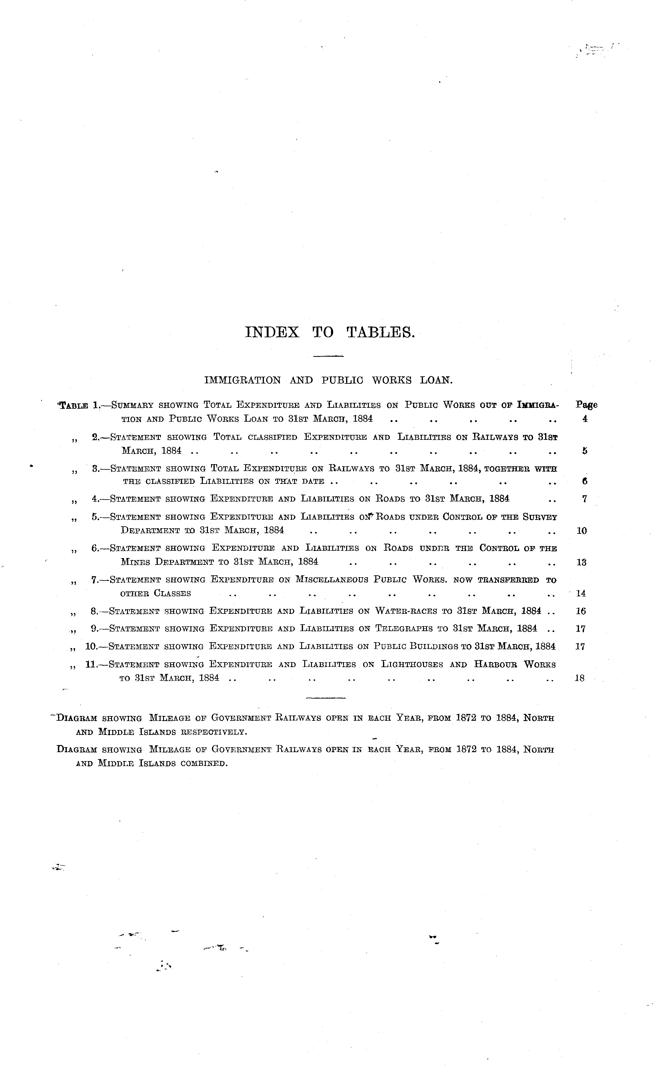 INDEX TO TABLES. IMMIGRATION AND PUBLIC WORKS LOAN. -tabhe I.—summary showing total expenditube and liabilities on public works out of immigra- page tion and Public Wobks Loan to 31st Mabch, 1884 .. .. .. .. .. 4 „ 2.—Statement showing Total classified Bxpenditube and Liabilities on Railways to 31st Mabch, 1884 .. .. .. .. .. .. .. .. .. .. 5 „ 3.—Statement showing Total Expenditueb on Railways to 31st Mabch, 1884, together with the classified liabilities on that date . . .. .. . . . . . . 6 „ 4. —Statement showing Expenditube and Liabilities on Roads to 31st Maech, 1884 .. 7 „ s.—Statement showing Expenditube and Liabilities on" Roads undeb Conteod of the Survey Depabtment to 31st Maech, 1884 .. .. .. .. .. .. .. 10 „ 6. —Statement showing Expenditube and Liabilities on Roads under the Control of the Mines Department to 31st Maech, 1884 .. .. .. .. .. .. 13 „ 7. —Statement showing Expenditube on Miscellaneous Public Woeks. now teansferred to othee Classes .. .. .. .. .. .. .. .. 14 „ 8. —Statement showing Expenditube and Liabilities on Water-races to 31st Mabch, 1884 .. 16 „ 9.—Statement showing Expenditure and Liabilities on Telegraphs to 31st Mabch, 1884 .. 17 „ 10.—Statement showing Expenditure and Liabilities on Public Buildings to 31st March, 1884 17 „ 11.—Statement showing Expenditure and Liabilities on Lighthouses and Harbour Works to 31st March, 1884 .. .. .. .. .. .. .. .. .. 18 Diagram showing Mileage of Government Railways open in each Year, feom 1872 to 1884, North and Middle Islands bespectively. Diagram showing Mileage of Government Railways open in each Year, from 1872 to 1884, Noeth and Middle Islands combined.