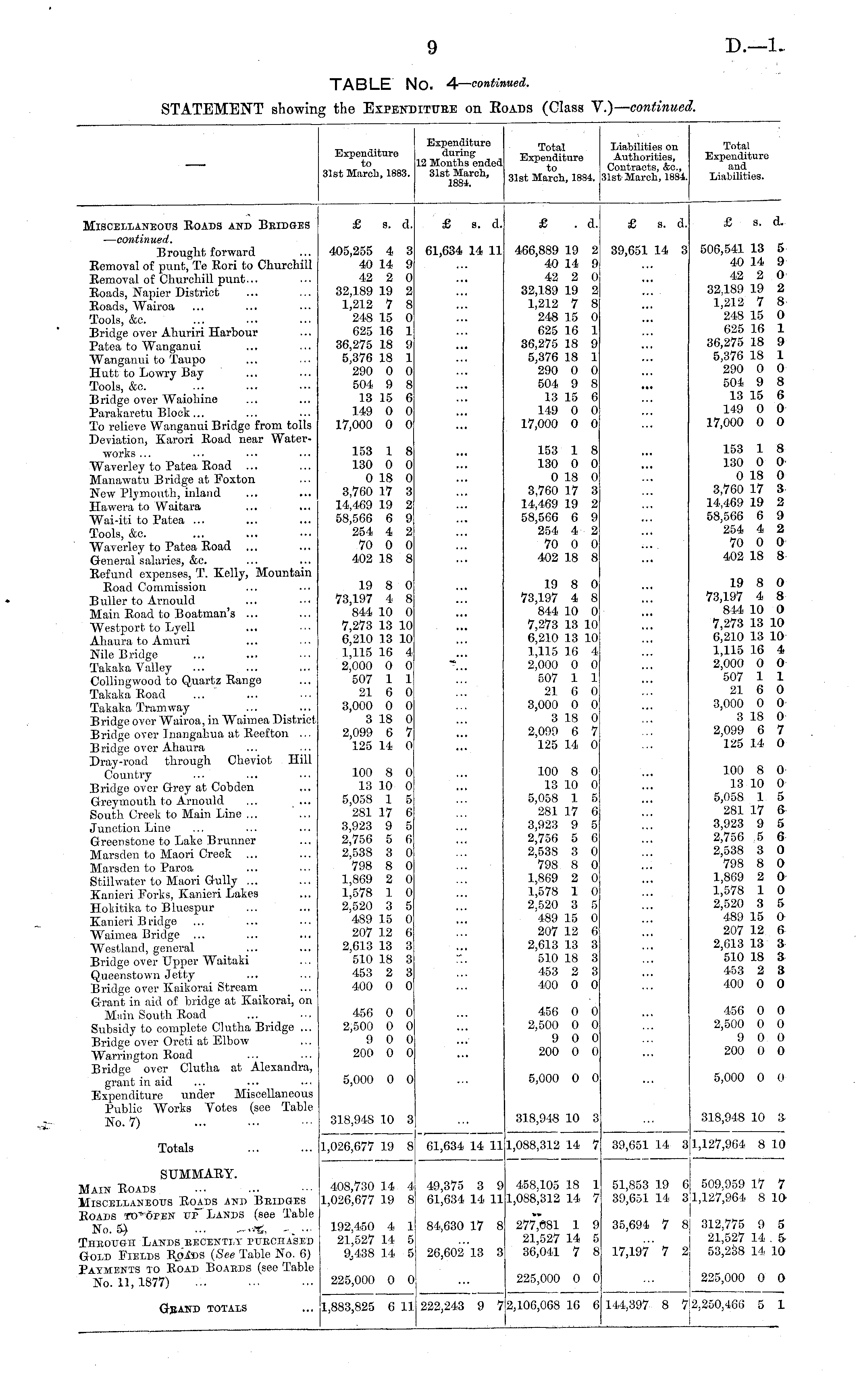 Expenditure to 31st March, 1883. Expenditure during 12 Months ended 31st March, 1884. Total Expenditure to 31st March, 1884. Liabilities on Authorities, Contracts, &c., 31st March, 1884. Total Expenditure and Liabilities. Miscellaneous Roads and Bridges — continued. Brought forward Removal of punt, Te Rori to Churchill Removal of Churchill punt... Roads, Napier District Roads, Wairoa Tools, &o. Bridge over Ahuriri Harbour Patea to Wanganui Wanganui to Taupo Hutt to Lowry Bay Tools, &o. Bridge over Waiohine Parakaretu Block... To relieve Wanganui Bridge from tolls Deviation, Karori Boad near Waterworks ... Waverley to Patea Road ... Manawatu Bridge at Foxton New Plymouth, inland Hawera to Waitara Wai-iti to Patea ... Tools, &c. Waverley to Patea Road ... General salaries, &c. Refund expenses, T. Kelly, Mountain Road Commission B uller to Arnould Main Road to Boatman's ... Westport to Lyell Ahaura to Amuri Nile Bridge Takaka Valley Collingwood to Quartz Bange Takaka Road Takaka Tramway Bridge over Wairoa, in Waimea District Bridge over Inangahua at Eeefton ... Bridge over Ahaura Dray-road through Cheviot Hill Country Bridge over G-rey at Cobden Greymouth to Arnould ... ... South Creek to Main Line ... Junction Line Greenstone to Lake Brunner Marsden to Maori Creek ... Marsden to Baroa Stillwater to Maori Gully ... Kanieri Forks, Kanieri Lakes Hokitika to Bluespur Kanieri Bridge Waimea Bridge ... Westland, general Bridge over Upper Waitaki Queenstown Jetty Bridge over Kaikorai Stream Grant in aid of bridge at Kaikorai, on Mnin South Boad Subsidy to complete Clutha Bridge ... Bridge over Orcti at Elbow Warrington Boad Bridge over Clutha at Alexandra, grant in aid Expenditure under Miscellaneous Public Works Votes (see Table No. 7) £ s. d. 405,255 4 3 40 14 9 42 2 0 32,189 19 2 1,212 7 8 248 15 0 625 16 1 36,275 18 9 5,376 18 1 290 0 0 504 9 8 13 15 6 149 0 0 17,000 0 0 153 1 8 130 0 0 0 18 0 3,760 17 3 14,469 19 2 58,566 6 9 254 4. 2 70 0 0 402 18 8 19 8 0 73,197 4 8 844 10 0 7,273 13 10 6,210 13 10 1,115 16 4 2,000 0 0 507 1 1 21 6 0 3,000 0 0 3 18 0 2,099 6 7 125 14 0 £ s. d. 61,634 14 11 £ . d. 466,889 19 2 40 14 9 42 2 0 32,189 19 2 1,212 7 8 248 15 0 625 16 1 36,275 18 9 5,376 18 1 290 0 0 504 9 8 13 15 6 149 0 0 17,000 0 0 153 1 8 130 0 0 0 18 0 3,760 17 3 14,469 19 2 58,566 6 9 254 4 2 70 0 0 402 18 8 19 8 0 73,197 4 8 844 10 0 7,273 13 10 6,210 13 10 1,115 16 4 2,000 0 0 507 1 1 21 0 0 3,000 0 0 3 18 0 2,099 6 7 125 14 0 £ s. d. 39,651 14 3 £ s. d. 506,541 13 5 40 14 9 42 2 0 32,189 19 2 1,212 7 8 248 15 0 625 16 1 36,275 18 9 5,376 18 1 290 0 0 504 9 8 13 15 6 149 0 0 17,000 0 0 153 1 8 130 0 0 0 18 0 3,760 17 3 14,409 19 2 58,566 6 9 254 4 2 70 0 0 402 18 8 19 8 0 73,197 4 8 844 10 0 7,273 13 10 6,210 13 10 1,115 16 4 2,000 0 0 507 1 1 21 6 0 3,000 0 0 3 18 0 2,099 6 7 125 14 0 100 8 0 13 10 0 5,038 1 5 281 17 6 3,923 9 5 2,756 5 6 2,538 3 0 798 8 0 1,869 2 0 1,578 1 0 2,520 3 5 489 15 0 207 12 0 2,613 13 3 510 18 3 453 2 3 400 0 0 100 8 0 13 10 0 5,058 1 5 281 17 6 3,923 9 5 2,756 5 6 2,538 3 0 798 8 0 1,869 2 0 1,578 1 0 2,520 3 5 489 15 0 207 12 6 2,613 13 3 510 18 3 453 2 3 400 0 0 100 8 0 13 10 0 5,058 1 5 281 17 6 3,923 9 5 2,756 5 6 2,538 3 0 798 8 0 1,809 2 0 1,578 1 0 2,520 3 5 489 15 O 207 12 6 2,613 13 3 510 18 3 453 2 3 400 0 0 456 0 0 2,500 0 0 9 0 0 200 0 0 456 0 0 2,500 0 0 9 0 0 200 0 0 I 456 0 0 2,500 0 0 9 0 0 200 0 0 5,000 0 0 5,000 0 0 5,000 0 0 318,948 10 3 318,948 10 3 318,948 10 3 Totals 1,026,677 19 8 61,634 14 11 1,088,312 14 7: 39,651 14 3 1,127,964 8 10 SUMMARY. Main Roads Miscellaneous Roads and Bkidoes Roads to open up Lands (see Table No. 5) ..-S. -„ .,.■ Thbou&k Lands eecently pttbchased Gold Fields Bolus (See Table No. 6) Payments to Boad Boaeds (see Table No. 11, 1877) 408,730 14 4 1,026,677 19 8 49,375 3 9 61,634 14 11 458,105 18 1 1,088,312 14 7 51,853 19 6 39,651 14 3 509,959 17 7 1,127,964 8 10 192,450 4 1 21,527 14 5 9j438 14 5 84,630 17 8 277,081 1 9 21,527 14 5 36,041 7 8 35,694 7 8 312,775 9 5 21,527 14 . 5 53,238 14 10 26,602 13 3 17,197 7 2 225,000 0 0 225,000 0 0 225,000 0 0 Gband totals 1,883,825 6 llj 222,243 9 7: |2,106,008 16 6 144,397 8 7 !2,250,466 5 1