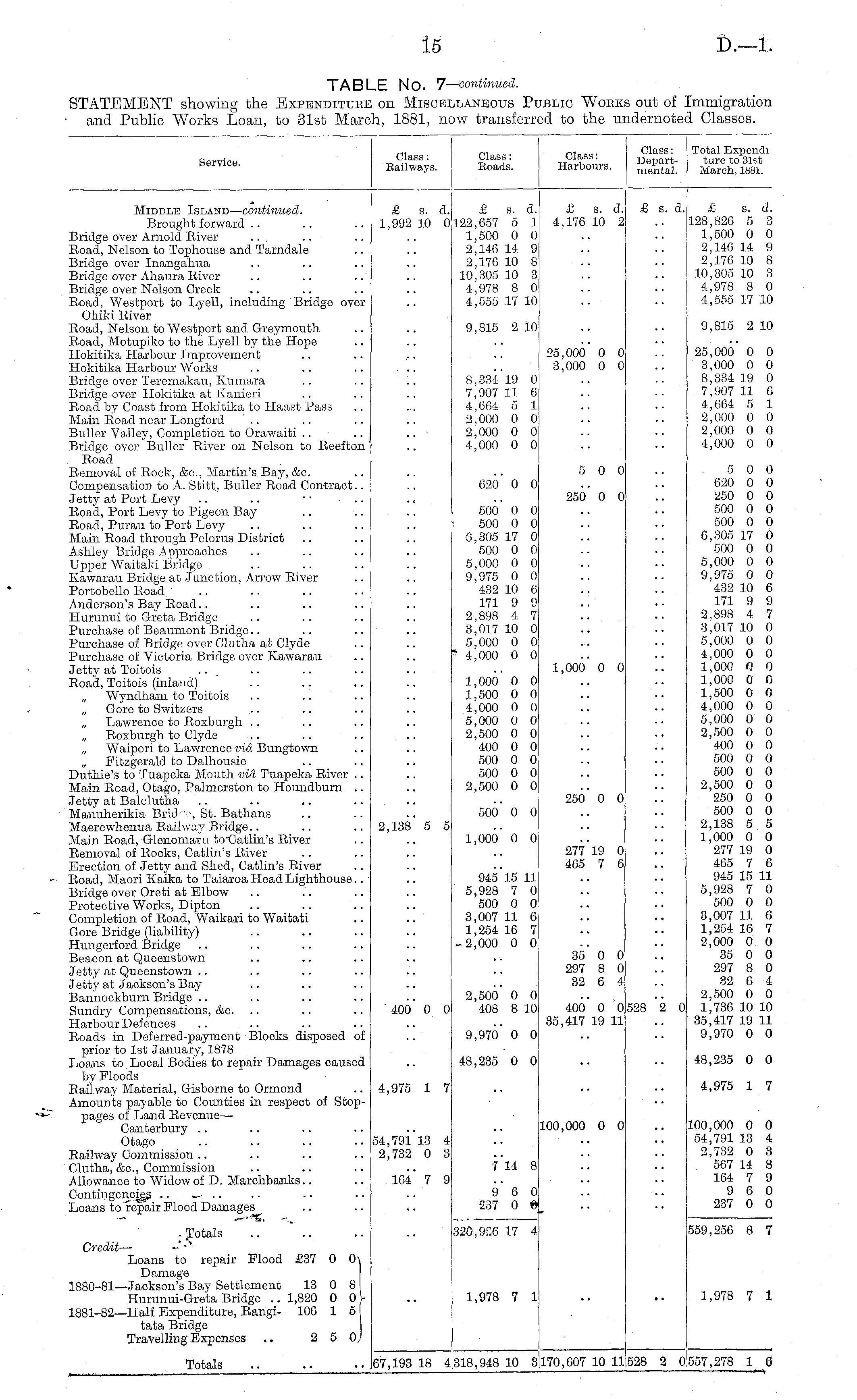 TABLE No. 7 — continued. STATEMENT showing the Expenditure on Miscellaneous Public Works out of Immigration and Public Works Loan, to 31st March, 1881, now transferred to the undernoted Classes.