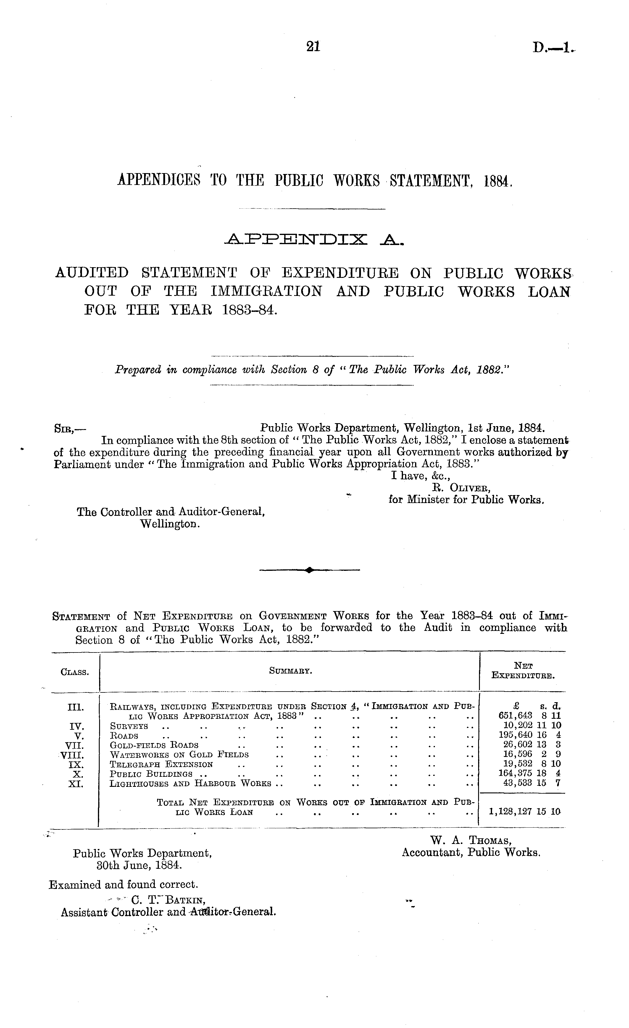 Class. Summary. Net Expenditure. III. Bailways, including Expenditube undeb Section 4, " Immigration and Public Wobks Appbopbiation Act, 1883 " .. £ s. a. 651,643 8 11 10,202 11 10 195,640 16 A 26,602 13 3 16,596 2 9 19.532 8 10 164,375 18 A 43.533 15 7 IV. V. VII. VIII. IX. X. XL SUEVEYS Boads GoLD-EIELDS BOADS . . . . Waterworks on Gold Fields .. .. Telegbaph Extension Public Buildings Lighthouses and Harbour Works Total Net Expenditure on Works out op Immigration and Public Works Loan 1,128,127 15 10 Public Works Department, 30th June, 1884. W. A. T: Accountant, Pi IOMAS, iblic Works. Ixamined and found correct. O T. Batkin, Assistant Controller and Auditor-General.