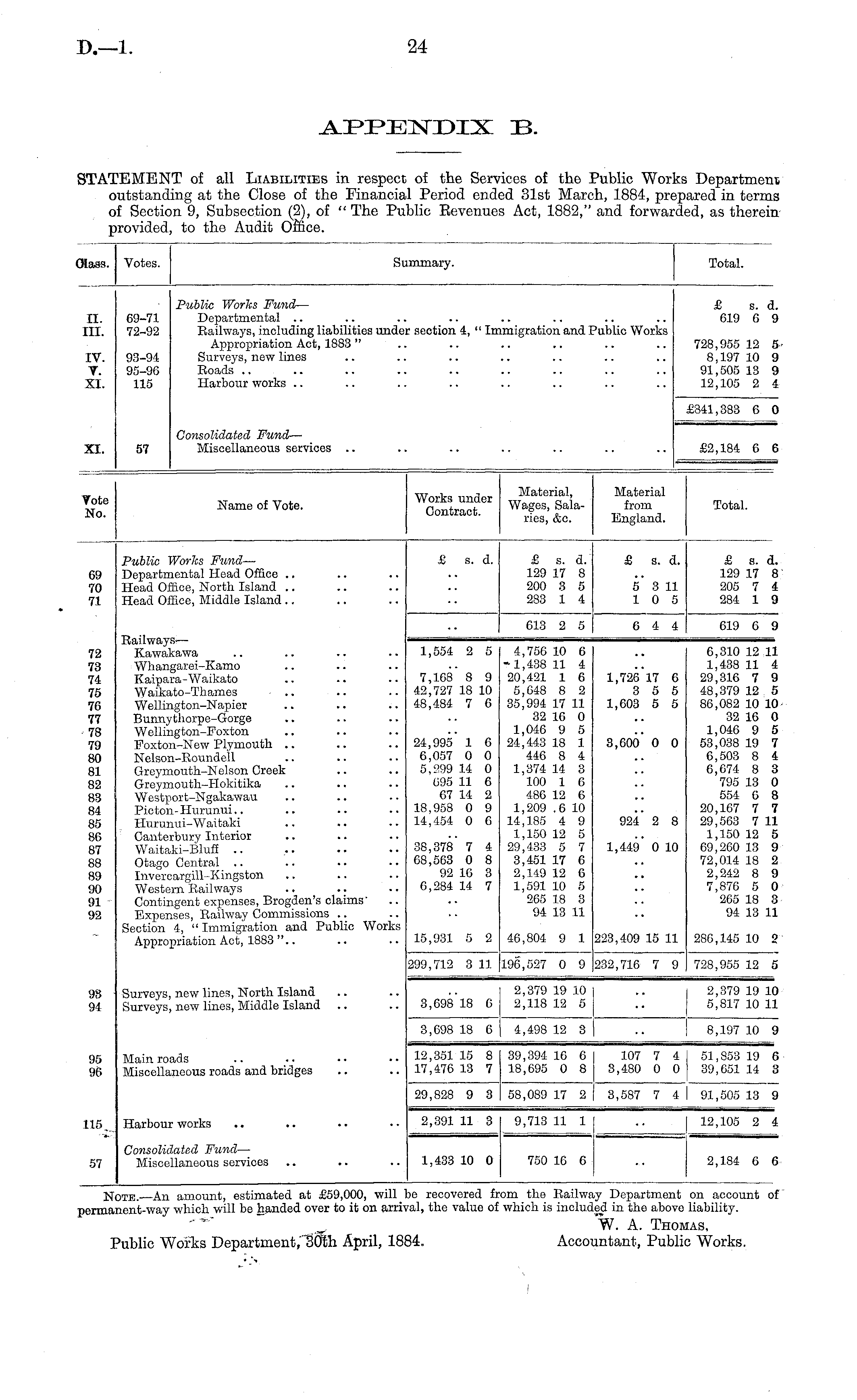 APPENDIX B. STATEMENT of all Liabilities in respect of the Services of the Public Works Department outstanding at the Close of the Financial Period ended 31st March, 1884, prepared in terms of Section 9, Subsection (2), of "The Public Revenues Act, 1882," and forwarded, as therein provided, to the Audit Office.