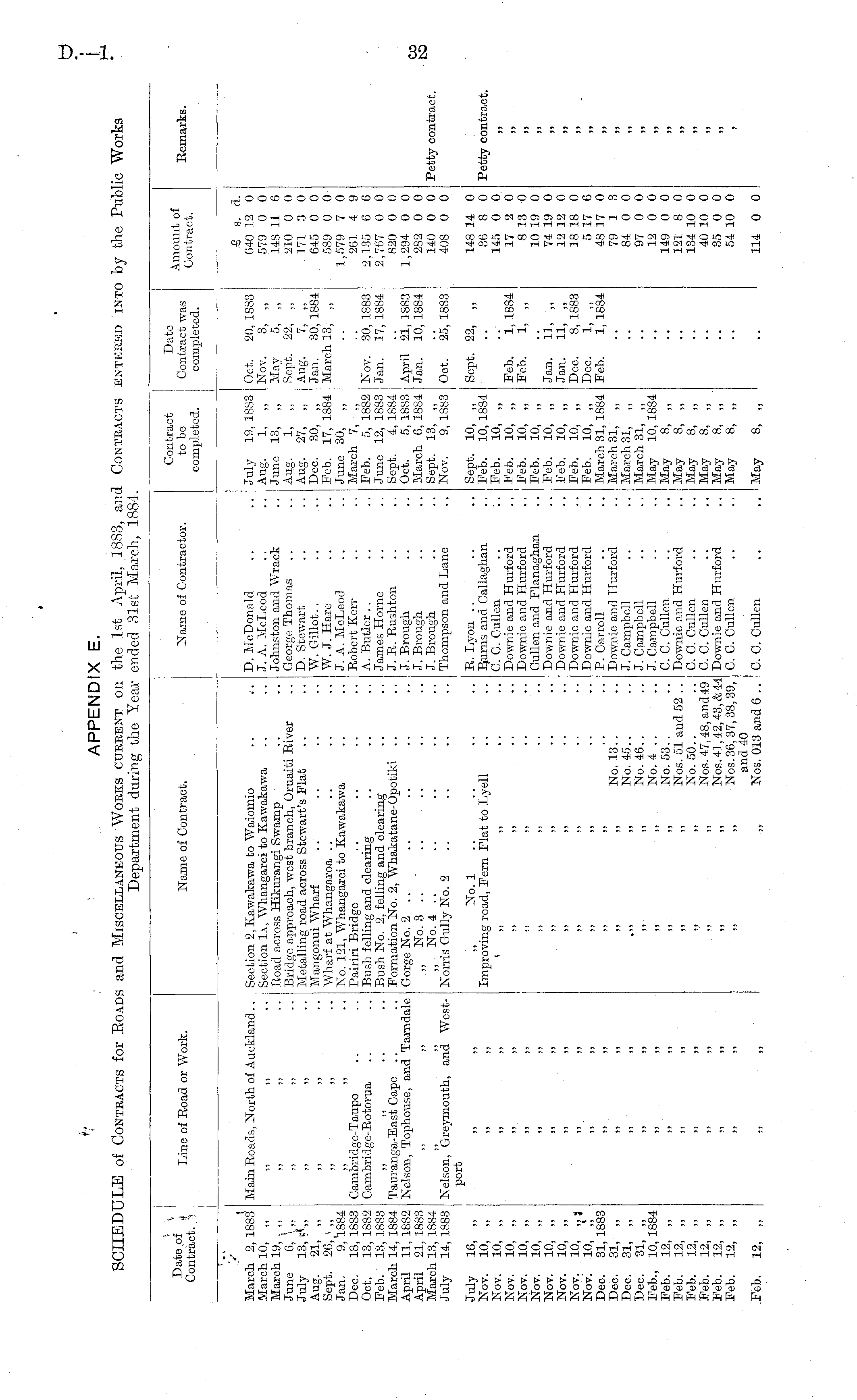 APPENDIX E. SCHEDULE of Contracts for Roads and Miscellaneous Works current on the 1st April, 1883, and Contracts entered into by the Public Works Department during the Year ended 31st March, 1884.