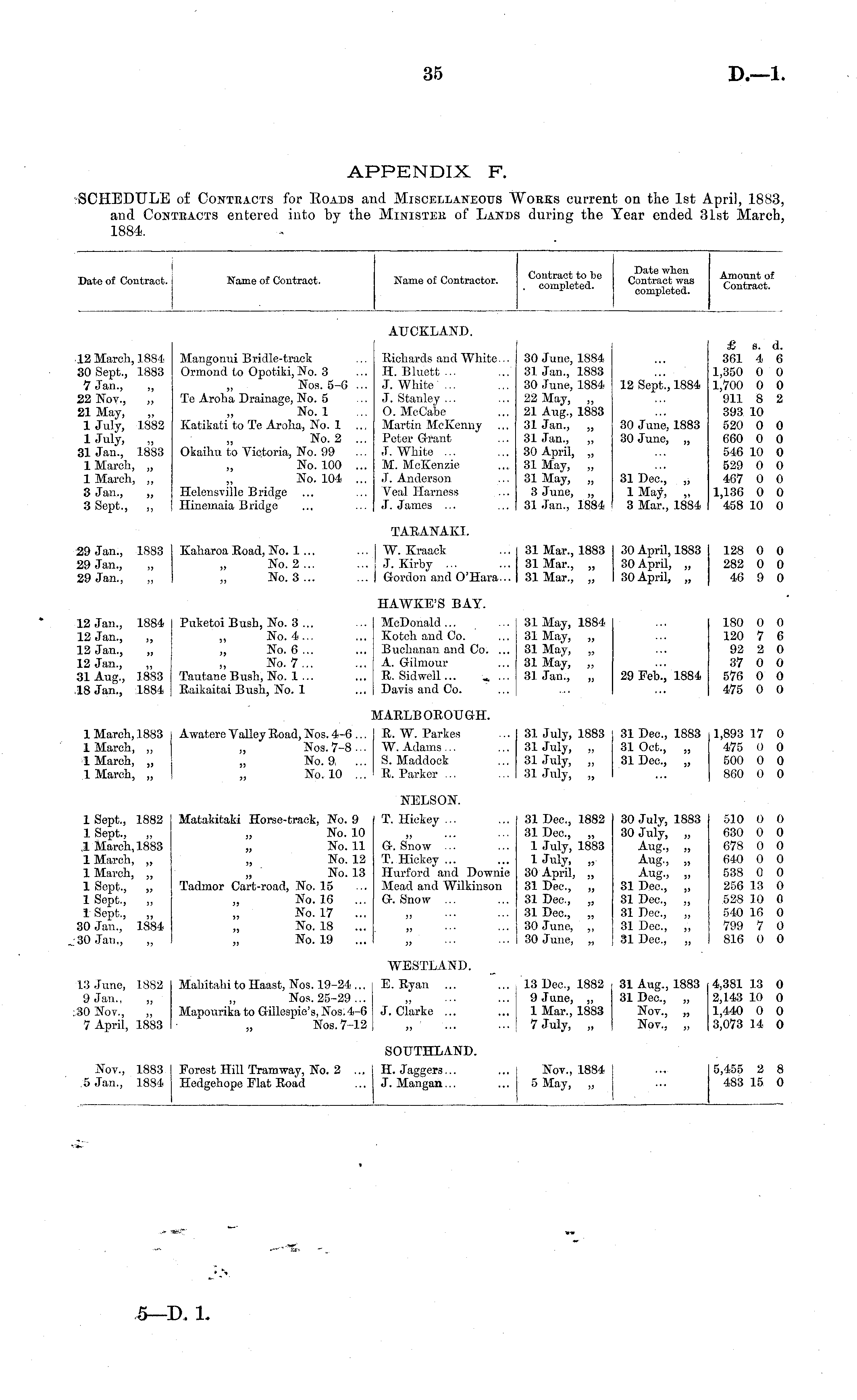 APPENDIX F. SCHEDULE of Contracts for Roads and Miscellaneous Works current on the 1st April, 1883, and Contracts entered into by the Minister of Lands during the Tear ended 31st March, 1884.