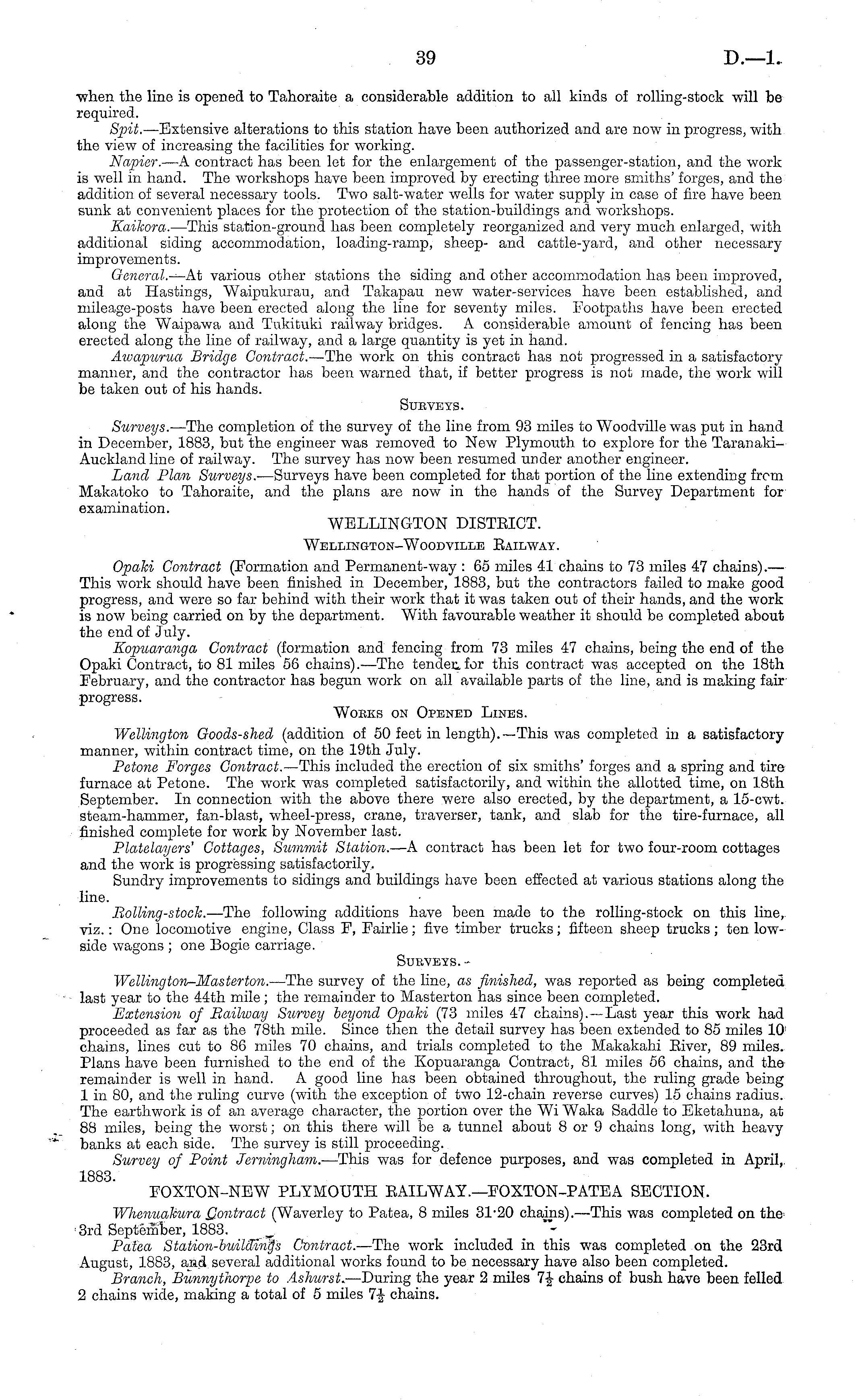 when the line is opened to Tahoraite a considerable addition to all kinds of rolling-stock will be required. Spit. —Extensive alterations to this station have been authorized and are now in progress, with the view of increasing the facilities for working. Napier. —A contract has been lot for the enlargement of the passenger-station, and the work is well in hand. The workshops have been improved by erecting three more smiths' forges, and the addition of several necessary tools. Two salt-water wells for water supply in case of fire have been sunk at convenient places for the protection of the station-buildings and workshops. Kaikora. —This station-ground has been completely reorganized and very much enlarged, with additional siding accommodation, loading-ramp, sheep- and cattle-yard, and other necessary improvements. General.— At various other stations the siding and other accommodation has been improved, and at Hastings, Waipukurau, and Takapau new water-services have been established, and mileage-posts have been erected along the line for seventy miles. Footpaths have been erected along the Waipawa and Tukituki railway bridges. A considerable amount of fencing has been erected along the line of railway, and a large quantity is yet in hand. Awapurua Bridge Contract. —The work on this contract has not progressed in a satisfactory manner, and the contractor has been warned that, if better progress is not made, the work will be taken out of his hands. Sueveys. Surveys. —The completion of the survey of the line from 93 miles to Woodville was put in hand in December, 1883, but the engineer was removed to New Plymouth to explore for the TaranakiAuckland line of railway. The survey has now been resumed under another engineer. Land Plan Surveys.' —Surveys have been completed for that portion of the line extending from Makatoko to Tahoraite, and the plans are now in the hands of the Survey Department for examination. WELLINGTON DISTRICT. Weleington-Woodville Eailway. Opaki Contract (Formation and Permanent-way : 65 miles 41 chains to 73 miles 47 chains). — This work should have been finished in December, 1883, but the contractors failed to make good progress, and were so far behind with their work that it was taken out of their hands, and the work is now being carried on by the department. With favourable weather it should be completed about the end of July. Kopuaranga Contract (formation and fencing from 73 miles 47 chains, being the end of the Opaki Contract, to 81 miles 56 chains). —The tender for this contract was accepted on the 18th February, and the contractor has begun work on all available parts of the line, and is making fair progress. Wobks on Opened Lines. Wellington Goods-shed (addition of 50 feet in length).—This was completed in. a satisfactory manner, within contract time, on the 19th July. Petone Forges Contract. —This included the erection of six smiths' forges and a spring and tire furnace at Petone. The work was completed satisfactorily, and within the allotted time, on 18th September. In connection with the above there were also erected, by the department, a 15-cwt. steam-hammer, fan-blast, wheel-press, crane, traverser, tank, and slab for the tire-furnace, all finished complete for work by November last. Platelayers' Cottages, Summit Station. —A contract has been let for two four-room cottages and the work is progressing satisfactorily. Sundry improvements to sidings and buildings have been effected at various stations along the line. Rolling-stock. —The following additions have been made to the rolling-stock on this line, viz.: One locomotive engine, Class F, Fairlie; five timber trucks; fifteen sheep trucks; ten lowside wagons ; one Bogie carriage. Sueveys. Welling ton-Mas ter ton. —The survey of the line, as finished, was reported as being completed last year to the 44th mile; the remainder to Masterton has since been completed. Extension of Raihoay Survey beyond Opaki (73 miles 47 chains).—Last year this work had proceeded as far as the 78th mile. Since then the detail survey has been extended to 85 miles 10: chains, lines cut to 86 miles 70 chains, and trials completed to the Makakahi Eiver, 89 miles. Plans have been furnished to the end of the Kopuaranga Contract, 81 miles 56 chains, and the remainder is well in hand. A good line has been obtained throughout, the ruling grade being 1 in 80, and the ruling curve (with the exception of two 12-chain reverse curves) 15 chains radius. The earthwork is of an average character, the portion over the Wi Waka Saddle to Ekotahuna, at 88 miles, being the worst; on this there will be a tunnel about Bor 9 chains long, with heavy banks at each side. The survey is still proceeding. Survey of Point Jerningham. —This was for defence purposes, and was completed in April,. 1883. FOXTON-NEW PLYMOUTH EAILWAY.—FOXTON-PATEA SECTION. Wlienuakura Qontract (Waverley to Patea, 8 miles 31-20 chains). —This was completed on the 3rd September, 1883. Patea Station-buildings Contract. —The work included in this was completed on the 23rd August, 1883, and several additional works found to be necessary have also been completed. Branch, Bunnythorpe to Ashurst. —During the year 2 miles 7J chains of bush have been felled 2 chains wide, making a total of 5 miles 7-J chains.