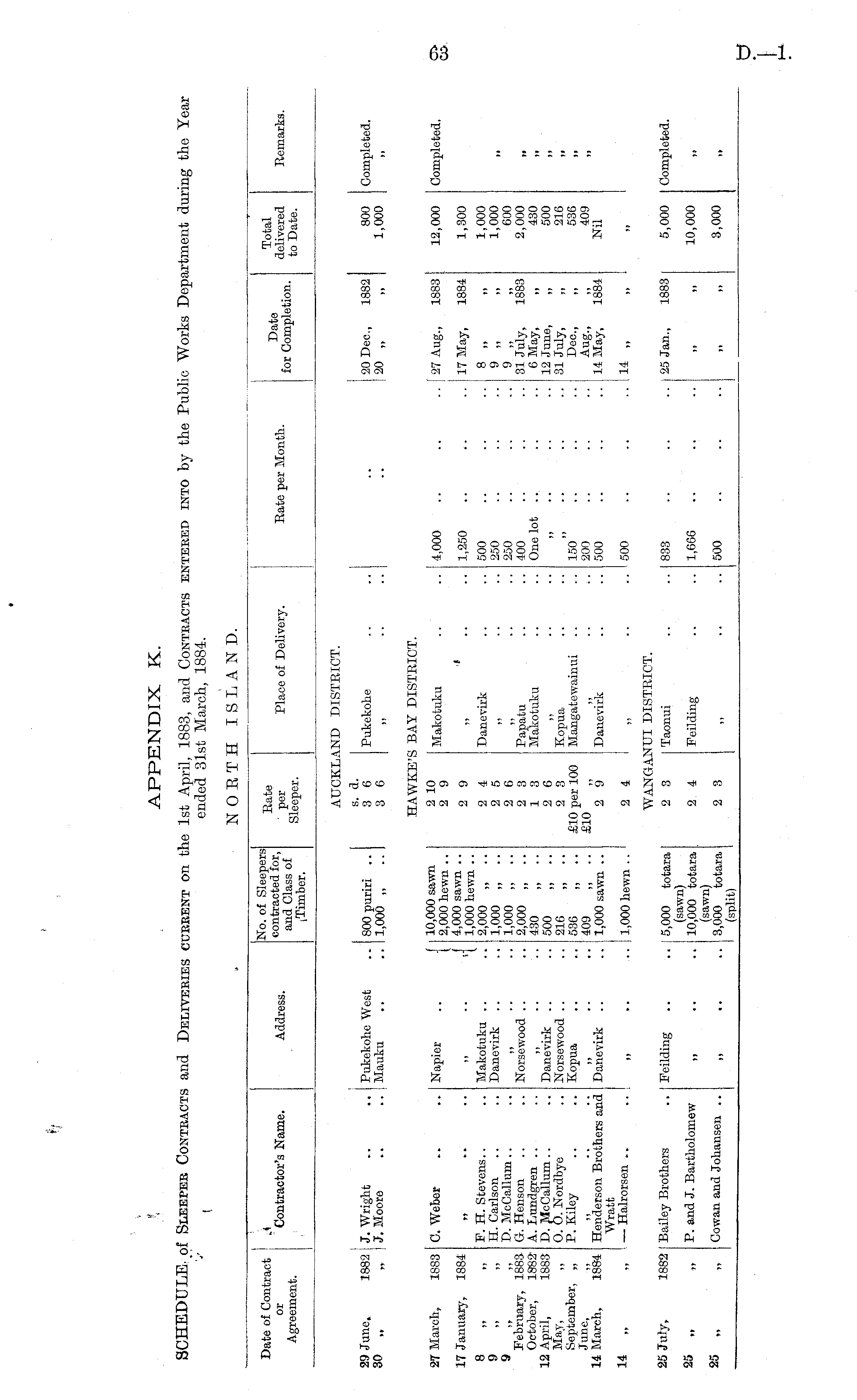 APPENDIX K. SCHEDULE of Sleeper Contracts and Deliveries current on the 1st April, 1883, and Contracts entered into by the Public Works Department during the Year ended 31st March, 1884. NORTH ISLAND.