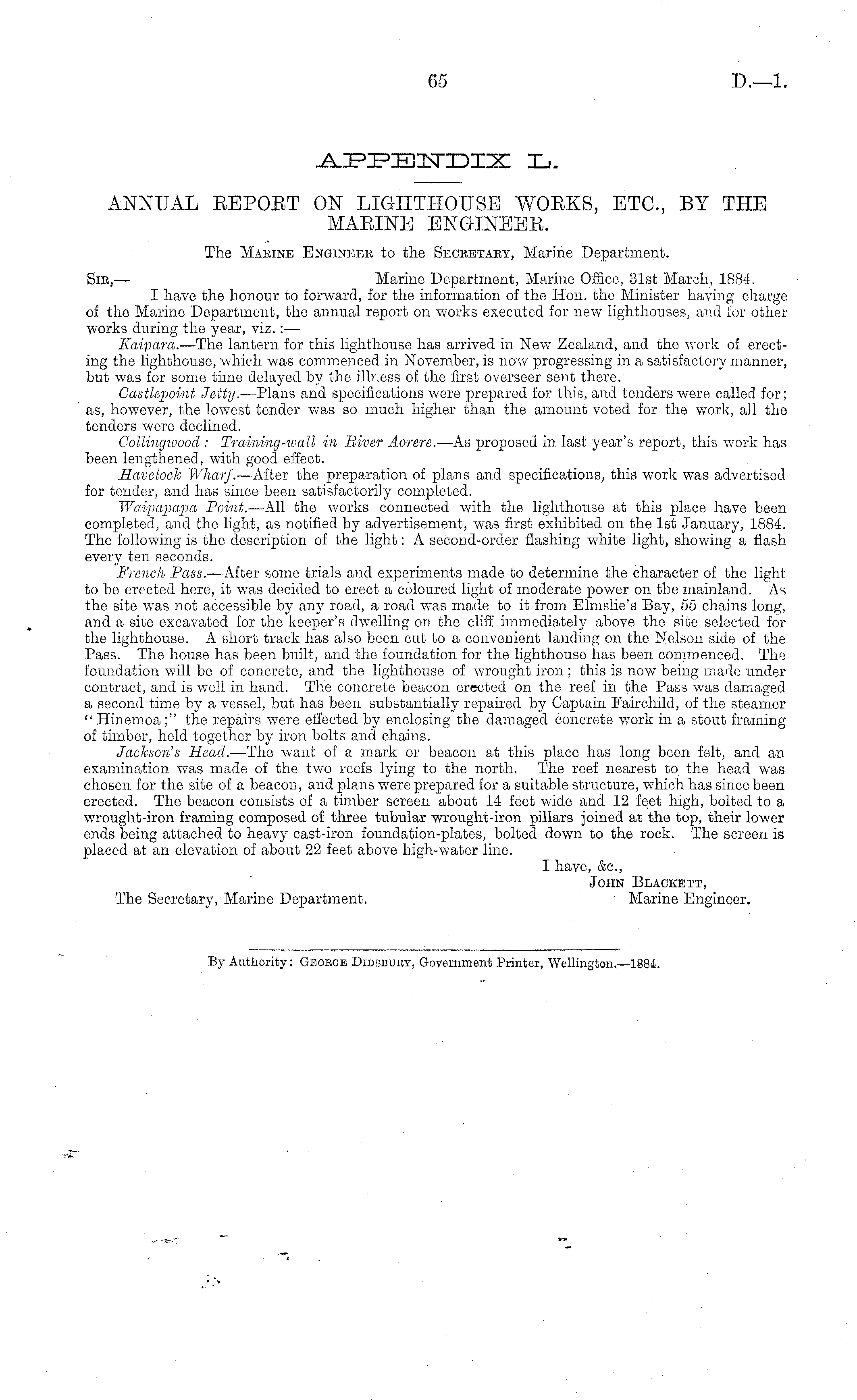 .A-iPiPiEnNriDix: l. ANNUAL EEPOET ON LIGHTHOUSE WOEKS, ETC., BY THE MAEINE ENGINEEE. The Maeine Engineeb to the Seceetaey, Marine Department. Sie, — Marine Department, Marine Office, 31st March, 1884. I have the honour to forward, for the information of the Hon. the Minister having charge of the Marine Department, the annual report on works executed for new lighthouses, and for other works during the year, viz.: — Kaipara. —The lantern for this lighthouse has arrived in New Zealand, and the work of erecting the lighthouse, which was commenced in November, is now progressing in a satisfactory manner, but was for some time delayed by the illness of the first overseer sent there. Castlepoint Jetty. —Plans and specifications were prepared for this, and tenders were called for; as, however, the lowest tender was so much higher than the amount voted for the work, all the tenders were declined. Collingiooocl: Training-wall in River Aorere. —As proposed in last year's report, this work has been lengthened, with good effect. Havelock Wharf. —After the preparation of plans and specifications, this work was advertised for tender, and has since been satisfactorily completed. Waipapapa Point. —All the works connected with the lighthouse at this place have been completed, and the light, as notified by advertisement, was first exhibited on the Ist January, 1884. The following is the description of the light: A second-order flashing white light, showing a flash every ten seconds. French Pass. —After some trials and experiments made to determine the character of the light to be erected here, it was decided to erect a coloured light of moderate power on the mainland. As the site was not accessible by any road, a road was made to it from Elmslie's Bay, 55 chains long, and a site excavated for the keeper's dwelling on the cliff immediately above the site selected for the lighthouse. A short track has also been cut to a convenient landing on the Nelson side of the Pass. The house has been built, and the foundation for the lighthouse has been commenced. The foundation will bo of concrete, and the lighthouse of wrought iron; this is now being made under contract, and is well in hand. The concrete beacon erected on the reef in the Pass was damaged a second time by a vessel, but has been substantially repaired by Captain Fairchild, of the steamer "Hinemoa;" the repairs were effected by enclosing the damaged concrete work in a stout framing of timber, held together by iron bolts and chains. Jackson's Head. —The want of a mark or beacon at this place has long been felt, and an examination was made of the two reefs lying to the north. The reef nearest to the head was chosen for the site of a beacon, and plans were prepared for a suitable structure, which has since been erected. The beacon consists of a timber screen about 14 feet wide and 12 feet high, bolted to a wrought-iron framing composed of three tubular wrought-iron pillars joined at the top, their lower ends being attached to heavy cast-iron foundation-plates, bolted down to the rock. The screen is placed at an elevation of about 22 feet above high-water line. I have, &c, John Blackett, The Secretary, Marine Department. Marine Engineer.