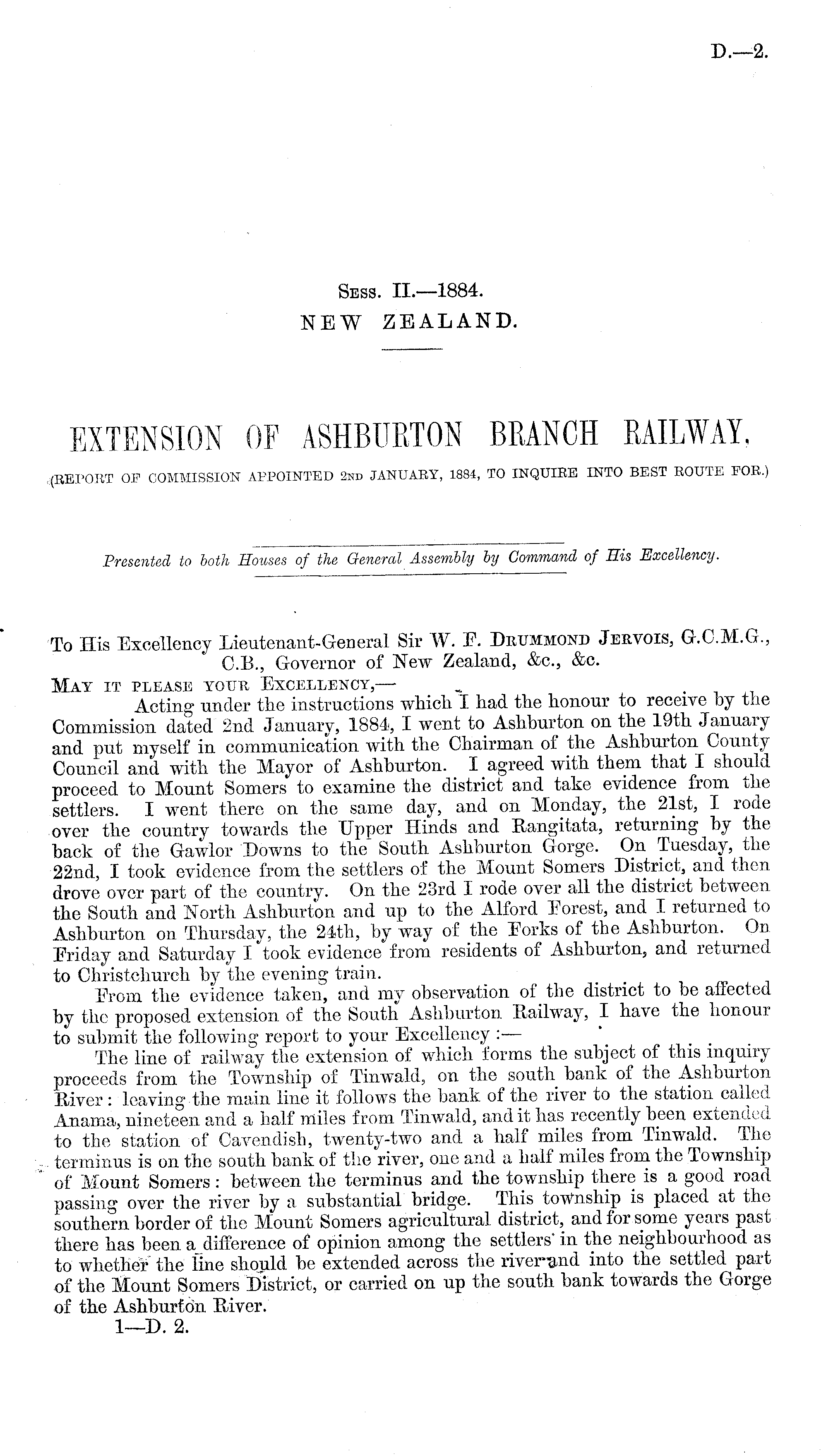 EXTENSION OF ASHBURTON BRANCH RAILWAY, (REPORT OF COMMISSION APPOINTED 2nd JANUARY, 1884, TO INQUIRE INTO BEST ROUTE FOR.)