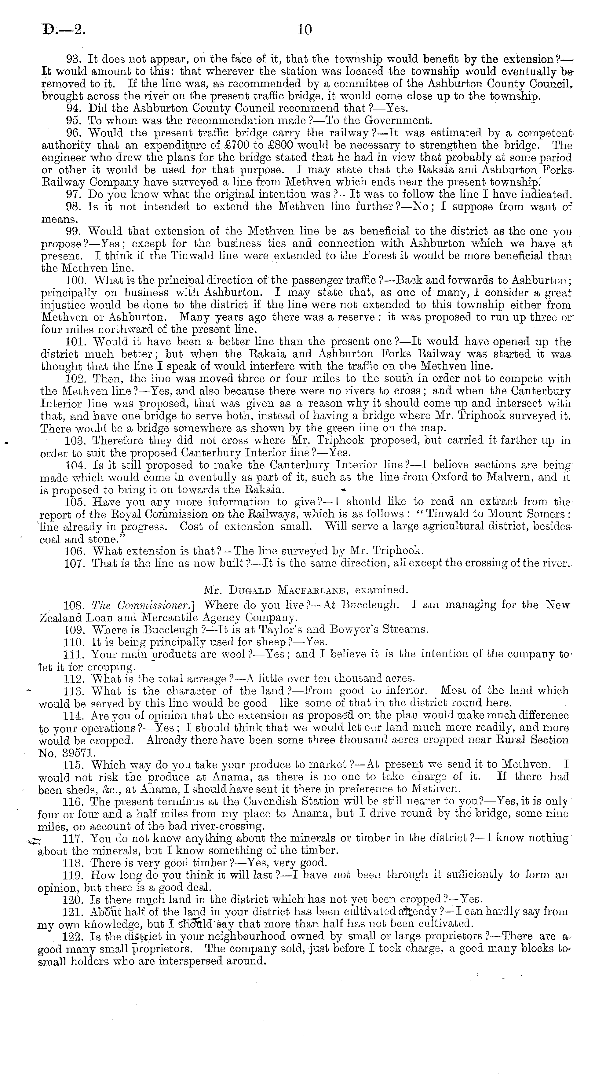 93. It does not appear, on the face of it, that the township would benefit by the extension?—It would amount to this: that wherever the station was located the township would eventually be removed to it. If the line was, as recommended by a committee of the Ashburton County Council,, brought across the river on the present traffic bridge, it would come close up to the township. 94. Did the Ashburton County Council recommend that ?—Yes. 95. To whom was the recommendation made?—To the Government. 96. Would the present traffic bridge carry the railway ?—lt was estimated by a competent authority that an expenditure of £700 to £800 would be necessary to strengthen the bridge. The engineer who drew the plans for the bridge stated that he had in view that probably at some period or other it would be used for that purpose. I may state that the Bakaia and Ashburton Forks Bailway Company have surveyed a line from Methven which ends near the present township. 97. Do you know what the original intention was ?—lt was to follow the line I have indicated. 98. Is it not intended to extend the Methven line further ?—No; I suppose from want of means. 99. Would that extension of the Methven line be as beneficial to the district as the one you propose ?—Yes; except for the business ties and connection with Ashburton which we have at present. I think if the Tinwald line were extended to the Forest it would be more beneficial than the Methven line. 100. What is the principal direction of the passenger traffic ?—Back and forwards to Ashburton; principally on business with Ashburton. I may state that, as one of many, I consider a great injustice would be done to the district if the line were not extended to this township either from Methven or Ashburton. Many years ago there was a reserve : it was proposed to run up three or four miles northward of the present line. 101. Would it have been a better line than the present one?—lt would have opened up the district much better; but when the Bakaia and Ashburton Forks Bailway was started it was thought that the line I speak of would interfere with the traffic on the Methven line. 102. Then, the line was moved three or four miles to the south in order not to compete with the Methven line ? —Yes, and also because there were no rivers to cross; and when the Canterbury Interior line was proposed, that was given as a reason why it should come up and intersect with that, and have one bridge to serve both, instead of having a bridge where Mr. Triphook surveyed it. There would be a bridge somewhere as shown by the green lineon the map. 103. Therefore they did not cross where Mr. Triphook proposed, but carried it farther up in order to suit the proposed Canterbury Interior line ?—Yes. 104. Is it still proposed to make the Canterbury Interior line? —I believe sections are being' made which would come in eventully as part of it, such as the line from Oxford to Malvern, and it is proposed to bring it on towards the Bakaia. 105. Have you any more information to give ? —I should like to read an extract from the report of the Boyal Commission on theßailways, which is as follows : " Tinwald to Mount Somers : line already in progress. Cost of extension small. Will serve a large agricultural district, besidescoal and stone." 106. What extension is that?— The line surveyed by Mr. Triphook. 107. That is the line as now built? —It is the same direction, all except the crossing of the river. Mr. Dugald Macfaelane, examined. 108. The Commissioner^] Where do you live?—-At Buccleugh. lam managing for the New Zealand Loan and Mercantile Agency Company. 109. Where is Buccleugh ?—lt is at Taylor's and Bowyer's Streams. 110. It is being principally used for sheep ?—Yes. 111. Your main products are wool ?—Yes ; and I believe it is the intention of the company to' let it for cropping. 112. What is the total acreage ? —A little over ten thousand acres. 113. What is the character of the land ?—From good to inferior. Most of the land which would be served by this line would be good—like some of that in the district round here. 114. Are you of opinion that the extension as proposed on. the plan would make much difference to your operations ? —Yes; I should think that we would let our land much more readily, and more would be cropped. Already there have been some three thousand acres cropped near Bural Section No. 39571. 115. Which way do you take your produce to market ?—At present we send it to Methven. I would not risk the produce at Anama, as there is no one to take charge of it. If there had been sheds, &c, at Anama, I should have sent it there in preference to Methven. 116. The present terminus at the Cavendish Station will be still nearer to you? —Yes, it is only four or four and a half miles from my place to Anama, but I drive round by the bridge, some nine miles, on account of the bad river-crossing. 117. You do not know anything about the minerals or timber in the district ?—I know nothing about the minerals, but I know something of the timber. 118. There is very good timber ? —Yes, very good. 119. How long do you think it will last ? —I have not been through it sufficiently to form an opinion, but there is a good deal. 120. Is there much land in the district which has not yet been cropped?— Yes. 121. About half of the land in your district has been cultivated a'tr.eady ?—I can hardly say from my own knowledge, but I Shottld "say that more than half has not been cultivated. 122. Is the district in your neighbourhood owned by small or large proprietors ?—There are a good many small proprietors. The company sold, just before I took charge, a good many blocks to small holders who are interspersed around.