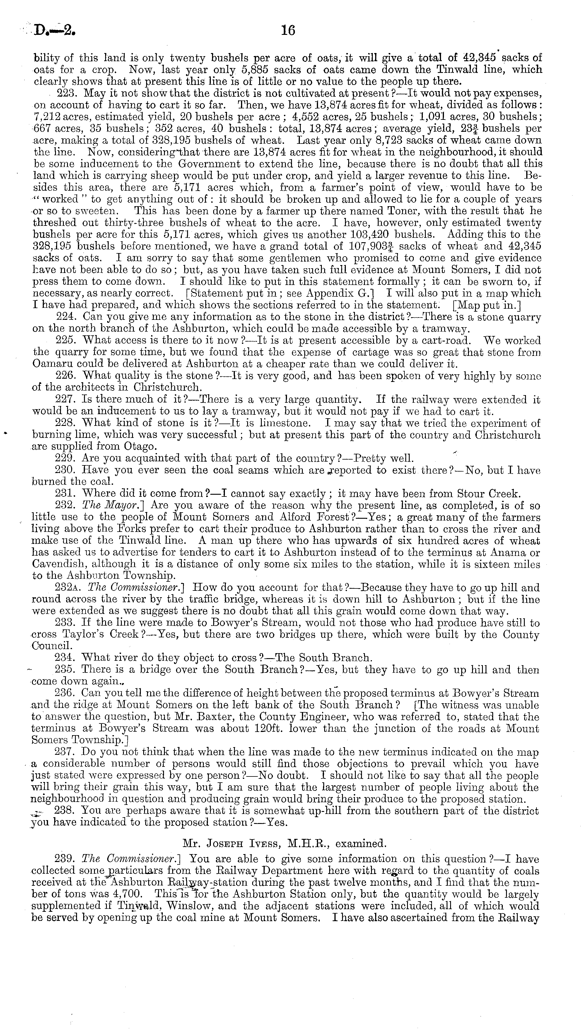 bility of this land is only twenty bushels per acre of oats, it will give a total of 42,345 sacks of oats for a crop. Now, last year only 5,885 sacks of oats came down the Tinwald line, which clearly shows that at present this line is of little or no value to the people up there. ■ 223. May it not show that the district is not cultivated at present ? —lt would not pay expenses, on account of having to cart it so far. Then, we have 13,874 acres fit for wheat, divided as follows : 7,2l2acres, estimated yield, 20 bushels per acre ; 4,552 acres, 25 bushels; 1,091 acres, 30 bushels; 667 acres, 35 bushels; 352 acres, 40 bushels : total, 13,874 acres; average yield, 23f bushels per acre, making a total of 328,195 bushels of wheat. Last year only 8,723 sacks of wheat came down the line. Now, considering that there are 13,874 acres fit for wheat in the neighbourhood, it should he some inducement to the Government to extend the line, because there is no doubt that all this land which is carrying sheep would be put under crop, and yield a larger revenue to this line. Besides this area, there are 5,171 acres which, from a farmer's point of view, would have to be " worked " to get anything out of : it should be broken up and allowed to lie for a couple of years or so to sweeten. This has been done by a farmer up there named Toner, with the result that he threshed out thirty-three bushels of wheat to the acre. I have, however, only estimated twenty bushels per acre for this 5,171 acres, which gives us another 103,420 bushels. Adding this to the 328,195 bushels before mentioned, we have a grand total of 107,903f sacks of wheat and 42,345 sacks of oats. lam sorry to say that some gentlemen who promised to come and give evidence have not been able to do so ; but, as you have taken such full evidence at Mount Somers, I did not press them to come down. I should like to put in this statement formally ;it can be sworn to, if necessary, as nearly correct. [Statement put in ; see Appendix G.] I will also put in a map which I have had prepared, and which shows the sections referred to in the statement. [Map put in.] 224. Can you give me any information as to the stone in the district ?—There is a stone quarry on the north branch of the Ashburton, which could be made accessible by a tramway. 225. What access is there to it now ? —lt is at present accessible by a cart-road. We worked the quarry for some time, but we found that the expense of cartage was so great that stone from Oamaru could be delivered at Ashburton at a cheaper rate than we could deliver it. 226. What quality is the stone ?—lt is very good, and has been spoken of very highly by some of the architects in Christchurch. 227. Is there much of it ?—There is a very large quantity. If the railway were extended it would be an inducement to us to lay a tramway, but it would not pay if we had to cart it. 228. What kind of stone is it ? —lt is limestone. I may say that we tried the experiment of burning lime, which was very successful; but at present this part of the country and Christchurch are supplied from Otago. 229. Are you acquainted with that part of the country? —Pretty well. 230. Have you ever seen the coal seams which are reported to exist there?—No, but I have burned the coal. 231. Where did it come from?—l cannot say exactly; it may have been from Stour Creek. 232. The Mayor.] Are you aware of the reason why the present line, as completed, is of so little use to the people of Mount Somers and Alford Forest ?—Yes; a great many of the farmers living above the Forks prefer to cart their produce to Ashburton rather than to cross the river and make use of the Tinwald line. A man up there who has upwards of six hundred acres of wheat has asked us to advertise for tenders to cart it to Ashburton instead of to the terminus at Anama or Cavendish, although it is a distance of only some six miles to the station, while it is sixteen miles to the Ashburton Township. 232 a. The Commissioner.] How do you account for that ?—Because they have to go up hill and round across the river by the traffic bridge, whereas it is down hill to Ashhurton; but if the line were extended as we suggest there is no doubt that all this grain would come down that way. 233. If the line were made to Bowyer's Stream, would not those who had produce have still to cross Taylor's Creek ?—Yes, but there are two bridges up there, which were built by the County Council. 234. What river do they object to cross ?—The South Branch. 235. There is a bridge over the South Branch?— Yes, but they have to go up hill and then come down again.. 236. Can you tell me the difference of height between the proposed terminus at Bowyer's Stream and the ridge at Mount Somers on the left bank of the South Branch ? [The witness was unable to answer the question, but Mr. Baxter, the County Engineer, who was referred to, stated that the terminus at Bowyer's Stream was about 120 ft. lower than the junction of the roads at Mount Somers Township.] 237. Do you not think that when the line was made to the new terminus indicated on the map a considerable number of persons would still find those objections to prevail which you have just stated were expressed by one person?—No doubt. I should not like to say that all the people will bring their grain this way, but I am sure that the largest number of people living about the neighbourhood in question and producing grain would bring their produce to the proposed station. 238. You are perhaps aware that it is somewhat up-hill from the southern part of the district you have indicated to the proposed station ?—Yes. Mr. Joseph Ivess, M.H.8., examined. 239. The Commissioner.] You are able to give some information on this question ? —I have collected some particulars from the Bailway Department here with regard to the quantity of coals received at the Ashburton Bailway-station during the past twelve months, and I find that the number of tons 