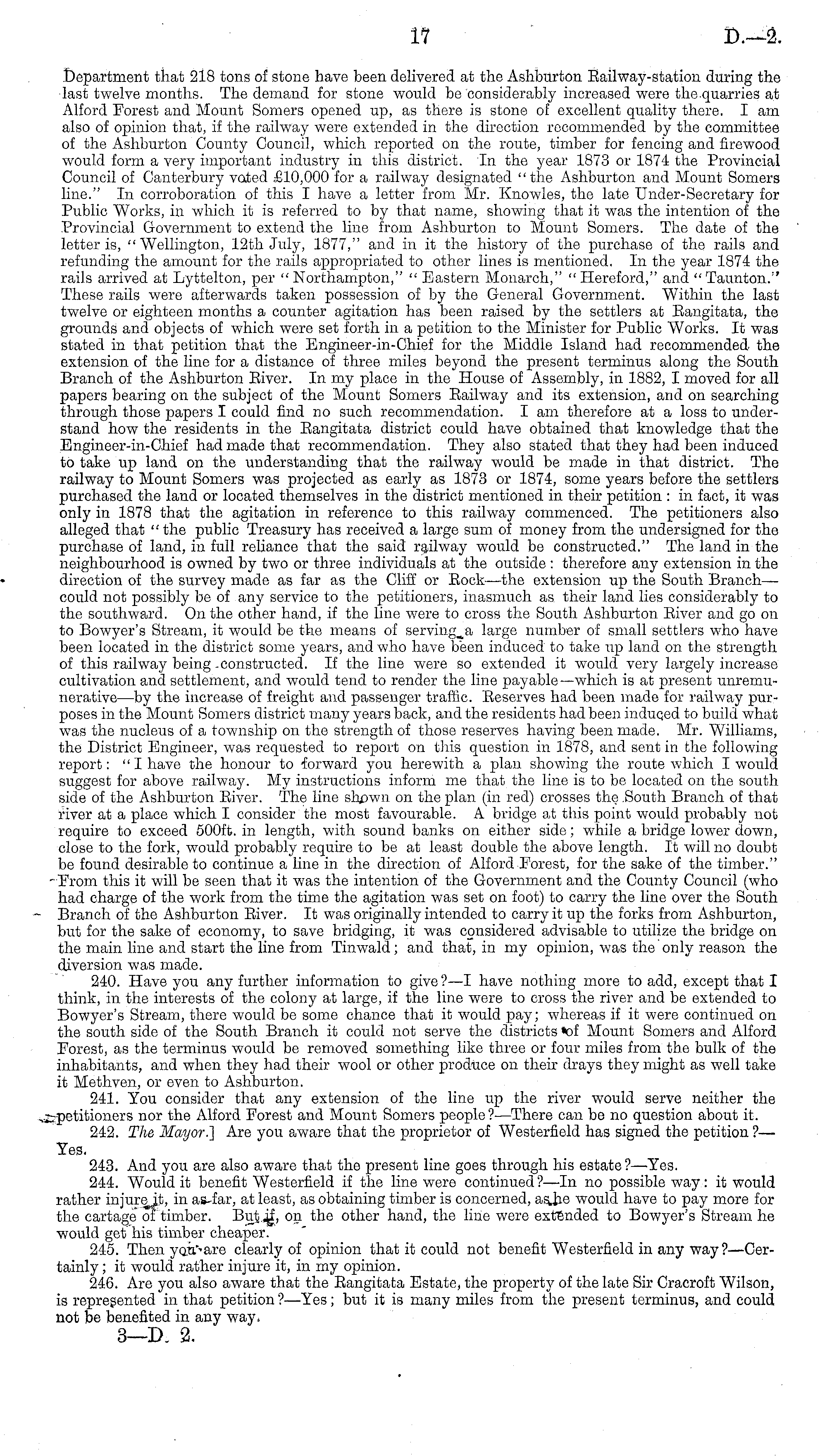 Department that 218 tons of stone have been delivered at the Ashburton Bailway-station during the last tw relve months. The demand for stone would be considerably increased were the.quarries at Alford Forest and Mount Somers opened up, as there is stone of excellent quality there. I am also of opinion that, if the railway were extended in the direction recommended by the committee of the Ashburton County Council, which reported on the route, timber for fencing and firewood would form a very important industry in this district. In the year 1873 or 1874 the Provincial Council of Canterbury voted £10,000 for a railway designated "the Ashburton and Mount Somers line." In corroboration of this I have a letter from Mr. Knowles, the late Under-Secretary for Public Works, in which it is referred to by that name, showing that it was the intention of the Provincial Government to extend the line from Ashburton to Mount Somers. The date of the letter is, "Wellington, 12th July, 1877," and in it the history of the purchase of the rails and refunding the amount for the rails appropriated to other lines is mentioned. In the year 1874 the rails arrived at Lyttelton, per " Northampton," " Eastern Monarch," " Hereford," and. " Taunton." These rails were afterwards taken possession of by the General Government. Within the last twelve or eighteen months a counter agitation has been raised by the settlers at Bangitata, the grounds and objects of which w rere set forth in a petition to the Minister for Public Works. It was stated in that petition that the Engineer-in-Chief for the Middle Island had recommended the extension of the line for a distance of three miles beyond the present terminus along the South Branch of the Ashburton Biver. In my place in the House of Assembly, in 1882, I moved for all papers bearing on the subject of the Mount Somers Bailway and its extension, and on searching through those papers 1 could find no such recommendation. I am therefore at a loss to understand how the residents in the Bangitata district could have obtained that knowledge that the Engineer-in-Chief had made that recommendation. They also stated that they had been induced to take up land on the understanding that the railway would be made in that district. The railway to Mount Somers was projected as early as 1873 or 1874, some years before the settlers purchased the land or located themselves in the district mentioned in their petition : in fact, it was only in 1878 that the agitation in reference to this railway commenced. The petitioners also alleged that " the public Treasury has received a large sum of money from the undersigned for the purchase of land, in full reliance that the said railway would be constructed." The land in the neighbourhood is owned by two or three individuals at the outside : therefore any extension in the direction of the survey made as far as the Cliff or Bock—the extension up the South Branch— could not possibly be of any service to the petitioners, inasmuch as their land lies considerably to the southward. On the other hand, if the line were to cross the South Ashburton Biver and go on to Bowyer's Stream, it would be the means of serving^a large number of small settlers who have been located in the district some years, and who have Keen induced to take up land on the strength of this railway being -constructed. If the line were so extended it would very largely increase cultivation and settlement, and would tend to render the line payable —which is at present unremunerative—by the increase of freight and passenger traffic. Reserves had been made for railway purposes in the Mount Somers district many years back, and the residents had been induced to build what was the nucleus of a township on the strength of those reserves having been made. Mr. Williams, the District Engineer, was requested to report on this question in 1878, and sent in the following report: " I have the honour to forward you herewith a plan showing the route which I would suggest for above railway. My instructions inform me that the line is to be located on the south side of the Ashburton Biver. The line shpwn on the plan (in red) crosses the .South Branch of that river at a place which I consider the most favourable. A bridge at this point would probably not require to exceed 500 ft. in length, with sound banks on either side; while a bridge lower down, close to the fork, would probably require to be at least double the above length. It will no doubt be found desirable to continue a line in the direction of Alford Forest, for the sake of the timber." From this it will be seen that it was the intention of the Government and the County Council (who had charge of the work from the time the agitation was set on foot) to carry the line over the South Branch of the Ashburton Biver. It was originally intended to carry it up the forks from Ashburton, but for the sake of economy, to save bridging, it was considered advisable to utilize the bridge on the main line and start the line from Tinwald; and that, in my opinion, was the only reason the diversion was made. 240. Have you any further information to give ?—I have nothing more to add, except that I think, in the interests of the colony at large, if the line were to cross the river and be extended to Bowyer's Stream, there would be some chance that it would pay; whereas if it were continued on the south side of the South Branch it could not serve the districts "of Mount Somers and Alford Forest, as the terminus would be removed something like three or four miles from the bulk of the inhabitants, and when they had their wool or other produce on their drays they might as well take it Methven, or even to Ashburton. 241. You consider that any extension of the line up the river would serve neither the petitioners nor the Alford Forest and Mount Somers people?— There can be no question about it. 242. The Mayor.] Are you aware that the proprietor of Westerfield has sig