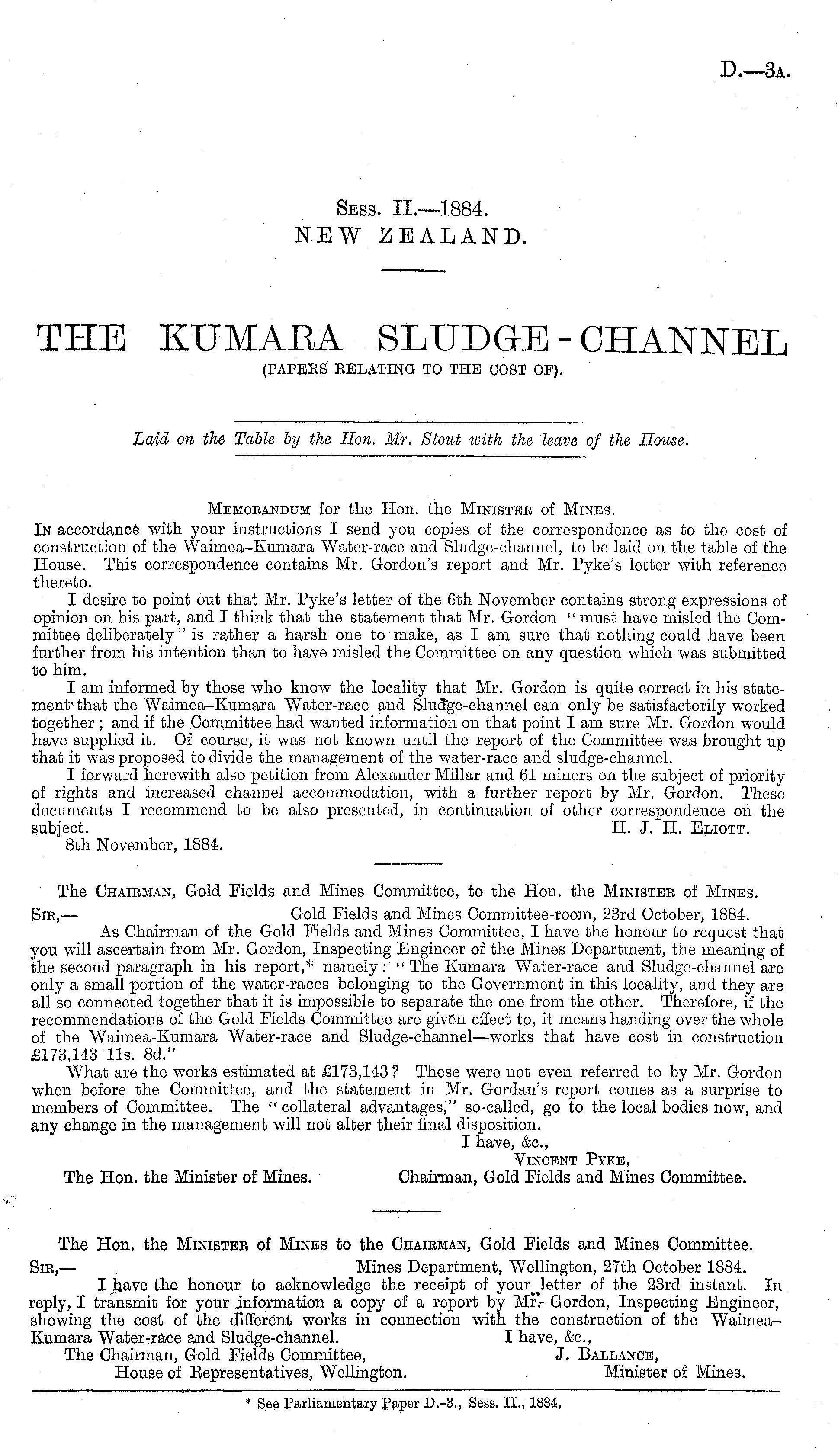 The Chairman, Gold Fields and Mines Committee, to the Hon. the Ministee of Mines. Sic,- — Gold Fields and Mines Committee-room, 23rd October, 1884. As Chairman of the Gold Fields and Mines Committee, I have the honour to request that you will ascertain from Mr. Gordon, Inspecting Engineer of the Mines Department, the meaning of the second paragraph in his report,* namely : " The Kumara Water-race and Sludge-channel are only a small portion of the water-races belonging to the Government in this locality, and they are all so connected together that it is impossible to separate the one from the other. Therefore, if the recommendations of the Gold Fields Committee are given effect to, it means handing over the whole of the Waimea-Kumara Water-race and Sludge-channel—works that have cost in construction £173,143 11s.. Bd." What are the works estimated at £173,143 ? These were not even referred to by Mr. Gordon when before the Committee, and the statement in Mr. (Jordan's report comes as a surprise to members of Committee. The " collateral advantages," so-called, go to the local bodies now, and any change in the management will not alter their final disposition. I have, &c, Vincent Pyke, The Hon. the Minister of Mines. Chairman, Gold Fields and Mines Committee.