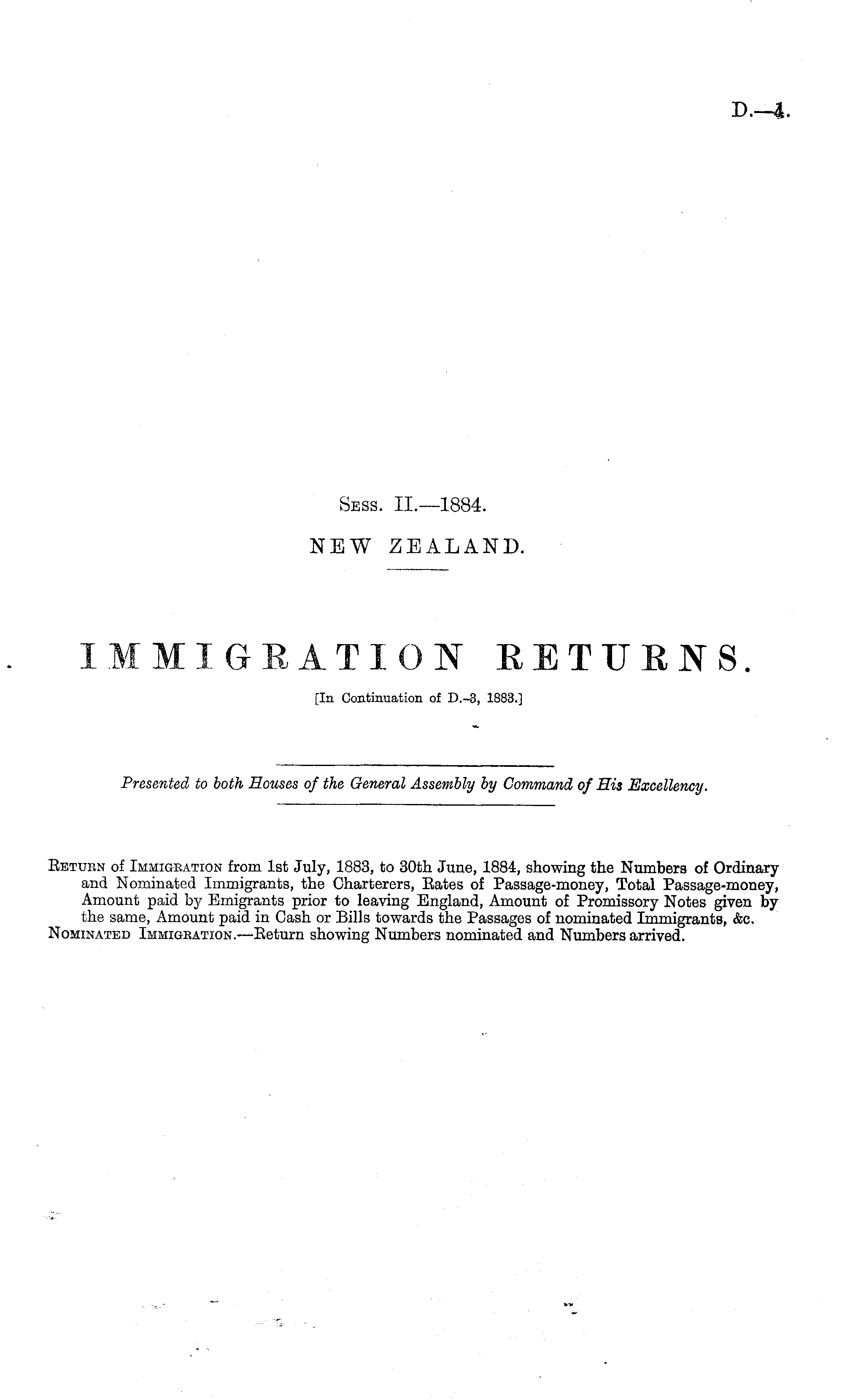 IMMIGRATION RETURNS. [In Continuation of D.-3, 1883.]