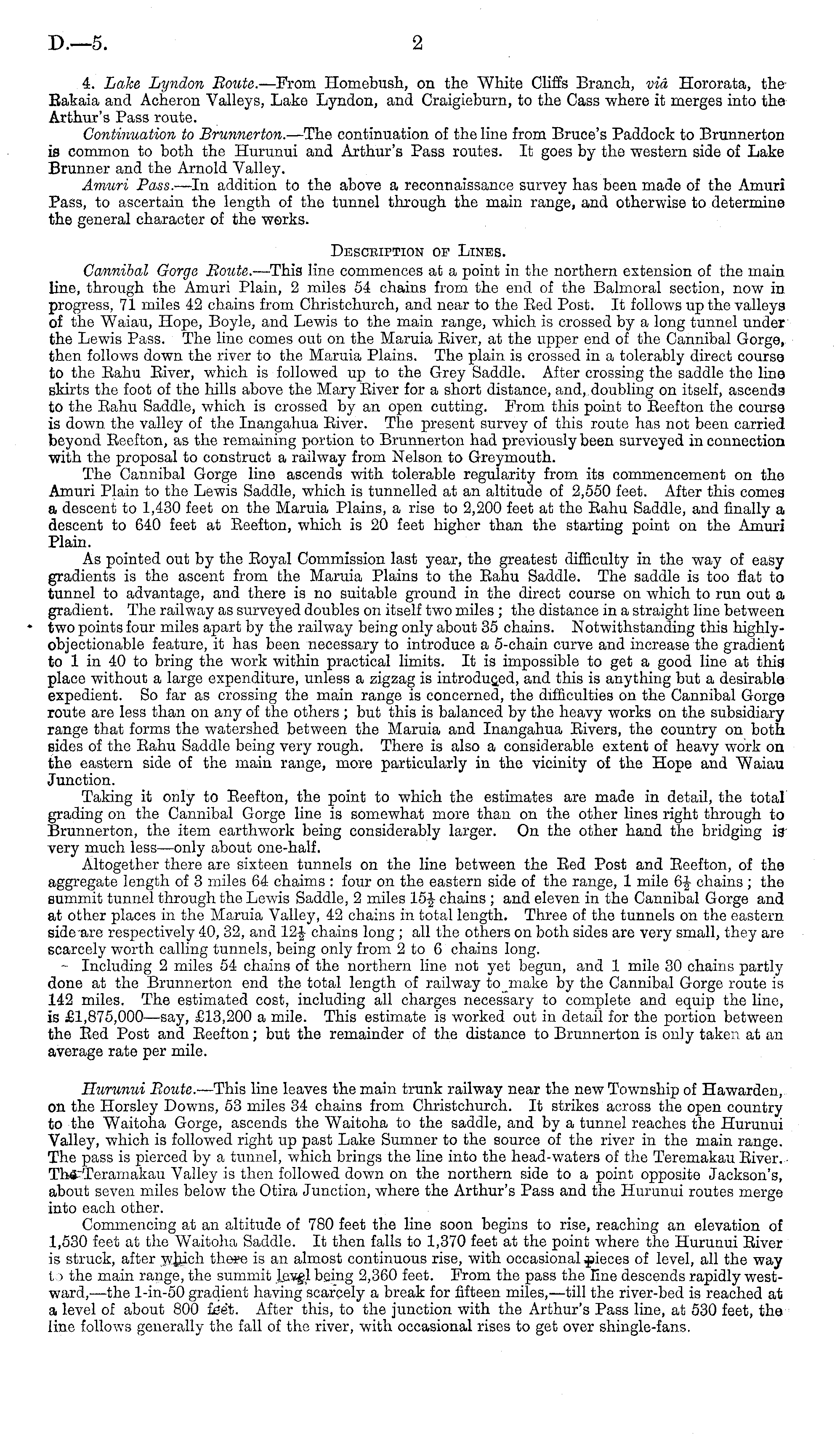 4. Lake Lyndon Route. —From Homebush, on the White Cliffs Branch, via Hororata, theEakaia and Acheron Valleys, Lake Lyndon, and Craigieburn, to the Cass where it merges into the Arthur's Pass route. Continuation to Brunnerton. —The continuation of the line from Bruce's Paddock to Brunnerton is common to both the Hurunui and Arthur's Pass routes. It goes by the western side of Lake Brunner and the Arnold Valley. Amuri Pass. —ln addition to the above a reconnaissance survey has been made of the Amuri Pass, to ascertain the length of the tunnel through the main range, and otherwise to determine the general character of the works. Description of Lines. Cannibal Gorge Route. —This line commences at a point in the northern extension of the main line, through the Amuri Plain, 2 miles 54 chains from the end of the Balmoral section, now in progress, 71 miles 42 chains from Christchurch, and near to the Eed Post. It follows up the valleya of the Waiau, Hope, Boyle, and Lewis to the main range, which is crossed by a long tunnel under the Lewis Pass. The line comes out on the Maruia Eiver, at the upper end of the Cannibal Gorge, then follows down the river to the Maruia Plains. The plain is crossed in a tolerably direct course to the Eahu Eiver, which is followed up to the Grey Saddle. After crossing the saddle the line skirts the foot of the hills above the Mary Eiver for a short distance, and, doubling on itself, ascenda to the Eahu Saddle, which is crossed by an open cutting. From this point to Eeefton the course is down the valley of the Inangahua Eiver. The present survey of this route has not been carried beyond Eeefton, as the remaining portion to Brunnerton had previously been surveyed in connection with the proposal to construct a railway from Nelson to Greymouth. The Cannibal Gorge line ascends with tolerable regularity from its commencement on the Amuri Plain to the Lewis Saddle, which is tunnelled at an altitude of 2,550 feet. After this cornea a descent to 1,430 feet on the Maruia Plains, a rise to 2,200 feet at the Eahu Saddle, and finally a descent to 640 feet at Eeefton, which is 20 feet higher than the starting point on the Amuri Plain. As pointed out by the Eoyal Commission last year, the greatest difficulty in the way of easy gradients is the ascent from the Maruia Plains to the Eahu Saddle. The saddle is too flat to tunnel to advantage, and there is no suitable ground in the direct course on which to run out a gradient. The railway as surveyed doubles on itself two miles ; the distance in a straight line between two points four miles apart by the railway being only about 35 chains. Notwithstanding this highlyobjectionable feature, it has been necessary to introduce a 5-chain curve and increase the gradient to 1 in 40 to bring the work within practical limits. It is impossible to get a good line at this place without a large expenditure, unless a zigzag is introduged, and this is anything but a desirable expedient. So far as crossing the main range is concerned, the difficulties on the Cannibal Gorge route are less than on any of the others ; but this is balanced by the heavy works on the subsidiary range that forms the watershed between the Maruia and Inangahua Eivers, the country on both sides of the Eahu Saddle being very rough. There is also a considerable extent of heavy work on the eastern side of the main range, more particularly in the vicinity of the Hope and Waiau Junction. Taking it only to Eeefton, the point to which the estimates are made in detail, the total grading on the Cannibal Gorge line is somewhat more than on the other lines right through to Brunnerton, the item earthwork being considerably larger. On the other hand the bridging is very much less—only about one-half. Altogether there are sixteen tunnels on the line between the Eed Post and Eeefton, of the aggregate length of 3 miles 64 chaims : four on the eastern side of the range, 1 mile 6|- chains ; the summit tunnel through the Lewis Saddle, 2 miles 15J chains ; and eleven in the Cannibal Gorge and at other places in the Maruia Valley, 42 chains in total length. Three of the tunnels on the eastern side are respectively 40, 32, and 12-J- chains long ; all the others on both sides are very small, they are scarcely worth calling tunnels, being only from 2 to 6 chains long. Including 2 miles 54 chains of the northern line not yet begun, and 1 mile 30 chains partly done at the Brunnerton end the total length of railway to make by the Cannibal Gorge route is 142 miles. The estimated cost, including all charges necessary to complete and equip the line, is £1,875,000 —say, £13,200 a mile. This estimate is worked out in detail for the portion between the Eed Post and Eeefton; but the remainder of the distance to Brunnerton is only taken at an average rate per mile. Hurunui Route. —This line leaves the main trunk railway near the new Township of Hawarden, on the Horsley Downs, 53 miles 34 chains from Christchurch. It strikes across the open country to the Waitoha Gorge, ascends the Waitoha to the saddle, and by a tunnel reaches the Hurunui Valley, which is followed right up past Lake Sumner to the source of the river in the main range. The pass is pierced by a tunnel, which brings the line into the head-waters of the Teremakau Eiver. The Terarnakau Valley is then followed down on the northern side to a point opposite Jackson's, about seven miles below the Otira Junction, where the Arthur's Pass and the Hurunui routes merge into each other. Commencing at an altitude of 780 feet the line soon begins to rise, reaching an elevation of 1,530 feet at the Waitoha Saddle. It then falls to 1,370 feet at the point where the Hurunui Eiver is struck, after which these is an almost continuous rise, with occasional pieces of level, all the way t > the main range, the summit level being 2,360 feet. From the pass the line descends rapidly westward, —the l-in-50 gradient having scarcely a break for fifteen miles, 
