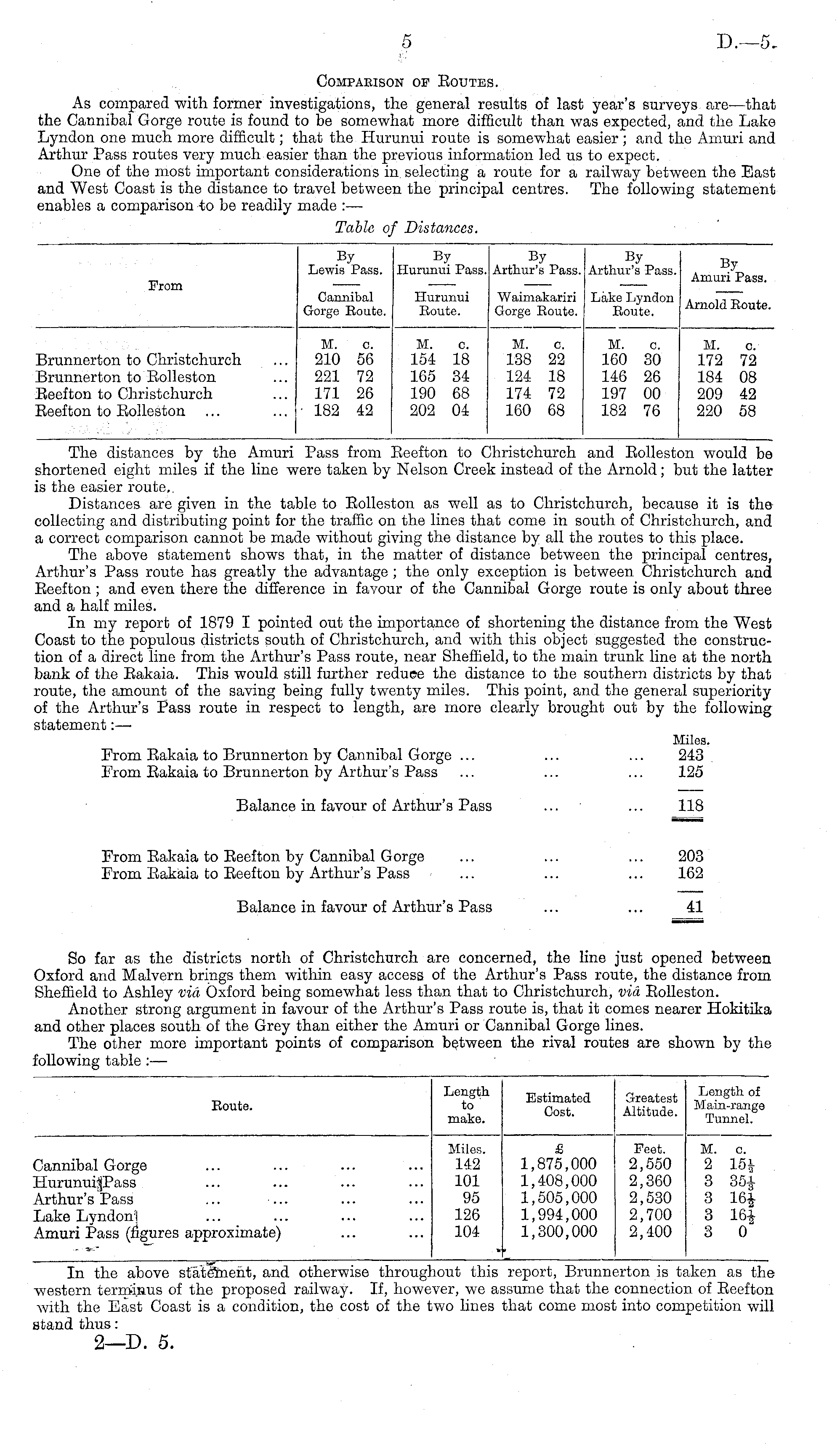 Comparison of Route. As compared with former investigations, the general results of last year's surveys are —that the Cannibal Gorge route is found to be somewhat more difficult than was expected, and the Lake Lyndon one much more difficult; that the Hurunui route is somewhat easier; and the Amuri and Arthur Pass routes very much easier than the previous information led us to expect. One of the most important considerations in selecting a route for a railway between the East and West Coast is the distance to travel between the principal centres. The following statement enables a comparison to be readily made: —