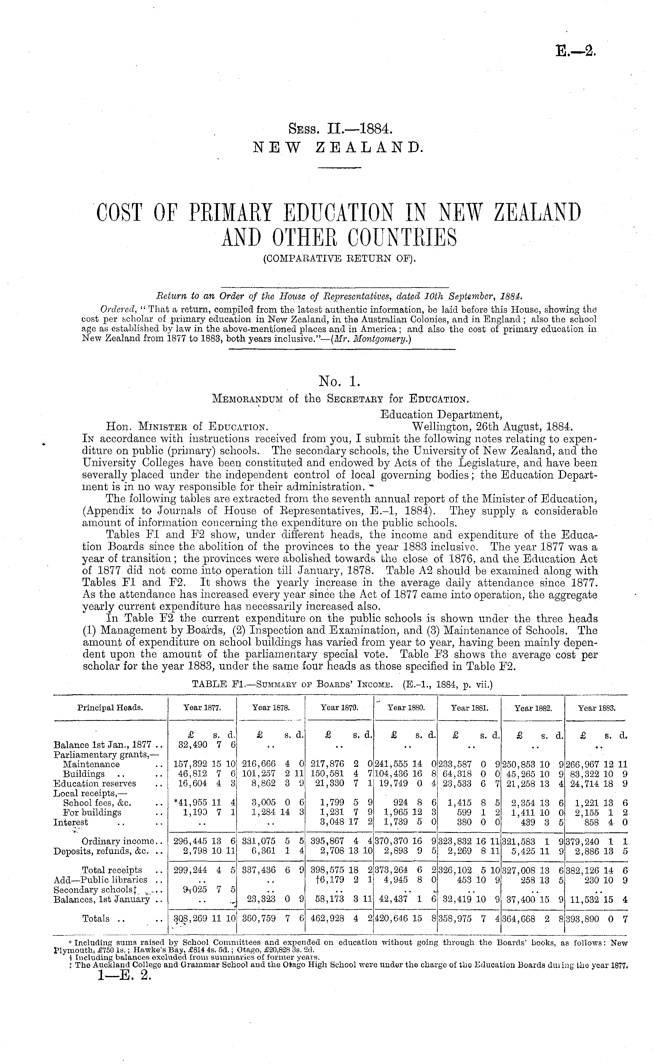 No. 1. Memorandum of the Secretary for Education. Education Department, Hon. Minister of Education. Wellington, 26th August, 1884. In accordance with instructions received from you, I submit the following notes relating to expenditure on public (primary) schools. The secondary schools, the University of New Zealand, and the University Colleges have been constituted and endowed by Acts of the Legislature, and have been severally placed under the independent control of local governing bodies; the Education Department is in no way responsible for their administration. ~ The following tables are extracted from the seventh annual report of the Minister of Education, (Appendix to Journals of House of Eepresentatives, E.-l, 1884). They supply a considerable amount of information concerning the expenditure on the public schools. Tables El and E2 show, under different heads, the income and expenditure of the Education Boards since the abolition of the provinces to the year 1883 inclusive. The year 1877 was a year of transition ; the provinces were abolished towards the close of 1876, and the Education Act of 1877 did not come into operation till January, 1878. Table A 2 should be examined along with Tables Fl and F2. It shows the yearly increase in the average daily attendance since 1877. As the attendance has increased every year since the Act of 1877 came into operation, the aggregate yearly current expenditure has necessarily increased also. In Table E2 the current expenditure on the public schools is shown under the three heads (1) Management by Boards, (2) Inspection and Examination, and (3) Maintenance of Schools. The amount of expenditure on school buildings has varied from year to year, having been mainly dependent upon the amount of the parliamentary special vote. Table F3 shows the average cost per scholar for the year 1883, under the same four heads as those specified in Table E2.