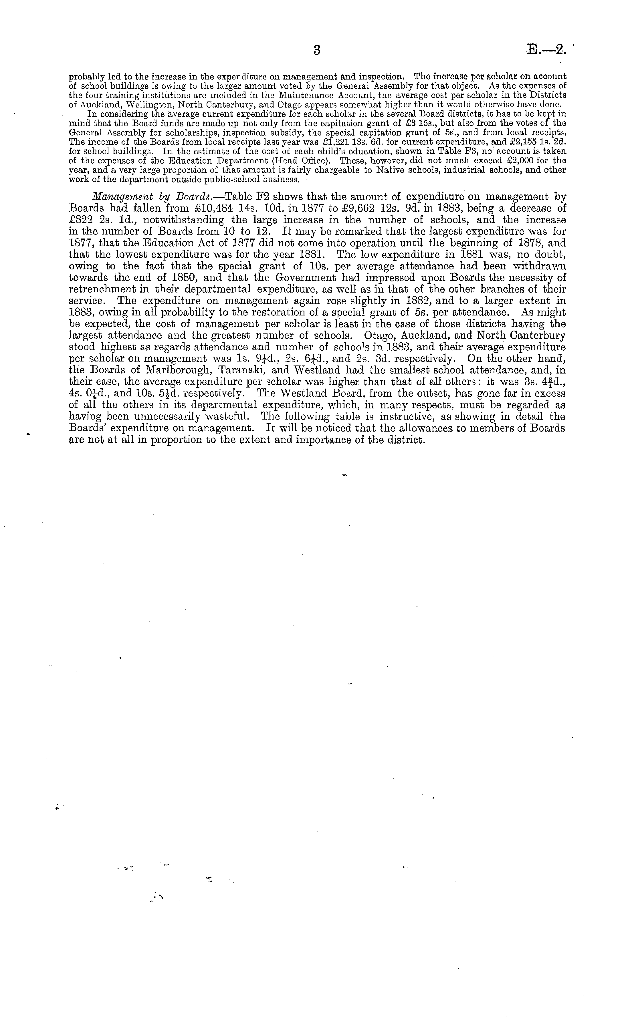probably led to the increase in the expenditure on management and inspection. The increase per scholar on account of school buildings is owing to the larger amount voted by the General Assembly for that object. As the expenses of the four training institutions are included in the Maintenance Account, the average cost per scholar in the Districts of Auckland, Wellington, North Canterbury, and Otago appears somewhat higher than it would otherwise have done. In considering the average current expenditure for each scholar in the several Board districts, it has to be kept in mind that the Board funds are made up not only from the capitation grant of £3 155., but also from the votes of the General Assembly for scholarships, inspection subsidy, the special capitation grant of 55., and from local receipts. The income of the Boards from local receipts last year was £1,221 13s. 6d. for current expenditure, and £2,155 Is. 2d. for school buildings. In the estimate of the cost of each child's education, shown in Table F3, no account is taken of the expenses of the Education Department (Head Office). These, however, did not much exceed £2,000 for the year, and a very large proportion of that amount is fairly chargeable to Native schools, industrial schools, and other work of the department outside public-school business. Management by Boards. —Table F2 shows that the amount of expenditure on management by Boards had fallen from £10,484 14s. lOd. in 1877 to £9,662 12s. 9d. in 1883, being a decrease of £822 2s. Id., notwithstanding the large increase in the number of schools, and the increase in the number of Boards from 10 to 12. It may be remarked that the largest expenditure was for 1877, that the Education Act of 1877 did not come into operation until the beginning of 1878, and that the lowest expenditure was for the year 1881. The low expenditure in 1881 was, no doubt, owing to the fact that the special grant of 10s. per average attendance had been withdrawn towards the end of 1880, and that the Government had impressed upon Boards the necessity of retrenchment in their departmental expenditure, as well as in that of the other branches of their service. The expenditure on management again rose slightly in 1882, and to a larger extent in 1883, owing in all probability to the restoration of a special grant of ss. per attendance. As might be expected, the cost of management per scholar is least in the case of those districts having the largest attendance and the greatest number of schools. Otago, Auckland, and North Canterbury stood highest as regards attendance and number of schools in 1883, and their average expenditure per scholar on management was Is. 9Jd., 2s. 6Jd., and 2s. 3d. respectively. On the other hand, the Boards of Marlborough, Taranaki, and Westland had the smallest school attendance, and, in their case, the average expenditure per scholar was higher than that of all others : it was 3s. 4f d., 4s. OJd., and 10s. s^-d. respectively. The Westland Board, from the outset, has gone far in excess of all the others in its departmental expenditure, which, in many respects, must be regarded as having been unnecessarily wasteful. The following table is instructive, as showing in detail the Boards' expenditure on management. It will be noticed that the allowances to members of Boards are not at all in proportion to the extent and importance of the district.