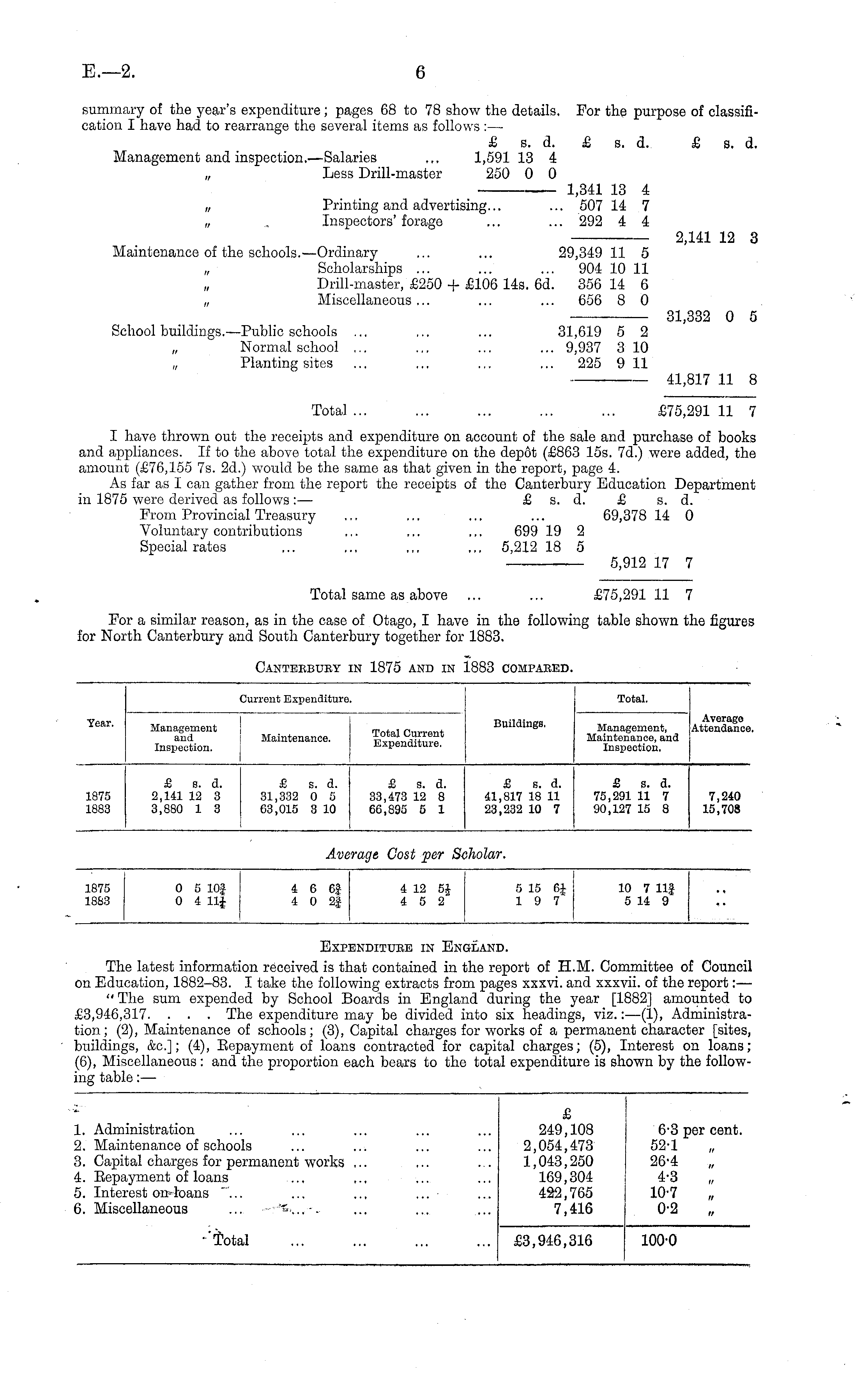 EXPENDITURE IN ENGLAND. The latest information received is that contained in the report of H.M. Committee of Council on Education, 1882-83. I take the following extracts from pages xxxvi. and xxxvii. of the report:— " The sum expended by School Boards in England during the year [1882] amounted to £3,946,317. . . . The expenditure may be divided into six headings, viz.:—(1), Administration; (2), Maintenance of schools; (3), Capital charges for works of a permanent character [sites, buildings, &c]; (4), Eepayment of loans contracted for capital charges; (5), Interest on loans; (6), Miscellaneous : and the proportion each bears to the total expenditure is shown by the following table: —