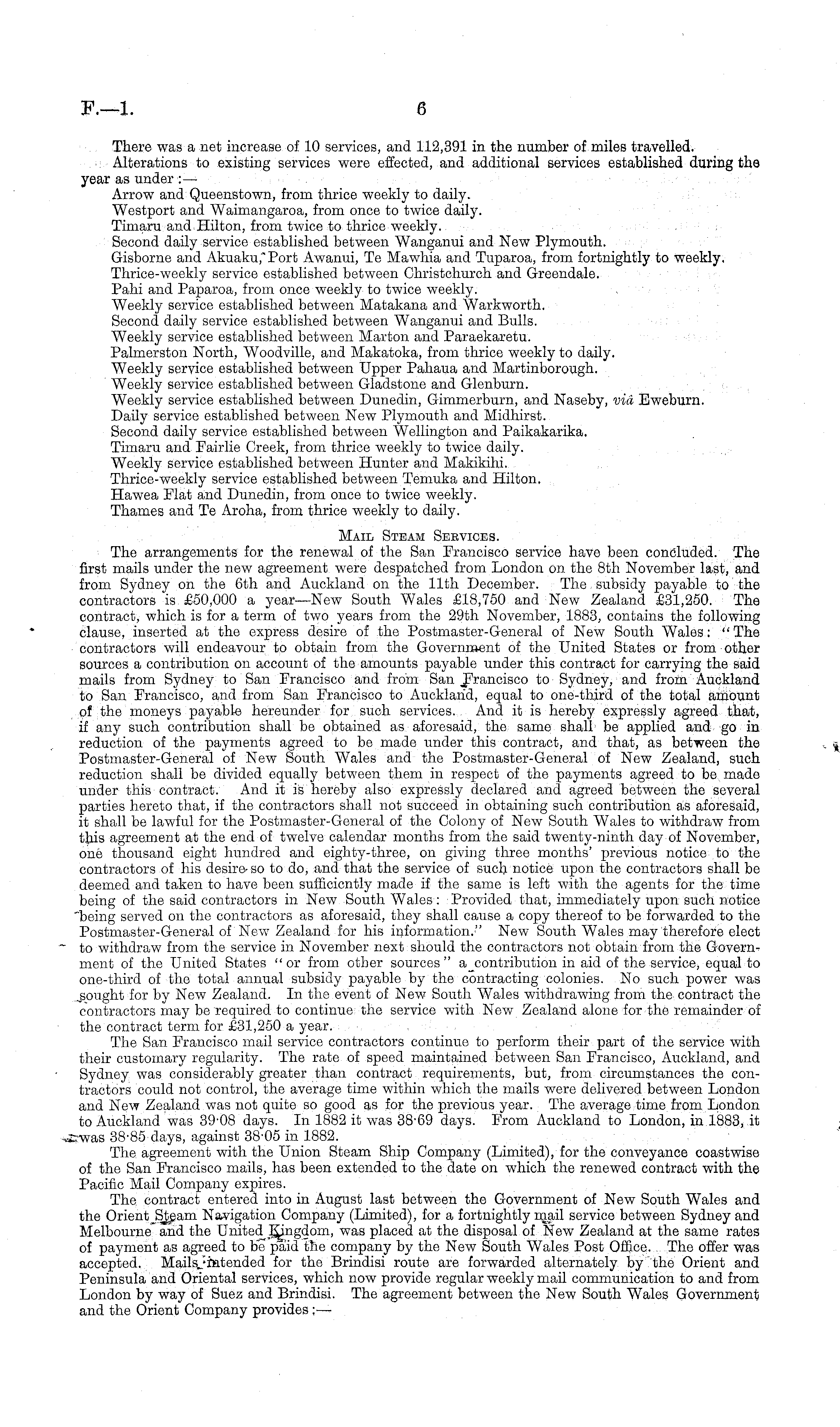 There was a net increase of 10 services, and 112,391 in the number of miles travelled. Alterations to existing services were effected, and additional services established during the year as under : — Arrow and Queenstown, from thrice weekly to daily. Westport and Waimangaroa, from once to twice daily. Timaru and Hilton, from twice to thrice weekly. Second daily service established between Wanganui and New Plymouth. Gisborne and Akuaku.'Port Awanui, Te Mawhia and Tuparoa, from fortnightly to weekly. Thrice-weekly service established between Christchurch and Greendale. Pahi and Paparoa, from once weekly to twice weekly. Weekly service established betw*een Matakana and Warkworth. Second daily service established between Wanganui and Bulls. Weekly service established between Marton and Paraekaretu. Palmerston North, Woodville, and Makatoka, from thrice weekly to daily. Weekly service established between Upper Pahaua and Martinborough. Weekly service established between Gladstone and Glenburn. Weekly service established between Dunedin, Gimmerburn, and Naseby, via Eweburn. Daily service established between New Plymouth and Midhirst. Second daily service established between Wellington and Paikakarika. Timaru and Fairlie Creek, from thrice weekly to twice daily. Weekly service established between Hunter and Makikihi. Thrice-weekly service established between Temuka and Hilton. , Hawea Flat and Dunedin, from once to twice weekly. Thames and Te Aroha, from thrice weekly to daily. Mail Steam Services. The arrangements for the renewal of the San Francisco service have been concluded. The first mails under the new agreement were despatched from London on the Bth November last, and from Sydney on the 6th and Auckland on the 11th December. The subsidy payable to the contractors is £50,000 a year—New South Wales £18,750 and New Zealand £31,250. The contract, which is for a term of two years from the 29th November, 1883, contains the following clause, inserted at the express desire of the Postmaster-General of New South Wales: "The contractors will endeavour to obtain from the Government of the United States or from other sources a contribution on account of the amounts payable under this contract for carrying the said mails from Sydney to San Francisco and from San Francisco to Sydney, and from Auckland to San Francisco, and from San Francisco to Auckland, equal to one-third of the total amount of the moneys payable hereunder for such services. And it is hereby expressly agreed that, if any such contribution shall be obtained as aforesaid, the same shall be applied and go in reduction of the payments agreed to be made under this contract, and that, as between the Postmaster-General of New South Wales and the Postmaster-General of New Zealand, such reduction shall be divided equally between them in respect of the payments agreed to be made under this contract. And it is hereby also expressly declared and agreed between the several parties hereto that, if the contractors shall not succeed in obtaining such contribution as aforesaid, it shall be lawful for the Postmaster-General of the Colony of New South Wales to withdraw from this agreement at the end of twelve calendar months from the said twenty-ninth day of November, one thousand eight hundred and eighty-three, on giving three months' previous notice to the contractors of his desire- so to do, and that the service of such notice upon the contractors shall be deemed and taken to have been sufficiently made if the same is left with the agents for the time being of the said contractors in New South Wales : Provided that, immediately upon such notice "being served on the contractors as aforesaid, they shall cause a copy thereof to be forwarded to the Postmaster-General of New Zealand for his information." New South Wales may therefore elect to withdraw from the service in November next should the contractors not obtain from the Governr ment of the United States " or from other sources " a_contribution in aid of the service, equal to one-third of the total annual subsidy payable by the contracting colonies. No such power was sought for by New Zealand. In the event of New South Wales withdrawing from the contract the contractors may be required to continue the service with New Zealand alone for the remainder of the contract term for £31,250 a year. The San Francisco mail service contractors continue to perform their part of the service with their customary regularity. The rate of speed maintained between San Francisco, Auckland, and Sydney was considerably greater than contract requirements, but, from circumstances the contractors could not control, the average time within which the mails were delivered between London and New Zealand was not quite so good as for the previous year. The average time from London to Auckland was 39-08 days. In 1882 it was 38-69 days. From Auckland to London, in 1883, it *?was 38-85'days, against 38-05 in 1882. The agreement with the Union Steam Ship Company (Limited), for the conveyance coastwise of the San Francisco mails, has been extended to the date on which the renewed contract with the Pacific Mail Company expires. The contract entered into in August last between the Government of New South Wales and the Orient Steam Navigation Company (Limited), for a fortnightly mail service between Sydney and Melbourne and the United I£ingdom, was placed at the disposal of New Zealand at the same rates of payment as agreed to be paid the company by the New South Wales Post Office. The offer was accepted. Mails.-intended for the Brindisi route are forwarded alternately by the Orient and Peninsula and Oriental services, which now provide regular weekly mail communication to and from London by way of Suez and Brindisi. The agreement between the New South Wales Government and the Orient Company provides ; —■