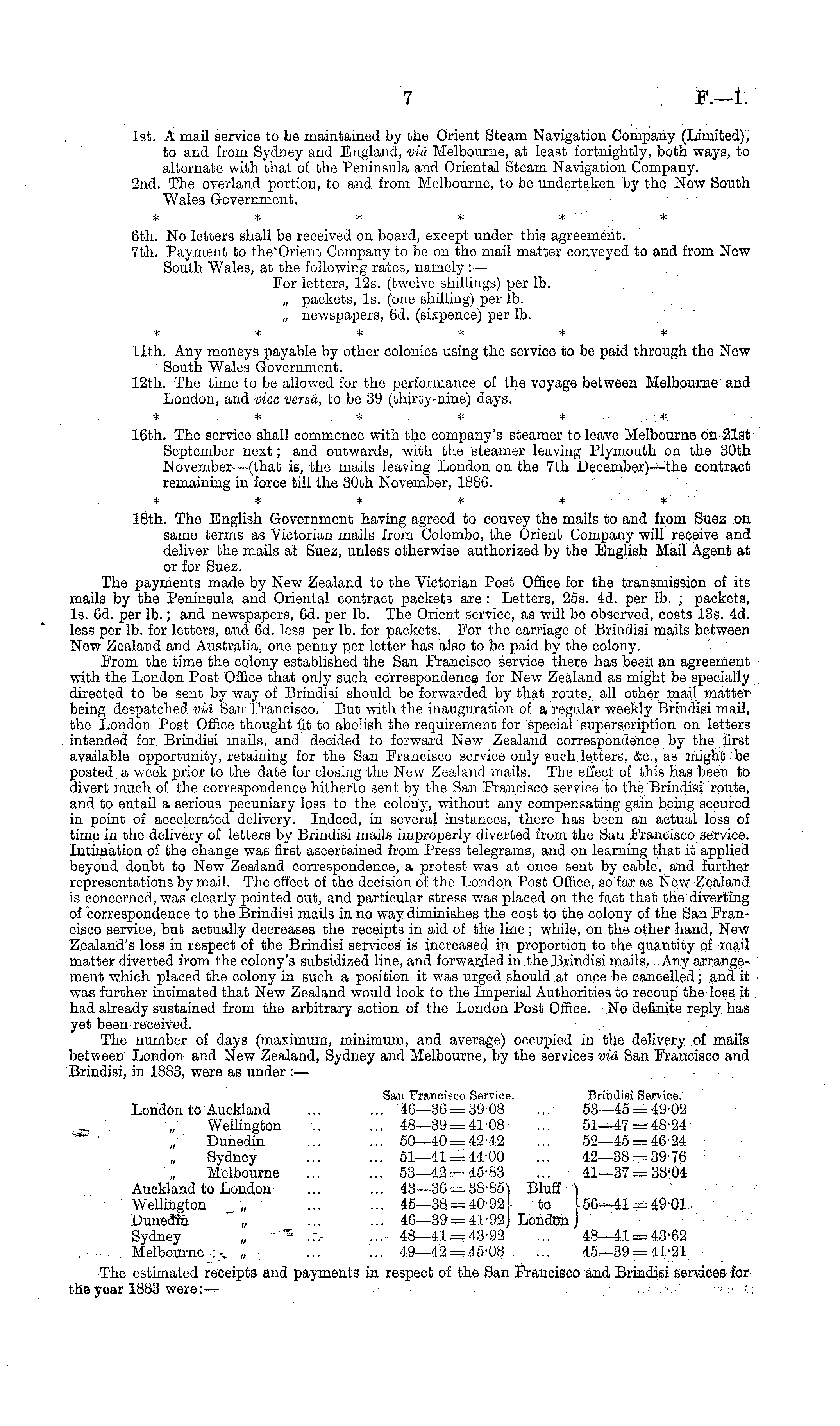 Ist. A mail service to be maintained by the Orient Steam Navigation Company (Limited), to and from Sydney and England, via Melbourne, at least fortnightly, both ways, to alternate with that of the Peninsula and Oriental Steam Navigation Company. 2nd. The overland portion, to and from Melbourne, to be undertaken by the New South Wales Government. * * * * * * 6th. No letters shall be received on board, except under this agreement. 7th. Payment to the"Orient Company to be on the mail matter conveyed to and from New South Wales, at the following rates, namely : — For letters, 12s. (twelve shillings) per lb. „ packets, Is. (one shilling) per lb. „ newspapers, 6d. (sixpence) per lb. rrt: * rfc * * * 11th. Any moneys payable by other colonies using the service to be paid through the New South Wales Government. 12th. The time to be allowed for the performance of the voyage between Melbourne and London, and vice versa, to be 39 (thirty-nine) days. •F «■(■■ -i- *r t.i'.;, , . .'. .'. ■)■ 16th. The service shall commence with the company's steamer to leave Melbourne on 21st September next; and outwards, with the steamer leaving Plymouth on the 30th November—(that is, the mails leaving London on the 7th December) —the contract remaining in force till the 30th November, 1886. rfc rfc rfc rfc rfc 18th. The English Government having agreed to convey the mails to and from Suez on same terms as Victorian mails from Colombo, the Orient Company will receive and deliver the mails at Suez, unless otherwise authorized by the English Mail Agent at or for Suez. The payments made by New Zealand to the Victorian Post Office for the transmission of its mails by the Peninsula and Oriental contract packets are : Letters, 255. 4d. per lb. ; packets, Is. 6d. per lb.; and newspapers, 6d. per lb. The Orient service, as will be observed, costs 13s. 4d. less per lb. for letters, and 6d. less per lb. for packets. For the carriage of Brindisi mails between New Zealand and Australia, one penny per letter has also to be paid by the colony. From the time the colony established the San Francisco service there has been an agreement with the London Post Office that only such correspondence for New Zealand as might be specially directed to be sent by way of Brindisi should be forwarded by that route, all other mail rnattor being despatched via San Francisco. But with the inauguration of a regular weekly Brindisi mail, the London Post Office thought fit to abolish the requirement for special superscription on letters intended for Brindisi mails, and decided to forward New Zealand correspondence by the first available opportunity, retaining for the San Francisco service only such letters, &c, as might be posted a week prior to the date for closing the New Zealand mails. The effect of this has been to divert much of the correspondence hitherto sent by the San Francisco service to the Brindisi route, and to entail a serious pecuniary loss to the colony, without any compensating gain being secured in point of accelerated delivery. Indeed, in several instances, there has been an actual loss of time in the delivery of letters by Brindisi mails improperly diverted from the San Francisco service. Intimation of the change was first ascertained from Press telegrams, and on learning that it applied beyond doubt to New Zealand correspondence, a protest was at once sent by cable, and further representations by mail. The effect of the decision of the London Post Office, so far as New Zealand is concerned, was clearly pointed out, and particular stress was placed on the fact that the diverting of correspondence to the Brindisi mails in no way diminishes the cost to the colony of the San Francisco service, but actually decreases the receipts in aid of the line; while, on the other hand, New Zealand's loss in respect of the Brindisi services is increased in proportion to the quantity of mail matter diverted from the colony's subsidized line, and forwarded in the Brindisi mails. Any arrangement which placed the colony in such a position it was urged should at once be cancelled; and it was further intimated that New Zealand would look to the Imperial Authorities to recoup the loss it had already sustained from the arbitrary action of the London Post Office. No definite reply has yet been received. The number of days (maximum, minimum, and average) occupied in the delivery of mails between London and New Zealand, Sydney and Melbourne, by the services via San Francisco and Brindisi, in 1883, were as under :— San Francisco Service. Brindisi Service. London to Auckland ... ... 46—36 = 39-08 ... 53—45 = 49-02 Wellington 48—39 = 41-08 ... 51—47 = 48-24 Dunedin ... ... 50—40 = 42-42 ... 52—45 = 46-24 Sydney ... ... 51—41 = 44-00 ... 42—38 = 39-76 Melbourne 53—42 = 45-83 ... 41—37 = 38-04 Auckland to London 43—36 = 38-85) Bluff ) Wellington „ ... ... 45—38 = 40-92 to -56—41 = 49-01 Dunedin "„ ... ... 46—39 = 41'92] London Sydney „;' .:.- ... 48—41 = 43-92 ... 48—41 = 43-62 Melbourne . . „ 49—42 = 45-08 ... 45—39 = 41-21 The estimated receipts and payments in respect of the San Francisco and Brindisi services for the year 1883 were:—