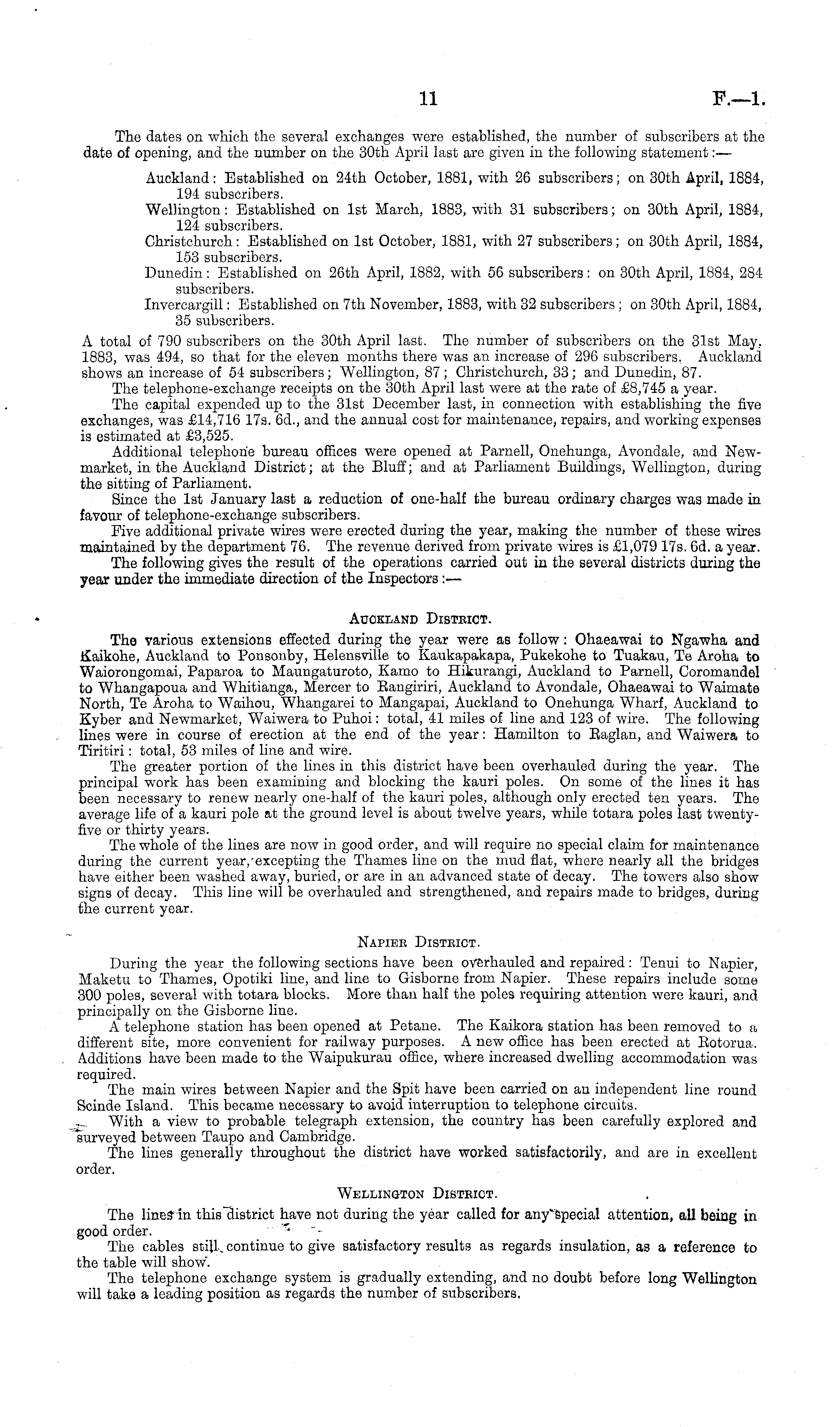 The dates on which the several exchanges were established, the number of subscribers at the date of opening, and the number on the 30th April last are given in the following statement: — Auckland: Established on 24th October, 1881, with 26 subscribers; on 30th April, 1884, 194 subscribers. Wellington: Established on Ist March, 1883, with 31 subscribers; on 30th April, 1884, 124 subscribers. Christchurch: Established on Ist October, 1881, with 27 subscribers; on 30th April, 1884, 153 subscribers. Dunedin: Established on 26th April, 1882, with 56 subscribers: on 30th April, 1884, 284 subscribers. Invercargill: Established on 7th November, 1883, with 32 subscribers ;on 30th April, 1884, 35 subscribers. A total of 790 subscribers on the 30th April last. The number of subscribers on the 31st May, 1883, was 494, so that for the eleven months there was an increase of 296 subscribers. Auckland shows an increase of 54 subscribers; Wellington, 87; Christchurch, 33; and Dunedin, 87. The telephone-exchange receipts on the 30th April last were at the rate of £8,745 a year. The capital expended up to the 31st December last, in connection with establishing the five exchanges, was £14,716 17s. 6d., and the annual cost for maintenance, repairs, and working expenses is estimated at £3,525. Additional telephone bureau offices were opened at Parnell, Onehunga, Avondale, and Newmarket, in the Auckland District; at the Bluff; and at Parliament Buildings, Wellington, during the sitting of Parliament. Since the Ist January last a reduction of one-half the bureau ordinary charges was made in favour of telephone-exchange subscribers. Five additional private wires were erected during the year, making the number of these wires maintained by the department 76. The revenue derived from private wires is £1,079 17s. 6d. a year. The following gives the result of the operations carried out in the several districts during the year under the immediate direction of the Inspectors:— Auckland District. The various extensions effected during the year were as follow: Ohaeawai to Ngawha and Kaikohe, Auckland to Ponsonby, Helensville to Kaukapakapa, Pukekohe to Tuakau, Te Aroha to Waiorongomai, Paparoa to Maungaturoto, Kamo to Hikurangi, Auckland to Parnell, Coromandel to Whangapoua and Whitianga, Mercer to Rangiriri, Auckland to Avondale, Ohaeawai to Waimate North, Te Aroha to Waihou, Whangarei to Mangapai, Auckland to Onehunga Wharf, Auckland to Kyber and Newmarket, Waiwera to Buhoi: total, 41 miles of line and 123 of wire. The following lines were in course of erection at the end of the year: Hamilton to Baglan, and Waiwera to Tiritiri: total, 53 miles of line and wire. The greater portion of the lines in this district have been overhauled during the year. The principal work has been examining and blocking the kauri poles. On some of the lines it has been necessary to renew nearly one-half of the kauri poles, although only erected ten years. The average life of a kauri pole at the ground level is about twelve years, while totara poles last twentyfive or thirty years. The whole of the lines are now in good order, and will require no special claim for maintenance during the current year,-excepting the Thames line on the mud flat, where nearly all the bridges have either been washed away, buried, or are in an advanced state of decay. The towers also show signs of decay. This line will be overhauled and strengthened, and repairs made to bridges, during the current year. Napier District. During the year the following sections have been overhauled and repaired: Tenui to Napier, Maketu to Thames, Opotiki line, and line to Gisborne from Napier. These repairs include some 300 poles, several with totara blocks. More than half the poles requiring attention were kauri, and principally on the Gisborne line. A telephone station has been opened at Petane. The Kaikora station has been removed to a different site, more convenient for railway purposes. A new office has been erected at Eotorua. Additions have been made to the Waipukurau office, where increased dwelling accommodation was required. The main wires between Napier and the Spit have been carried on an independent line round Scinde Island. This became necessary to avoid interruption to telephone circuits. With a view to probable telegraph extension, the country has been carefully explored and surveyed between Taupo and Cambridge. The lines generally throughout the district have worked satisfactorily, and are in excellent order. Wellington District. The lines in this district have not during the year called for any'special attention, all being in good order. The cables still continue to give satisfactory results as regards insulation, as a reference to the table will show'. The telephone exchange system is gradually extending, and no doubt before long Wellington will take a leading position as regards the number of subscribers.