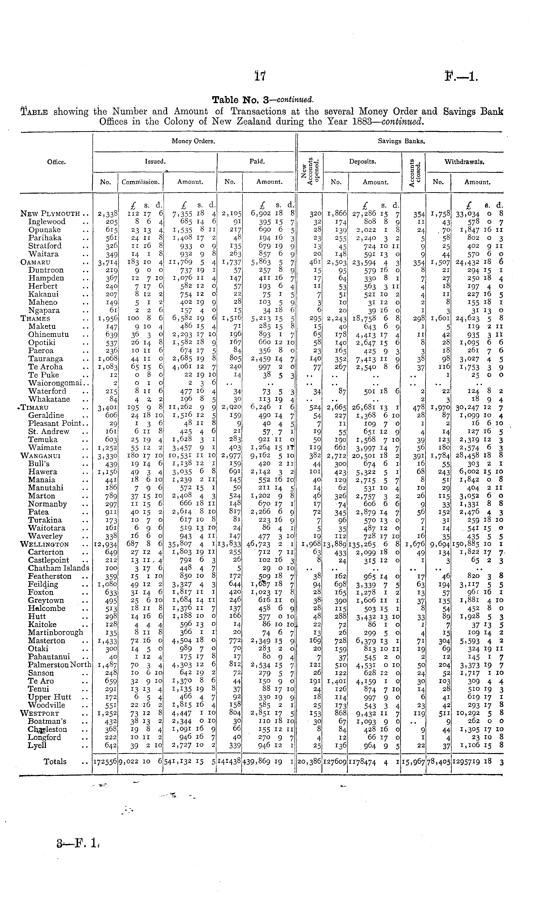 Table No. 3 — continued. Table showing the Number and Amount of Transactions at the several Money Order and Savings Bank Offices in the Colony of New Zealand during the Year 1883— continued.