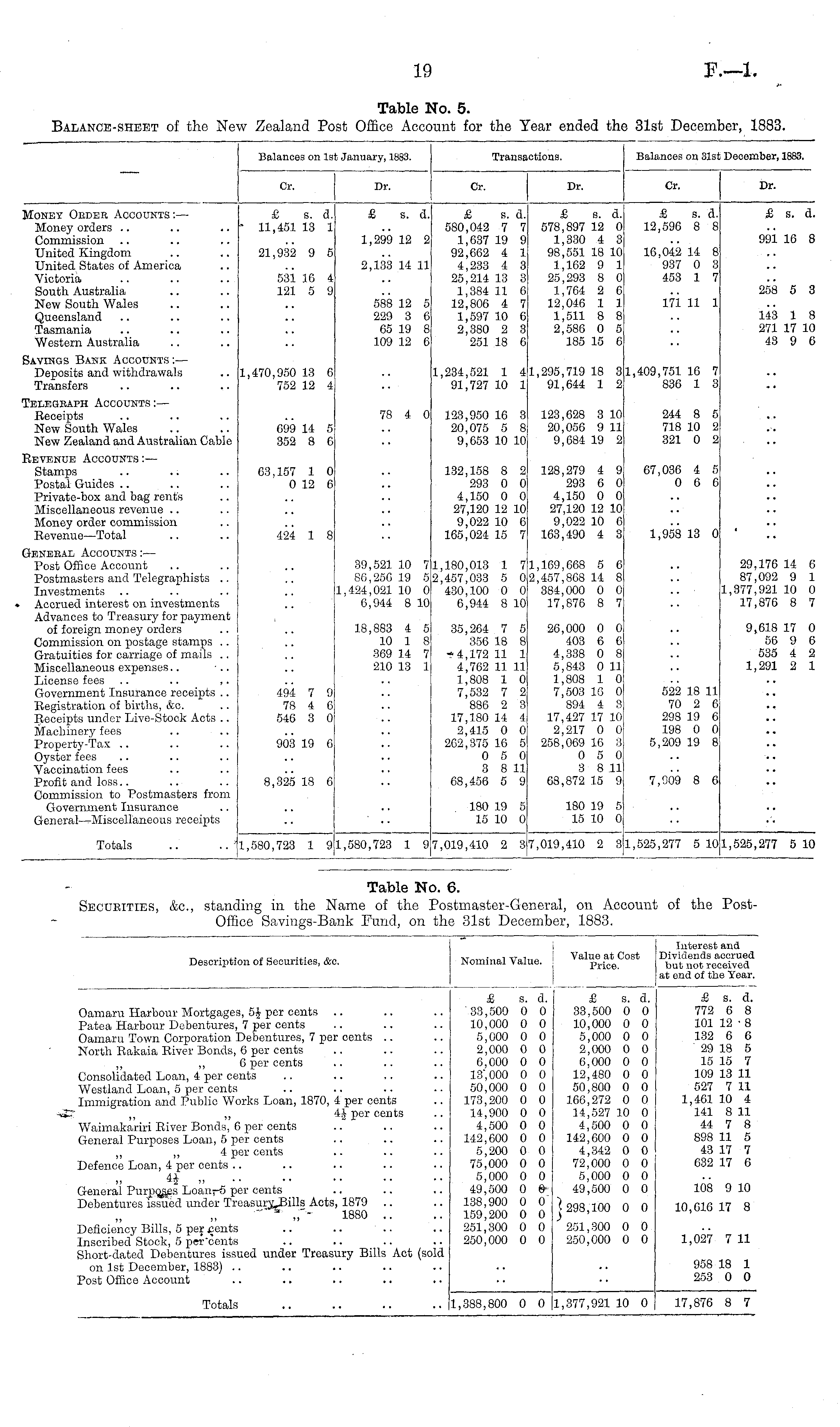 Table No. 5. Balance-sheet of the New Zealand Post Office Account for the Year ended the 31st December, 1883.