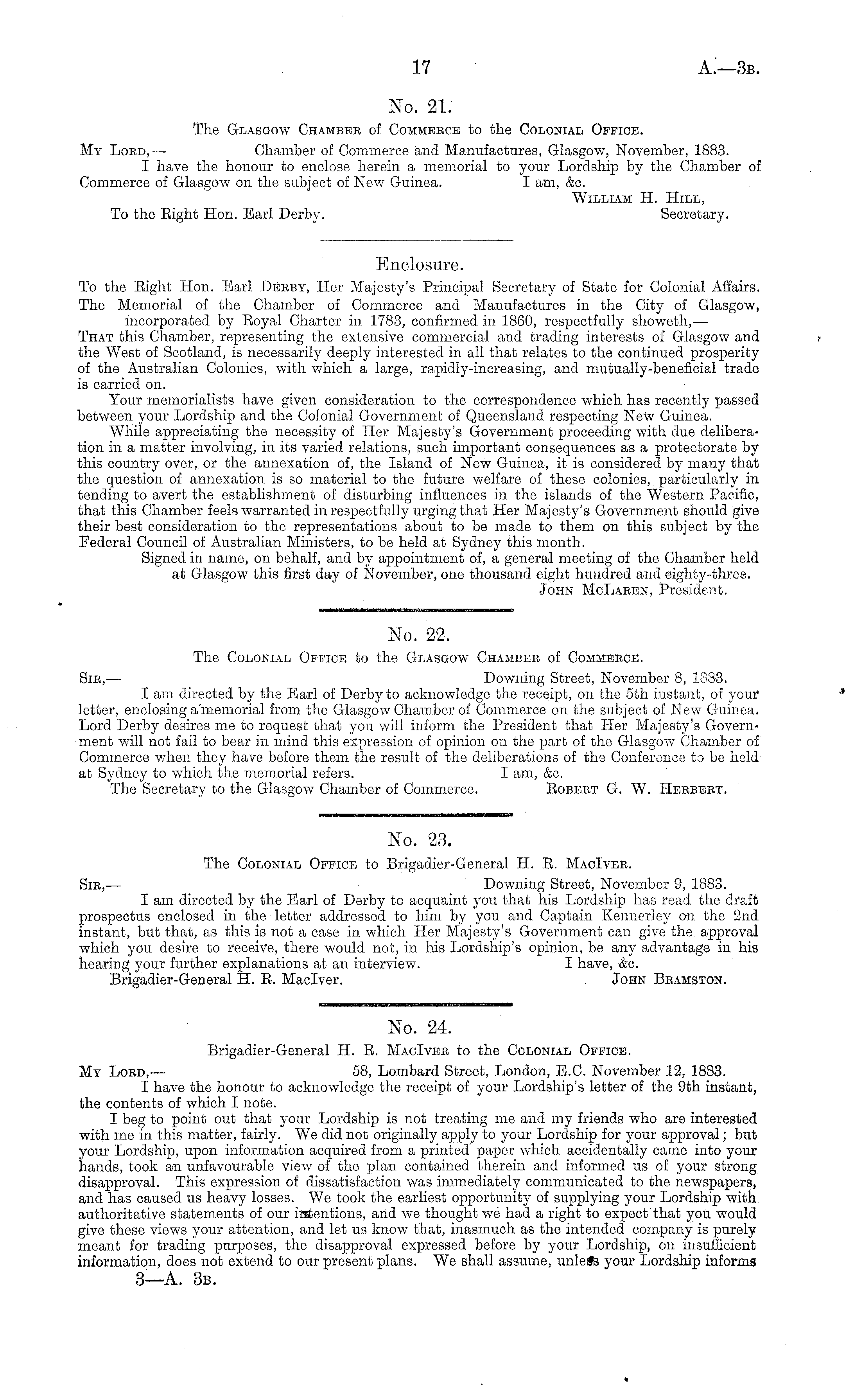 Enclosure. To the Eight Hon. Earl Deeby, Her Majesty's Principal Secretary of State for Colonial Affairs. The Memorial of the Chamber of Commerce and Manufactures in the City of Glasgow, incorporated by Royal Charter in 1783, confirmed in 1860, respectfully showeth, — That this Chamber, representing the extensive commercial and trading interests of Glasgow and the West of Scotland, is necessarily deeply interested in all that relates to the continued prosperity of the Australian Colonies, with which a large, rapidly-increasing, and mutually-beneficial trade is carried on. Your memorialists have given consideration to the correspondence which has recently passed between your Lordship and the Colonial Government of Queensland respecting New Guinea. While appreciating the necessity of Her Majesty's Government proceeding with due deliberation in a matter involving, in its varied relations, such important consequences as a protectorate by this country over, or the annexation of, the Island of New Guinea, it is considered by many that the question of annexation is so material to the future welfare of these colonies, particularly in tending to avert the establishment of disturbing influences in the islands of the Western Pacific, that this Chamber feels warranted in respectfully urging that Her Majesty's Government should give their best consideration to the representations about to be made to them on this subject by the Federal Council of Australian Ministers, to be held at Sydney this month. Signed in name, on behalf, and by appointment of, a general meeting of the Chamber held at Glasgow this first day of November, one thousand eight hundred and eighty-thres. John McLaren, President.