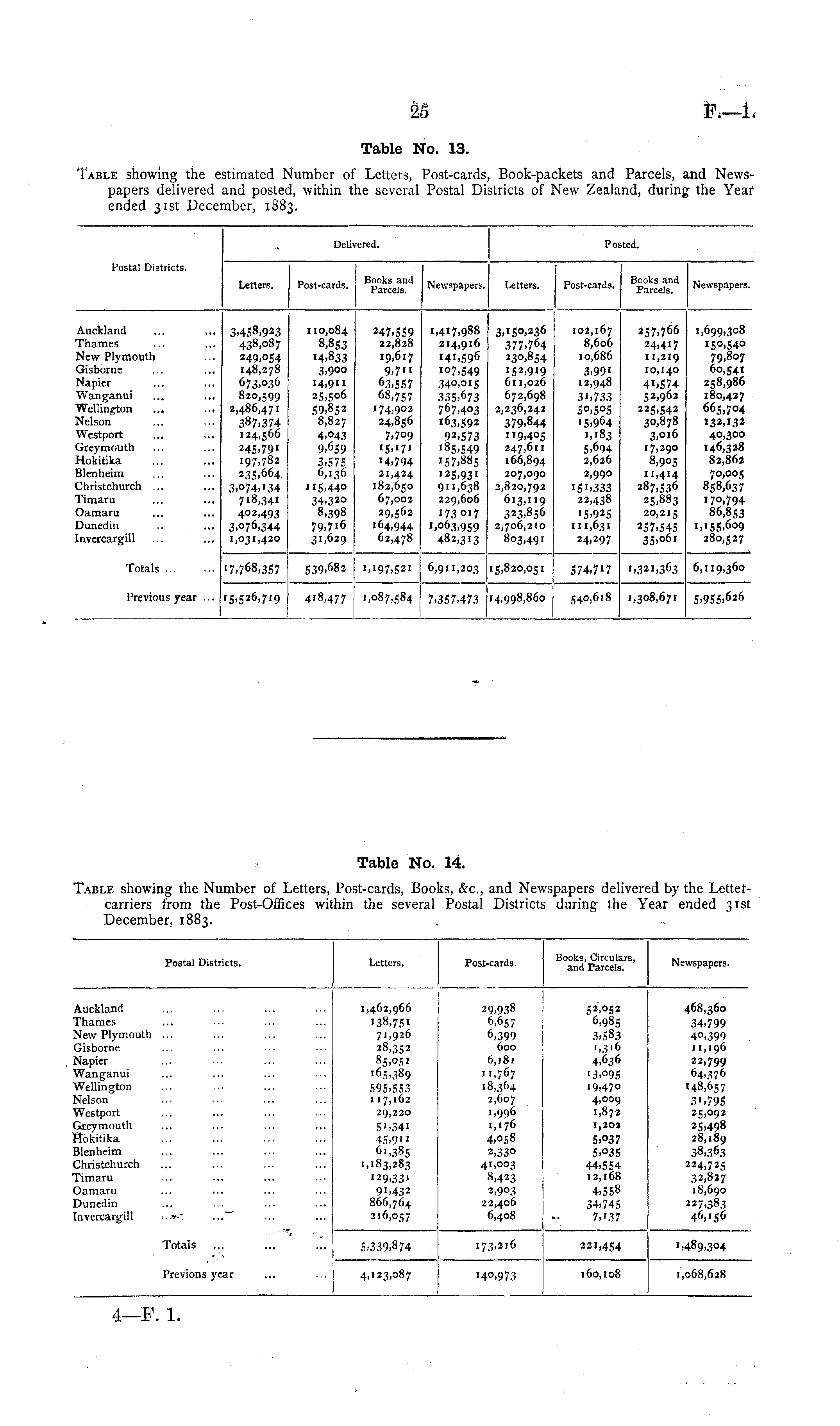 Table No. 13. Table showing the estimated Number of Letters, Post-cards, Book-packets and Parcels, and Newspapers delivered and posted, within the several Postal Districts of New Zealand, during the Year ended 31st December, 1883.
