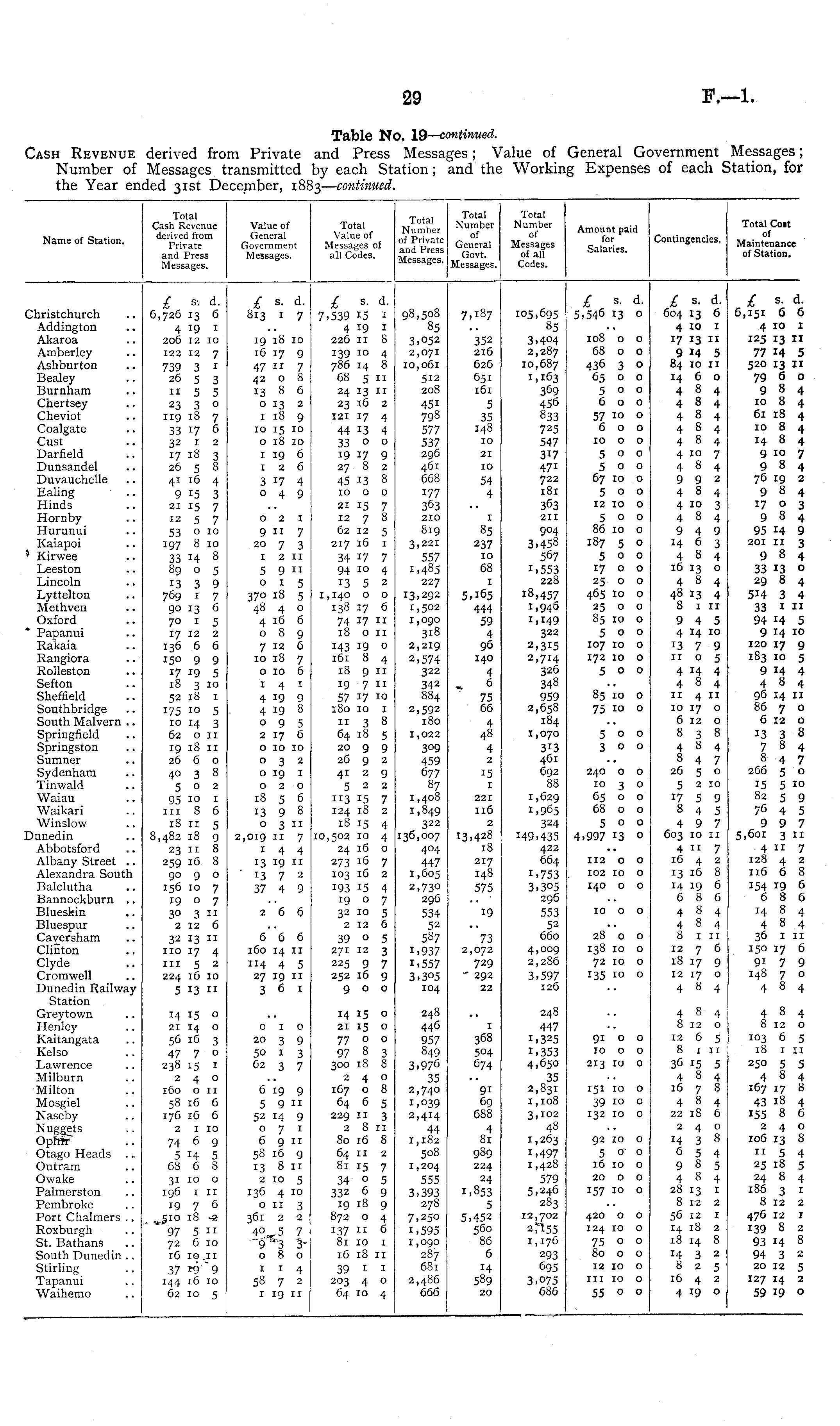 Table No. 19— continued. Cash Revenue derived from Private and Press Messages; Value of General Government Messages; Number of Messages transmitted by each Station; and the Working Expenses of each Station, for the Year ended 31st December, 1883 — continued.