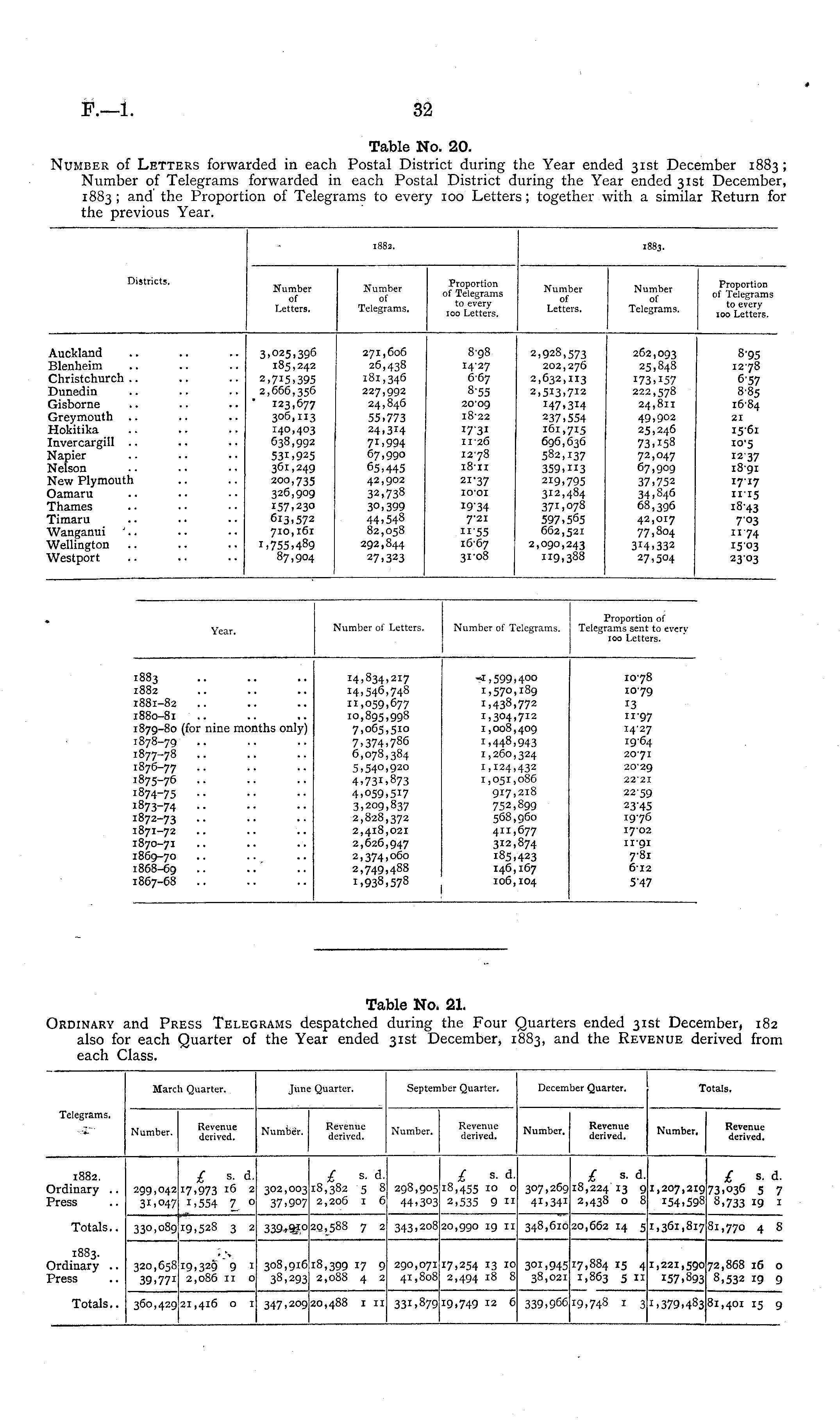 Table No. 21. Ordinary and Press Telegrams despatched during the Four Quarters ended 31st December, 182 also for each Quarter of the Year ended 31st December, 1883, and the Revenue derived from each Class.
