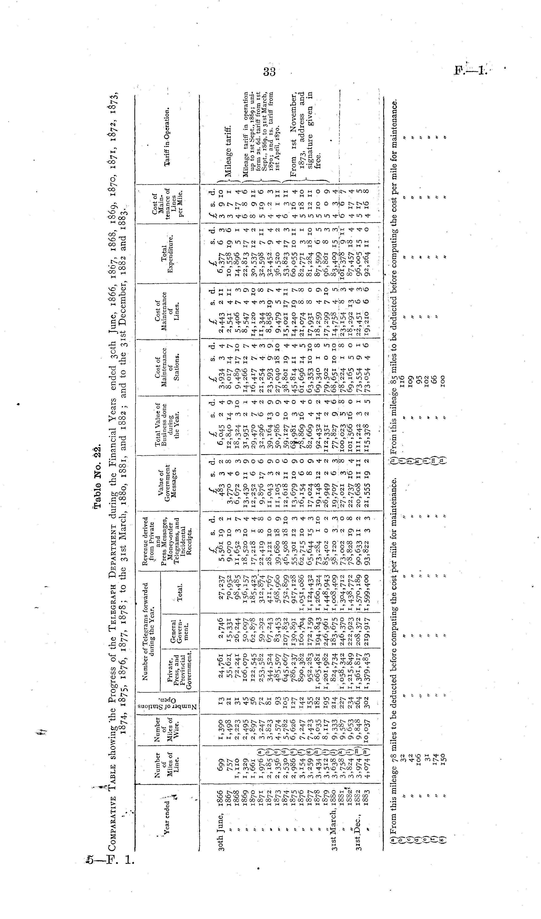 Table No. 22. Table showing the Progress of the Telegraph Department during the Financial Years ended 30th June, 1866, 1867, 1868, 1869, 1870, 1871, 1872, 1873, 1874, 1875, 1876, 1877, 1878; to the 31st March, 1880, 1881, and 1882; and to the 31st December, 1882 and 1883.