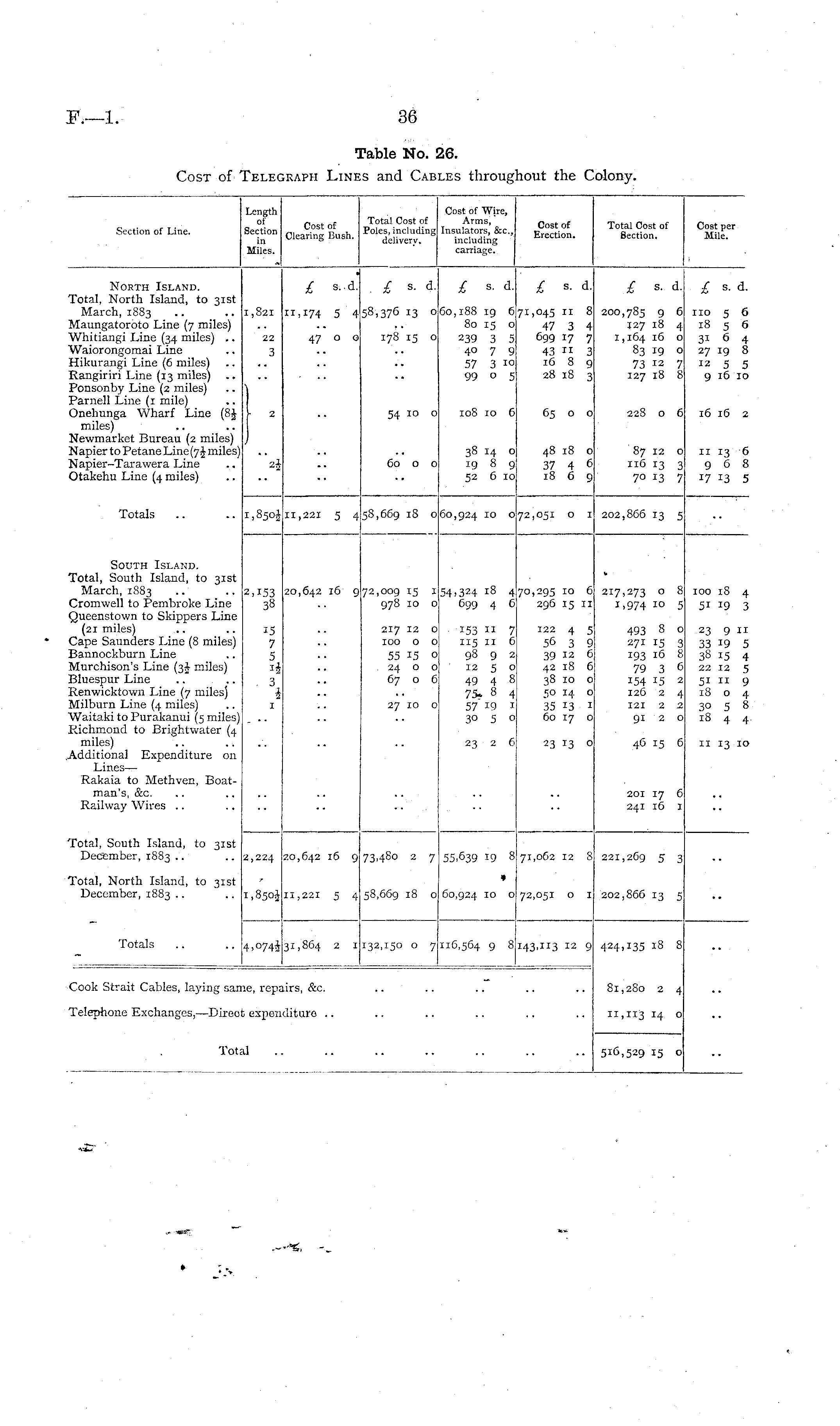 Table No. 26. Cost of Telegraph Lines and Cables throughout the Colony.