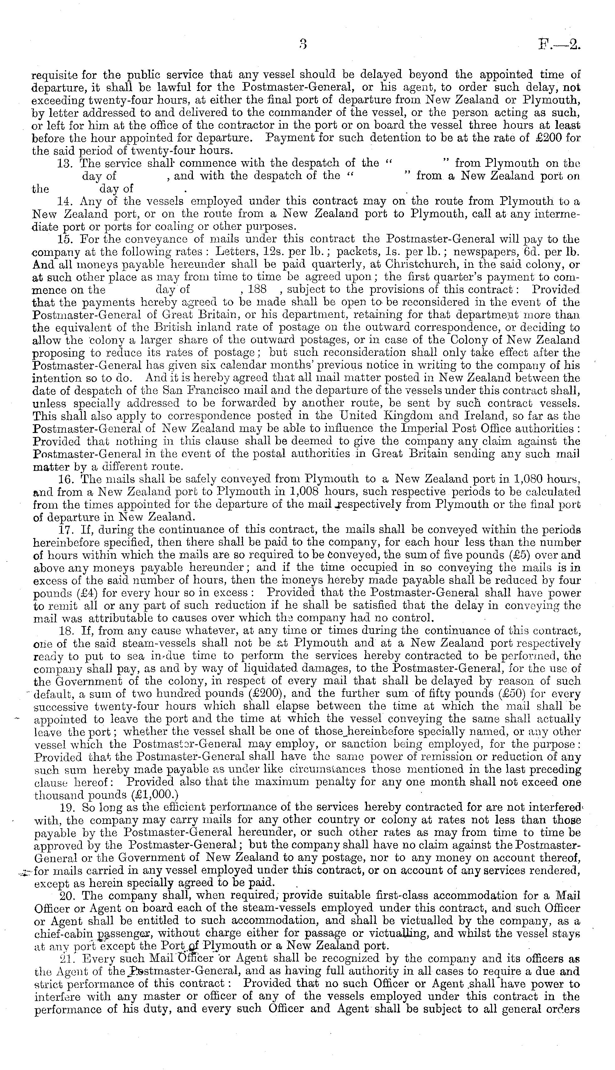 requisite for the public service that any vessel should be delayed beyond the appointed time ol departure, it shall be lawful for the Postmaster-General, or his agent, to order such delay, not exceeding twenty-four hours, at either the final port of departure from New Zealand or Plymouth, by letter addressed to and delivered to the commander of the vessel, or the person acting as such, or left for him at the office of the contractor in the port or on board the vessel three hours at least before the hour appointed for departure. Payment for such detention to be at the rate of £200 for the said period of twenty-four hours. 13. The service shall- commence with the despatch of the " " from Plymouth on the day of , and with the despatch of the " " from a New Zealand port on the day of 14. Any of the vessels employed under this contract may on the route from Plymouth to a New Zealand port, or on the route from a New Zealand port to Plymouth, call at any intermediate port or ports for coaling or other purposes. 15. For the conveyance of mails under this contract the Postmaster-General will pay to the company at the following rates : Letters, 12s. per Ib.; packets, Is. per lb.; newspapers, 6d. per lb. And all moneys payable hereunder shall be paid quarterly, at Christchurch, in the said colony, or at such other place as may from time to time be agreed upon; the first quarter's payment to commence on the day of , 188 , subject to the provisions of this contract: Provided that the payments hereby agreed to be made shall be open to be reconsidered in the event of the Postmaster-General of Great Britain, or his department, retaining for that department more than the equivalent of the British inland rate of postage on the outward correspondence, or deciding to allow the colony a larger share of the outward postages, or in case of the Colony of New Zealand proposing to reduce its rates of postage; but such reconsideration shall only take effect after the Postmaster-General has given six calendar months' previous notice in writing to the company of his intention so to do. And it is hereby agreed that all mail matter posted in New Zealand between the date of despatch of the San Francisco mail and the departure of the vessels under this contract shall, unless specially addressed to be forwarded by another route, be sent by such contract vessels. This shall also apply to correspondence posted in the United Kingdom and Ireland, so far as the Postmaster-General of New Zealand may be able to influence the Imperial Post Office authorities : Provided that nothing in this clause shall be deemed to give the company any claim against the Postmaster-General in the event of the postal authorities in Great Britain sending any such mail matter by a different route. 16. The mails shall be safely conveyed from Plymouth to a New Zealand port in 1,080 hours, and from a New Zealand port to Plymouth in 1,008 hours, such respective periods to be calculated from the times appointed for the departure of the mail .respectively from Plymouth or the final port of departure in New Zealand. 17. If, during the continuance of this contract, the mails shall be conveyed within the periods hereinbefore specified, then there shall be paid to the company, for each hour less than the number of hours within which the mails are so required to be conveyed, the sum of five pounds (£5) over and above any moneys payable hereunder; and if the time occupied in so conveying the mails is in excess of the said number of hours, then the moneys hereby made payable shall be reduced by four pounds (£4) for every hour so in excess : Provided that the Postmaster-General shall have power to remit all or any part of such reduction if he shall be satisfied that the delay in conveying the mail was attributable to causes over which thd company had no control. 18. If, from any cause whatever, at any time or times during the continuance of this contract, one of the said steam-vessels shall not be at Plymouth and at a New Zealand port respectively ready to put to sea hvdue time to perform the services hereby contracted to be performed, the company shall pay, as and by way of liquidated damages, to the Postmaster-General, for the use of the Government of the colony, in respect of every mail that shall be delayed by reason of such default, a sum of two hundred pounds (£200), and the further sum of fifty pounds (£5O) for every successive twenty-four hours which shall elapse between the time at which the mail shall be appointed to leave the port and the time at which the vessel conveying the same shall actually leave the port; whether the vessel shall be one of thosejiereinbefore specially named, or any other vessel which the Postmastor-General may employ, or sanction being employed, for the purpose : Provided that the Postmaster-General shall have the same power of remission or reduction of any such sum hereby made payable as under like circumstances those mentioned in the last preceding clause hereof: Provided also that the maximum penalty for any one month shall not exceed one thousand pounds (£1,000.) 19. So long as the efficient performance of the services hereby contracted for are not interfered with, the company may carry mails for any other country or colony at rates not less than those payable by the Postmaster-General hereunder, or such other rates as may from time to time be approved by the Postmaster-General; but the company shall have no claim against the PostmasterGeneral or the Government of New Zealand to any postage, nor to any money on account thereof, for mails carried in any vessel employed under this contract, or on account of any services rendered, except as herein specially agreed to be paid. 20. The company shall, when required, provide suitable first-class accommodation for a Mail Officer or Agent on board each of the steam-vessels employed under this contract, and such Officer or Agent shall be entitled to such accommodation, and shall